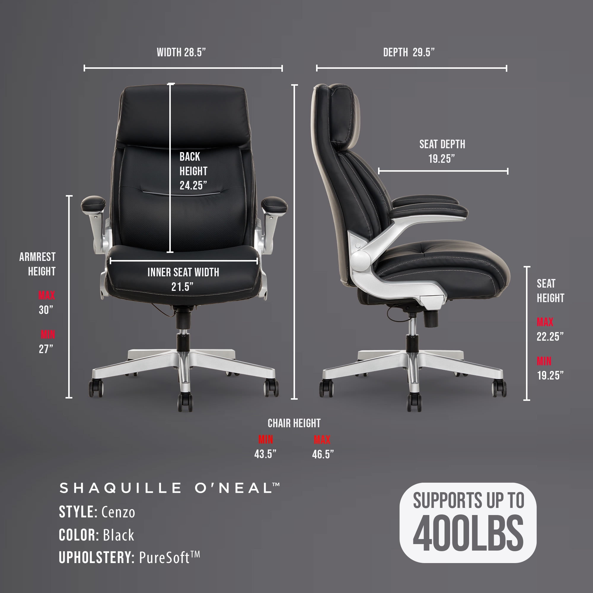 Shaquille O’Neal Cenzo Ergonomic Big and Tall Office Chair ,Flip-Up Arms PureSoft Upholstery High-Back Desk Chair with 400 lb Capacity, Black