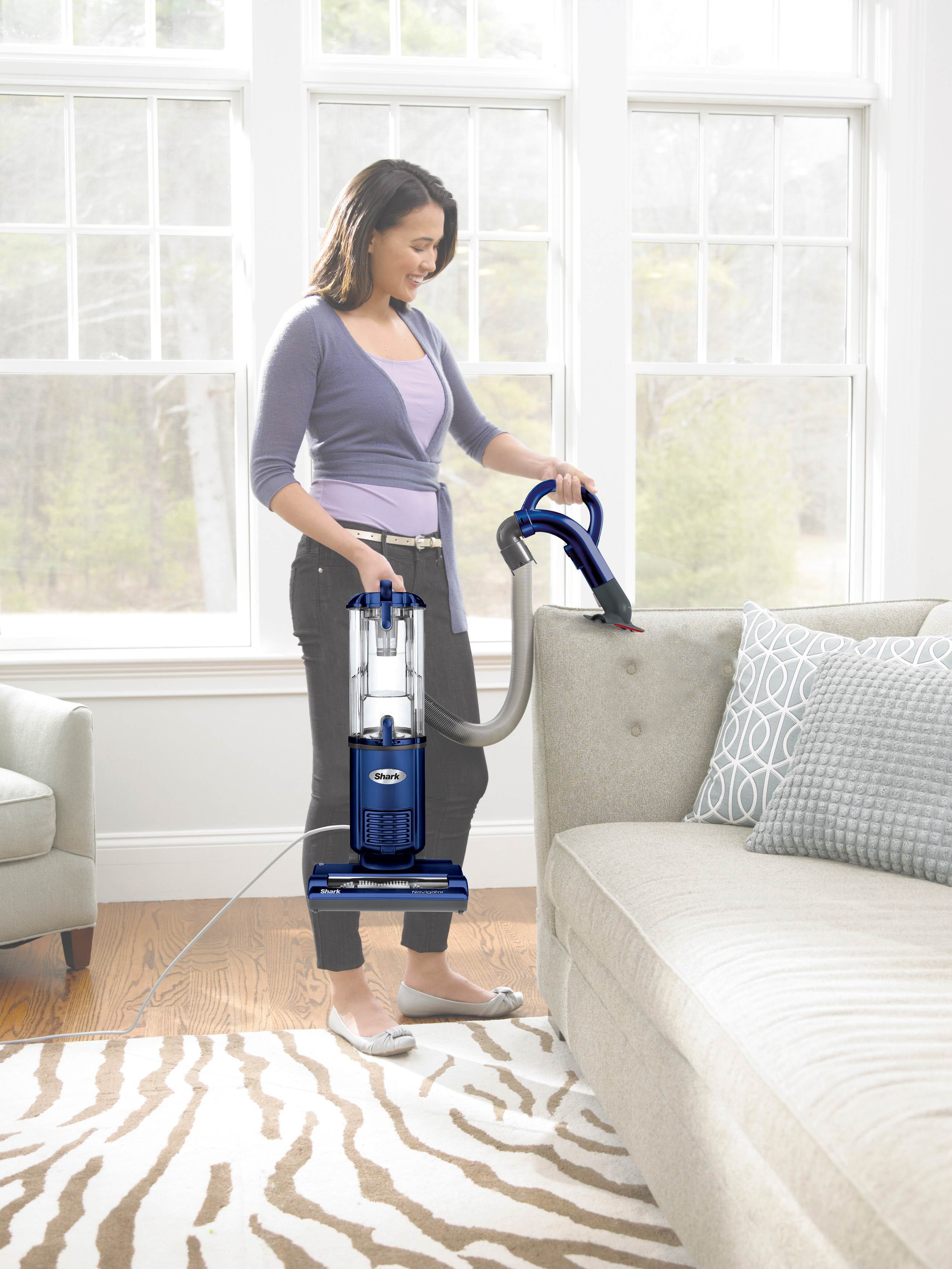 The Shark Navigator Light Upright Vacuum features swivel steering for excellent control when maneuvering around furniture. It has a large-capacity dust cup and a brush roll shutoff for hard-floor cleaning. The extra-long wand and hose provide extended reach for versatile above-floor cleaning. This upright vacuum never loses suction and is lightweight and easy to maneuver at only 10.6 pounds, giving it a space-friendly design. The smallest of the Navigator lineup, the Navigator Light is compact and easy to store while providing the cleaning performance of a full sized upright vacuum. Deep clean carpets and experience superior bare floor cleaning with the Navigator power nozzle, which is a 2-motor system that provides optimized settings for both carpets and bare floors. Convenient tools that live onboard the vacuum include the pet upholstery brush and combination dusting/crevice tool, providing versatile cleaning throughout the home and beyond.