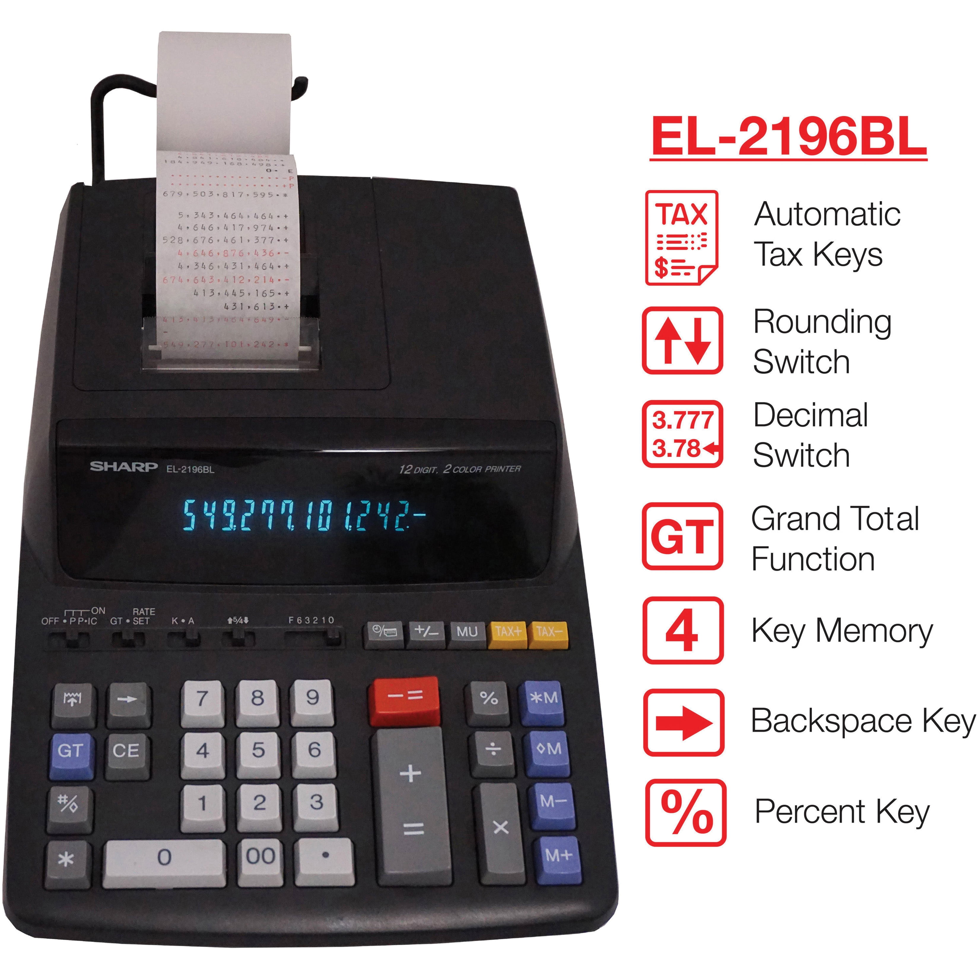 Sharp EL-2196BL 12-Digit Printing Calculator with 4-Key Memory, Heavy Duty, Item Count, Black, 1 Count