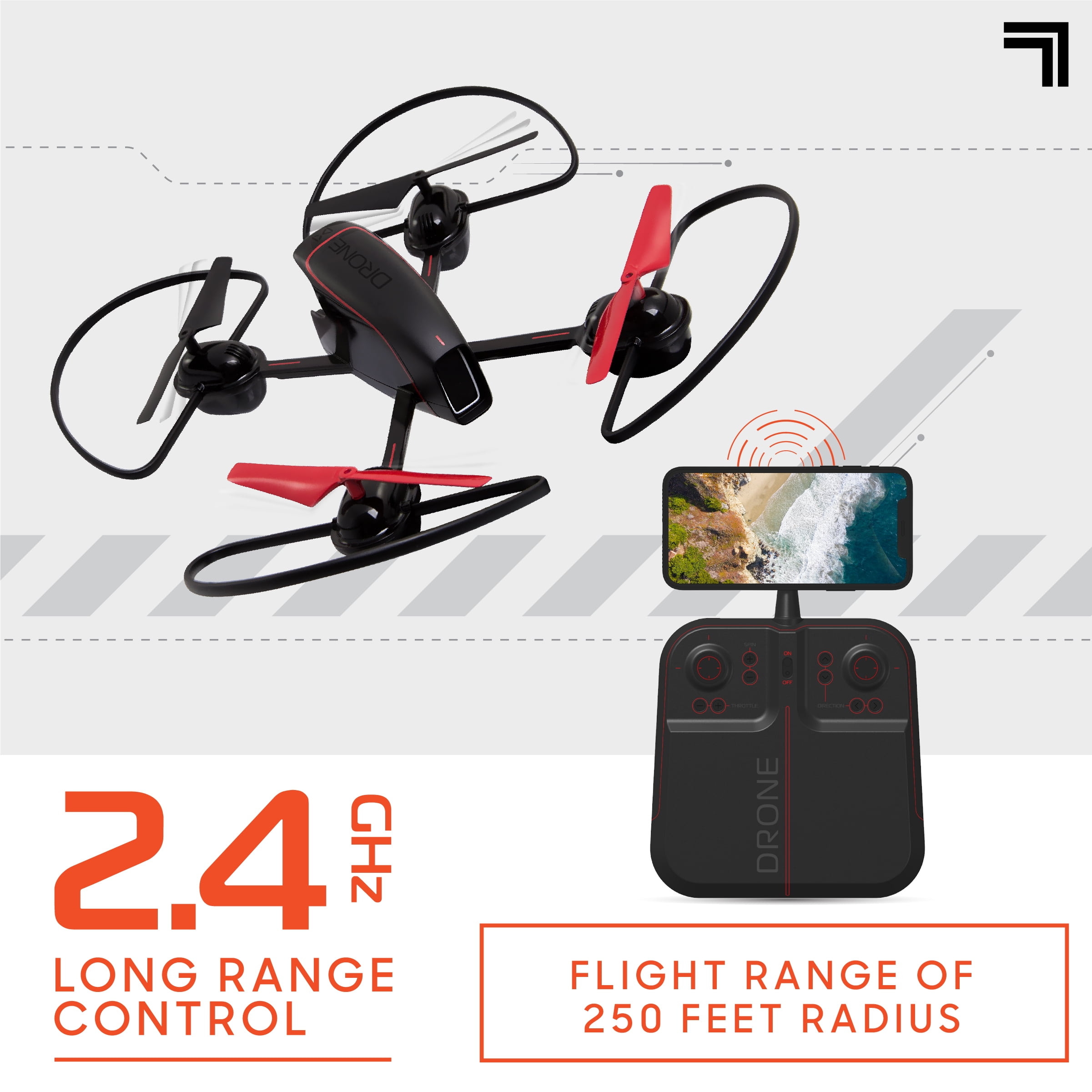 Video streaming drone Auto-orientation flight control 6-axis gyro stabilization Assisted landing feature Model: 1012254 250-foot flight radius