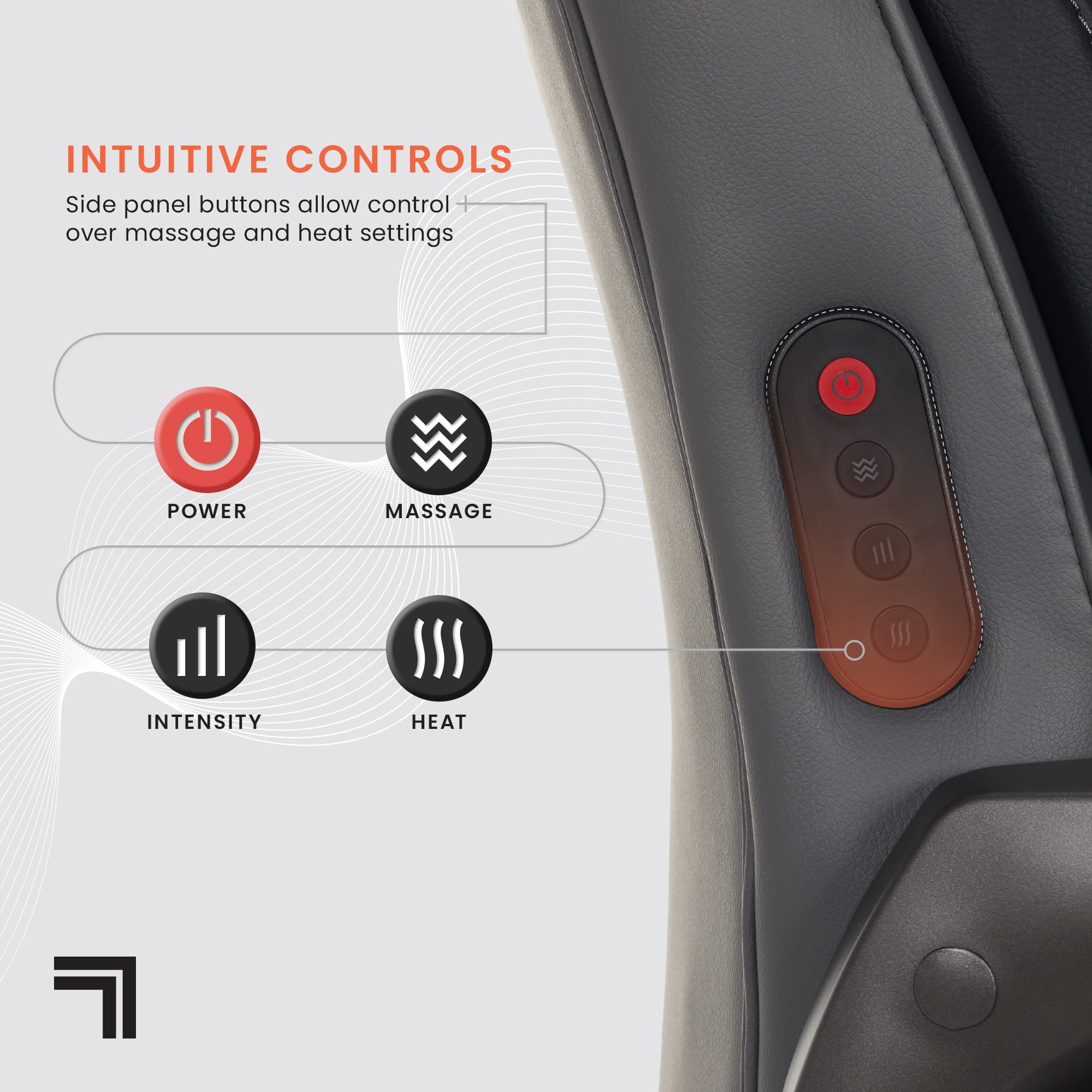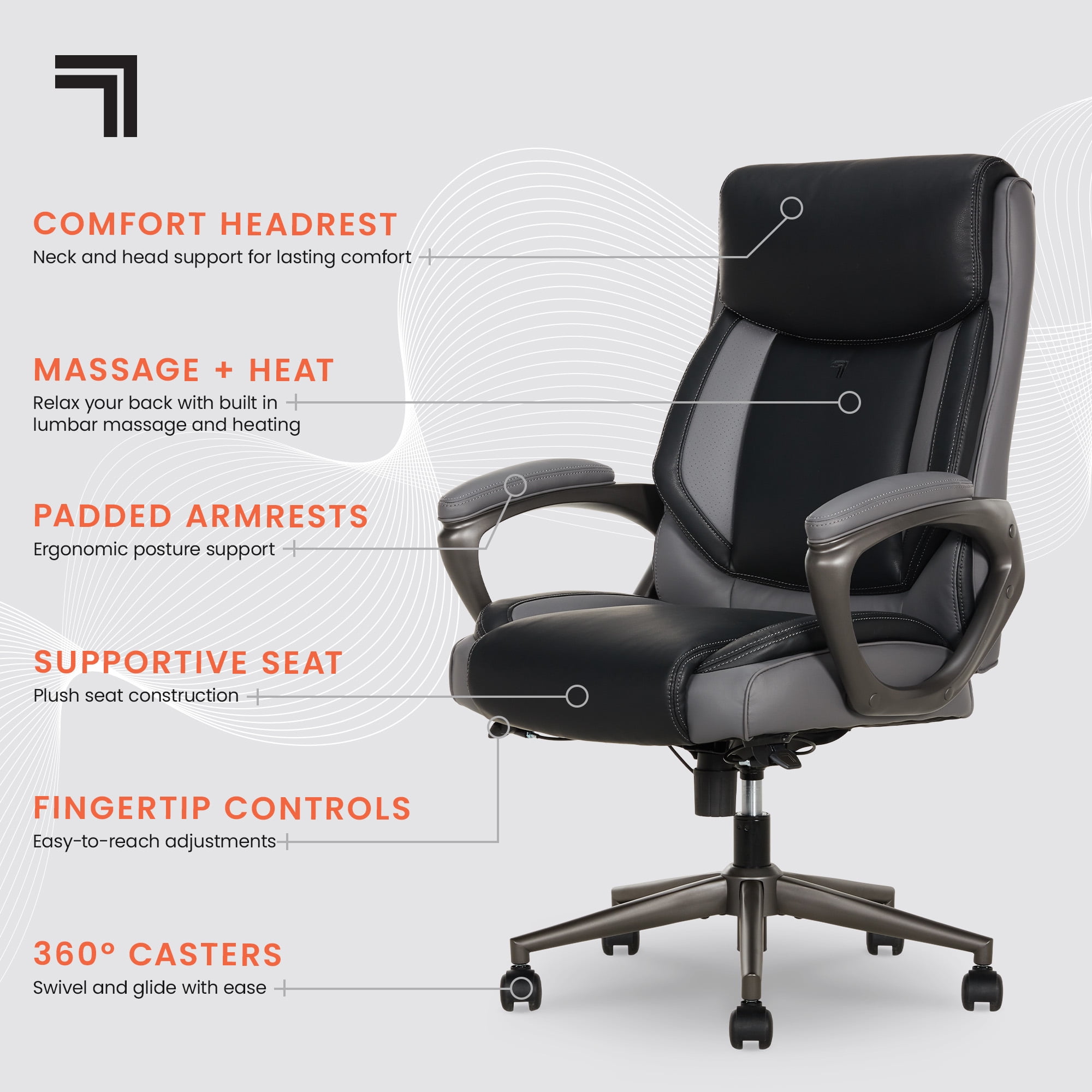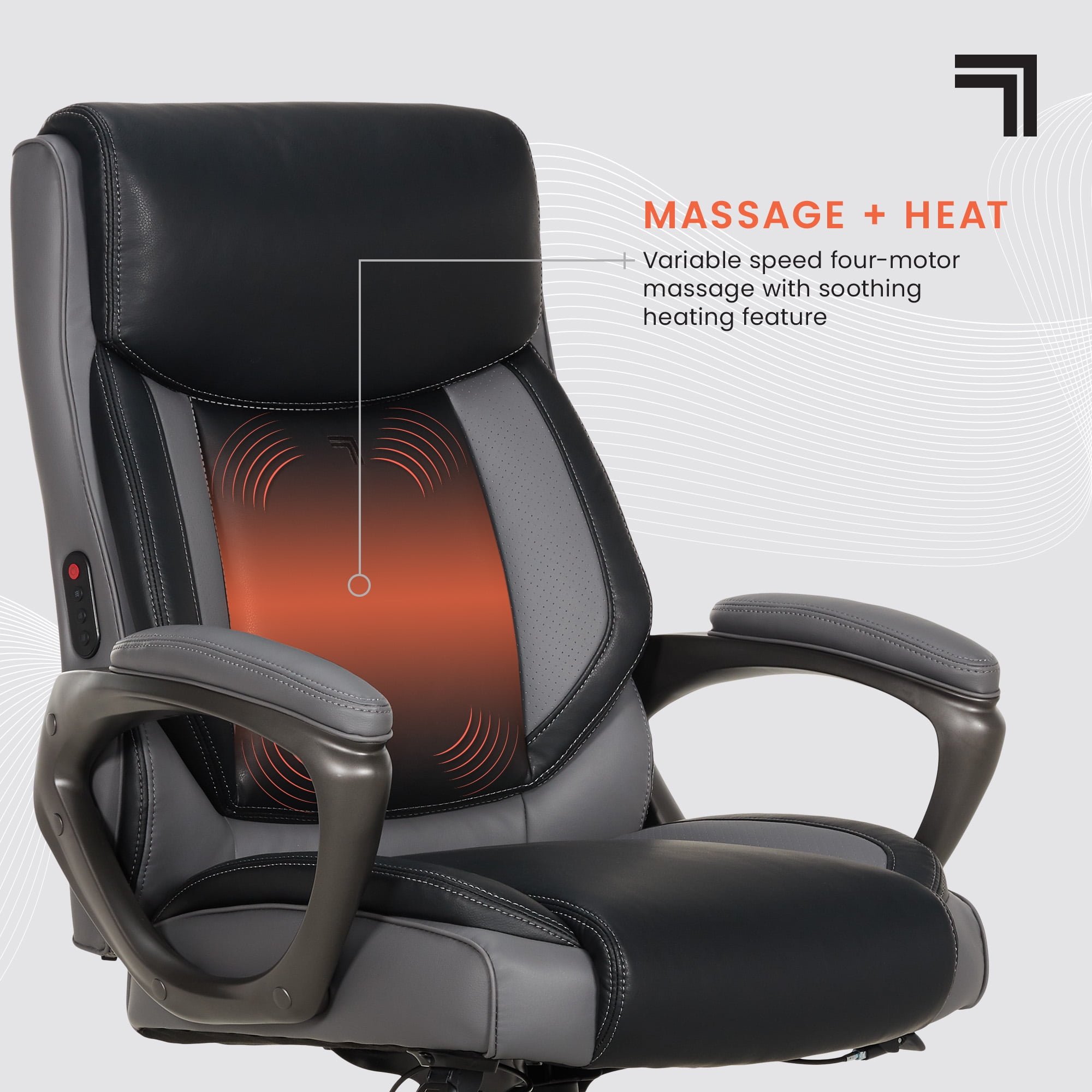 Full-body support with a plush headrest, contoured bolstered backrest, and padded armrests. Built-in, 4-motor lumbar massage with heating and intuitive controls for soothing comfort. Soft-feel, quality upholstery that is easy to spot clean Plush seat construction with ComfortCoils™ for additional custom comfort Easy-to-reach fingertip control height adjustments Recline the backrest and customize your comfort with the twist tension knob Durable design that safely supports 275 lbs. Nylon base with 360° swivel casters glide with ease Casters are intended for use on carpets and are not recommended for use on tile or hardwood floors. Easy to assemble. No additional tools are needed for assembly. Endorsed by the American Chiropractic Association This product uses FSC® certified plywood and packaging made from recycled materials. This product meets BIFMA industry standards for safety, quality, and durability. GREENGUARD certified meeting rigorous third-party chemical emissions standards, reducing indoor air pollution and the risk of chemical exposure.