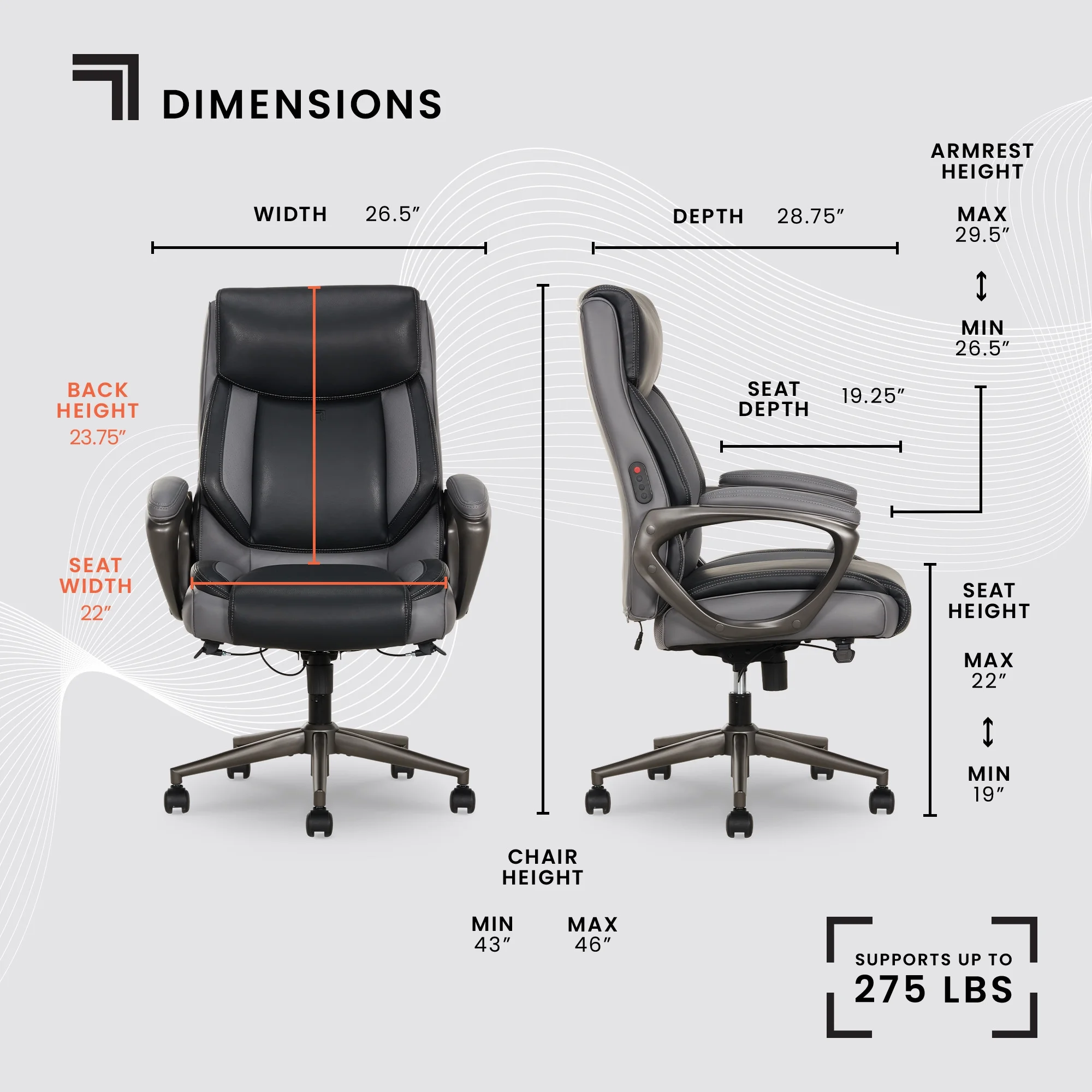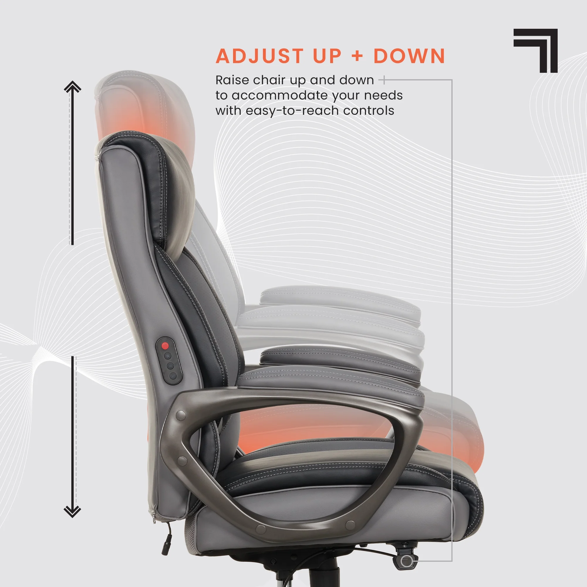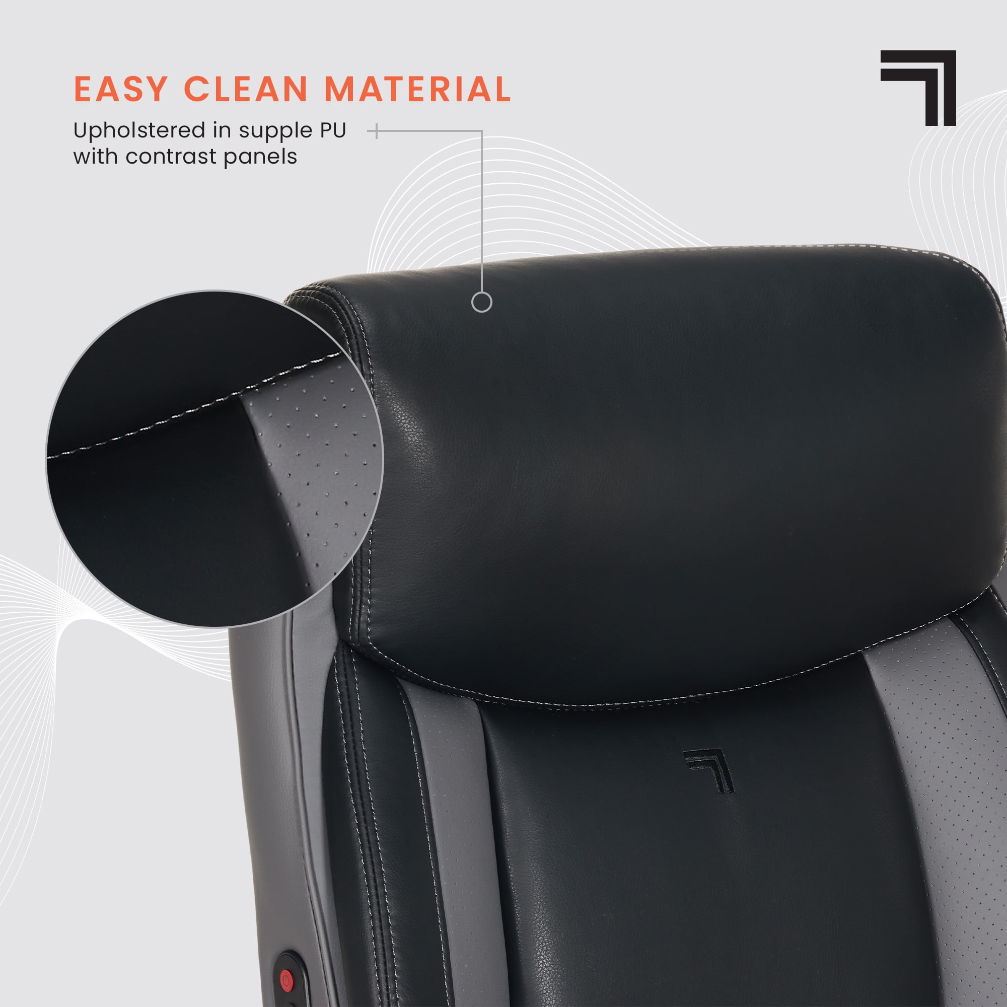 Full-body support with a plush headrest, contoured bolstered backrest, and padded armrests. Built-in, 4-motor lumbar massage with heating and intuitive controls for soothing comfort. Soft-feel, quality upholstery that is easy to spot clean Plush seat construction with ComfortCoils™ for additional custom comfort Easy-to-reach fingertip control height adjustments Recline the backrest and customize your comfort with the twist tension knob Durable design that safely supports 275 lbs. Nylon base with 360° swivel casters glide with ease Casters are intended for use on carpets and are not recommended for use on tile or hardwood floors. Easy to assemble. No additional tools are needed for assembly. Endorsed by the American Chiropractic Association This product uses FSC® certified plywood and packaging made from recycled materials. This product meets BIFMA industry standards for safety, quality, and durability. GREENGUARD certified meeting rigorous third-party chemical emissions standards, reducing indoor air pollution and the risk of chemical exposure.