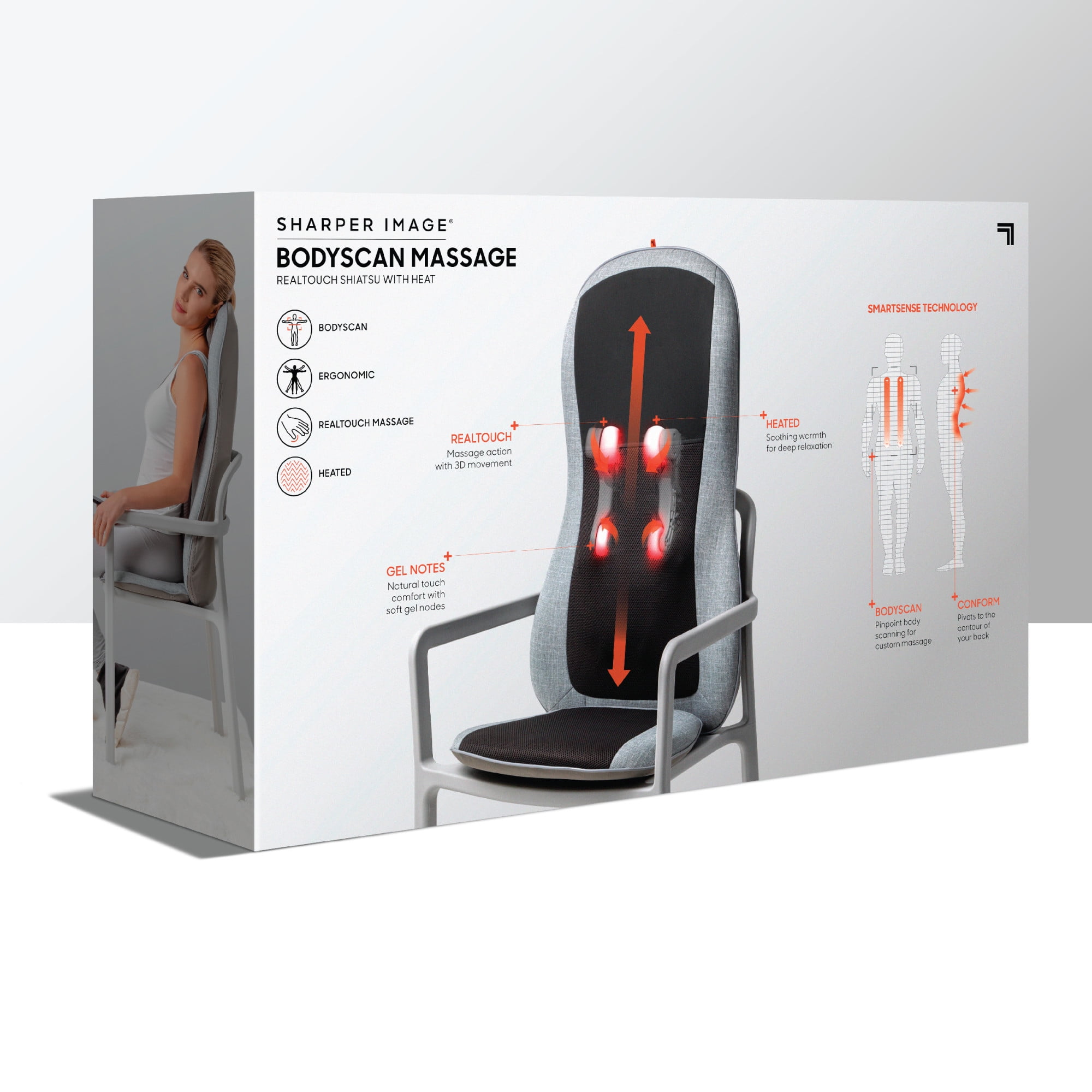 Sharper Image® Realtouch Chair Pad uses smartsense technology to accurately pinpoint your pressure points and deliver a custom massage The four gel nodes are flexible and naturally roll across your back. They are enhanced with Realtouch to simulate the feeling of actual fingers to deliver an authentic shiatsu massage experience. An optional heat setting relaxes your body muscles after a long day, allowing you to sink deeper into the massage and come out fully refreshed.