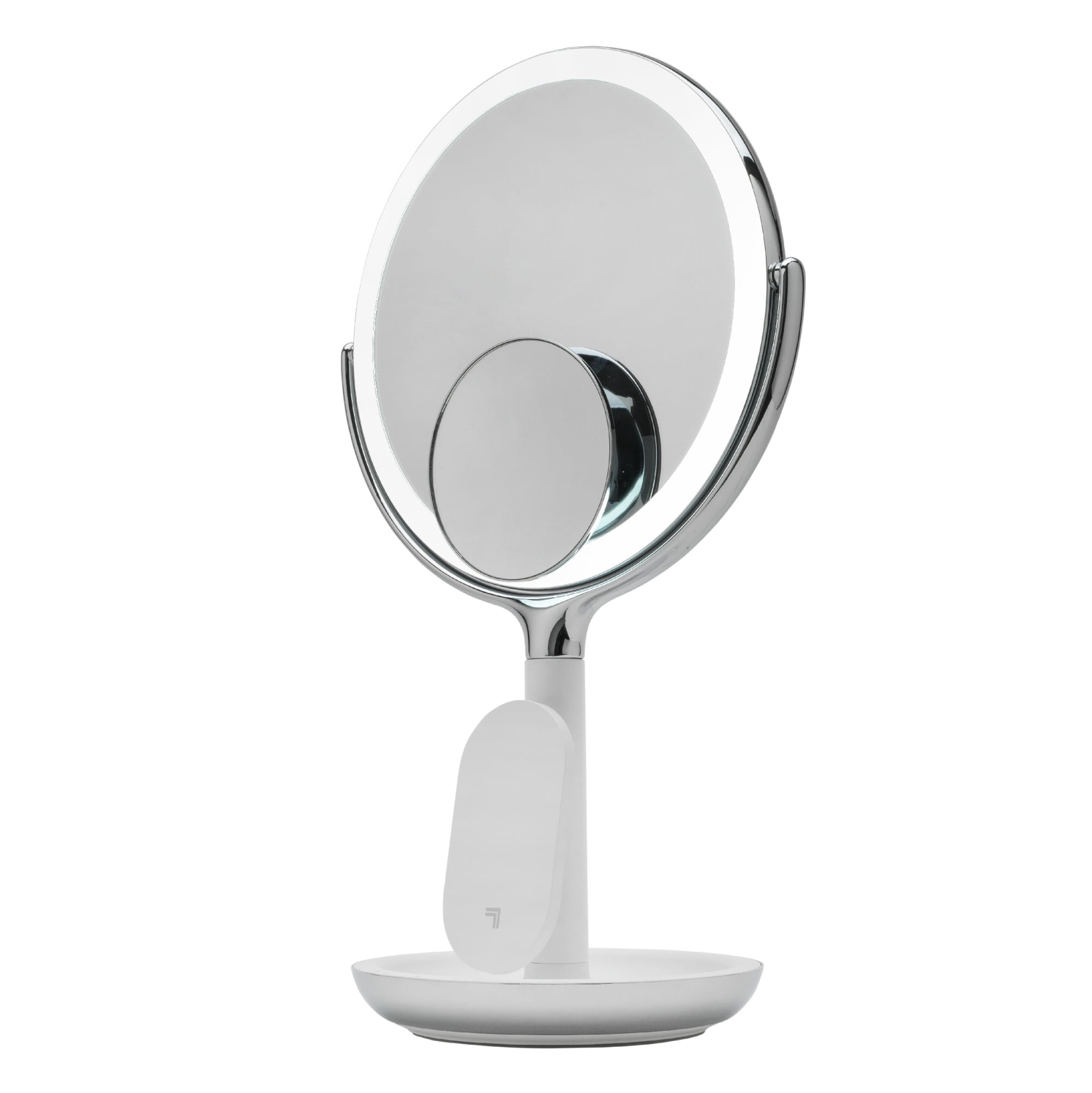 Power adapter cord included Adjust brightness of LED lights halo Includes 5X and 10X magnification Organize with the catchall storage base Mirror tilts and swivels Contemporary design Model: 1015505