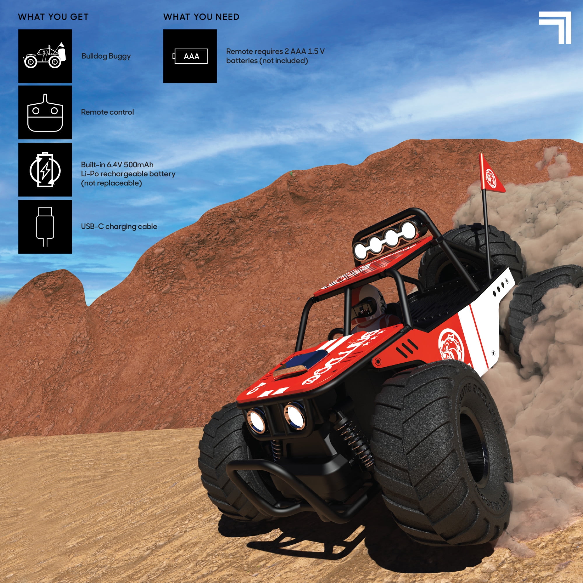 All-terrain bulldog buggy Built-in LED lights Race for up to 15 minutes per charge and power up in just 90 minutes 2.4 GHz long range controller Contemporary design Great for children ages 5-7 Model: 1015441