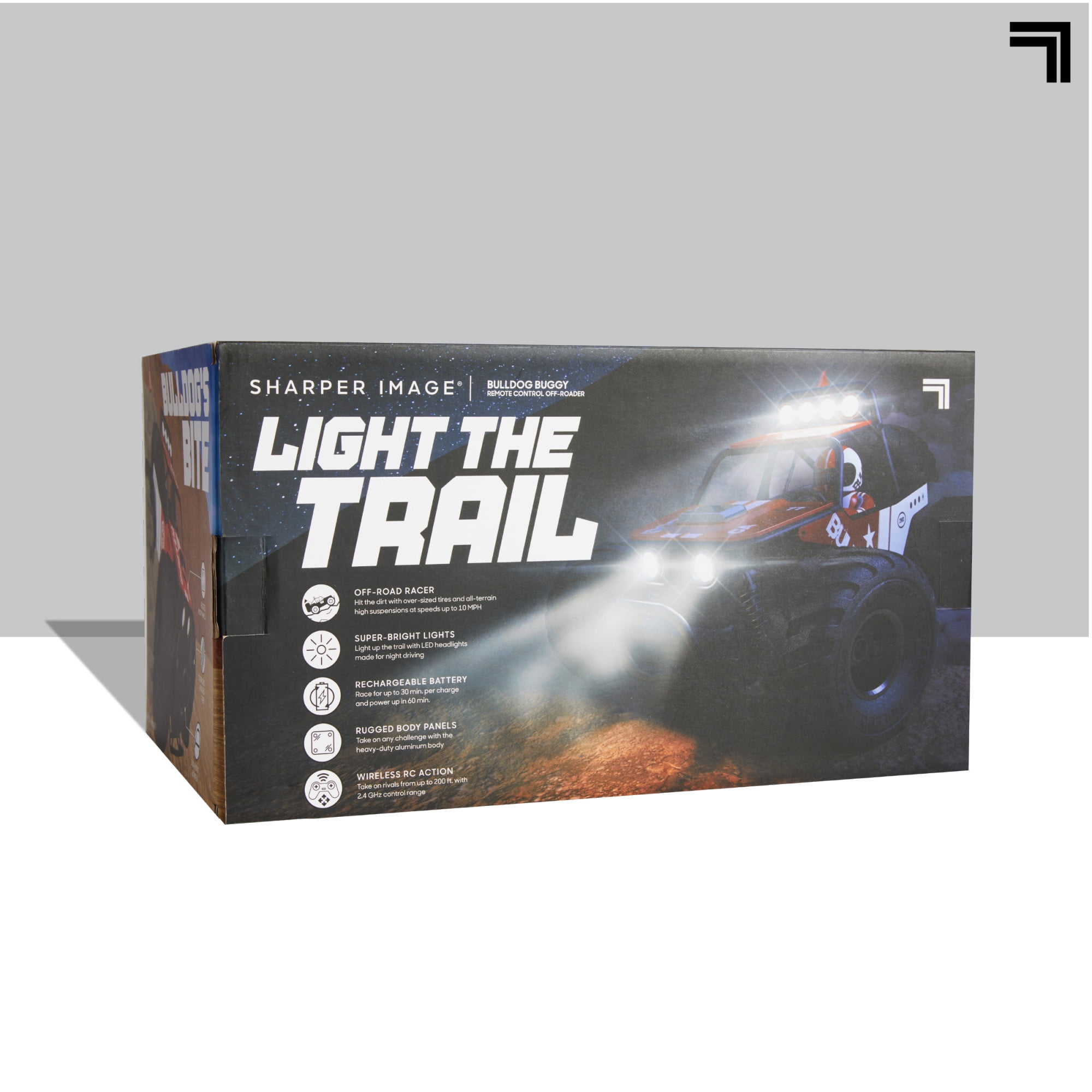 The Bulldog Buggy features over-sized tires and all-terrain high suspension to hit the dirt at speeds up to 5 MPH. The wireless 2.4 GHz remote control allows you to conquer the pavement with up to 100 feet of range. Featuring a chassis built to resist impact and a high strength shock absorbing system, the Bulldog is designed to conquer any terrain with its heavy-duty body. Illuminate the rugged road ahead with 4 super bright LED floodlights mounted to the roof of the buggy. The LEDs are bright enough to light up the road for an evening drive in the pitch-black darkness of night. Recommended for children 6+.