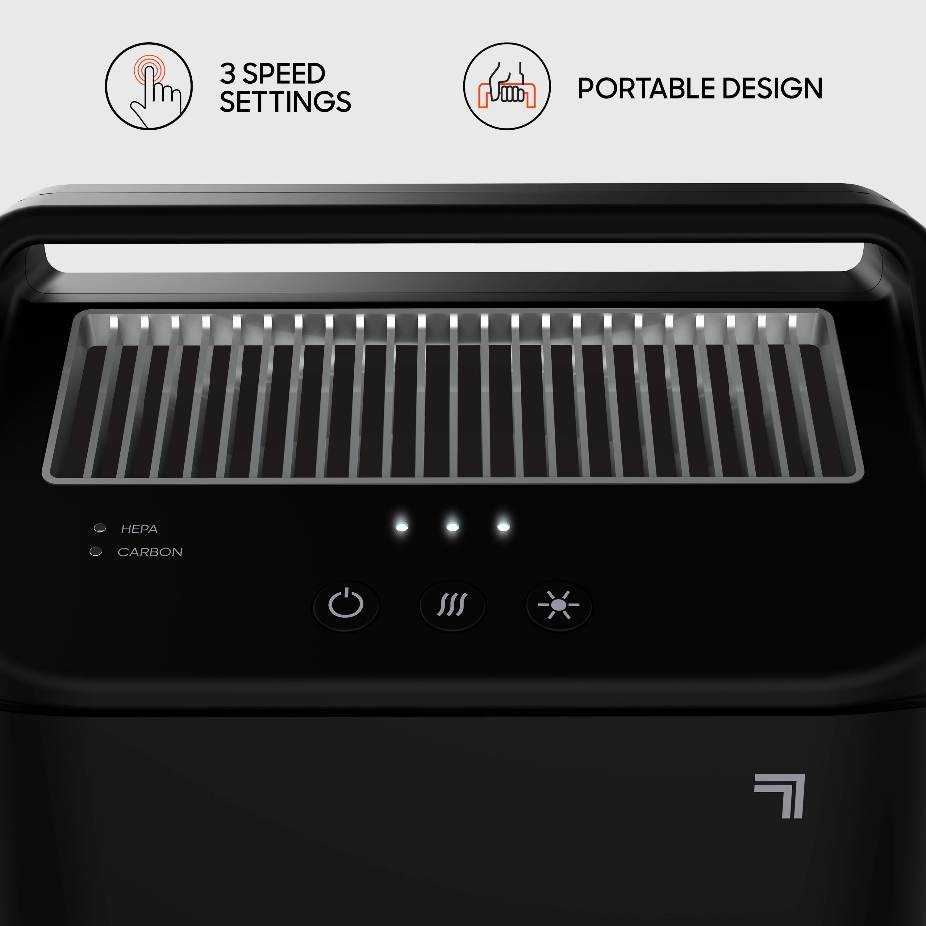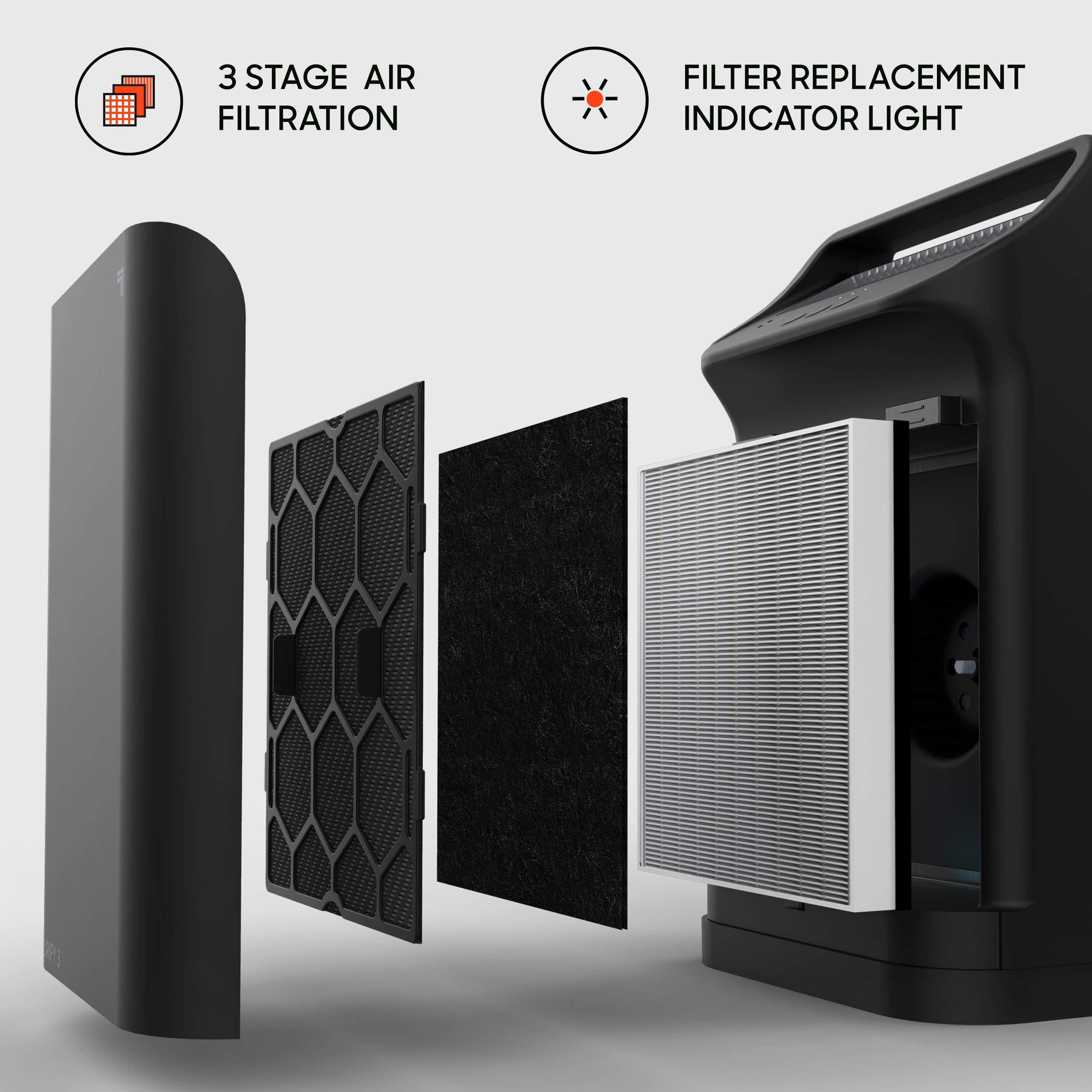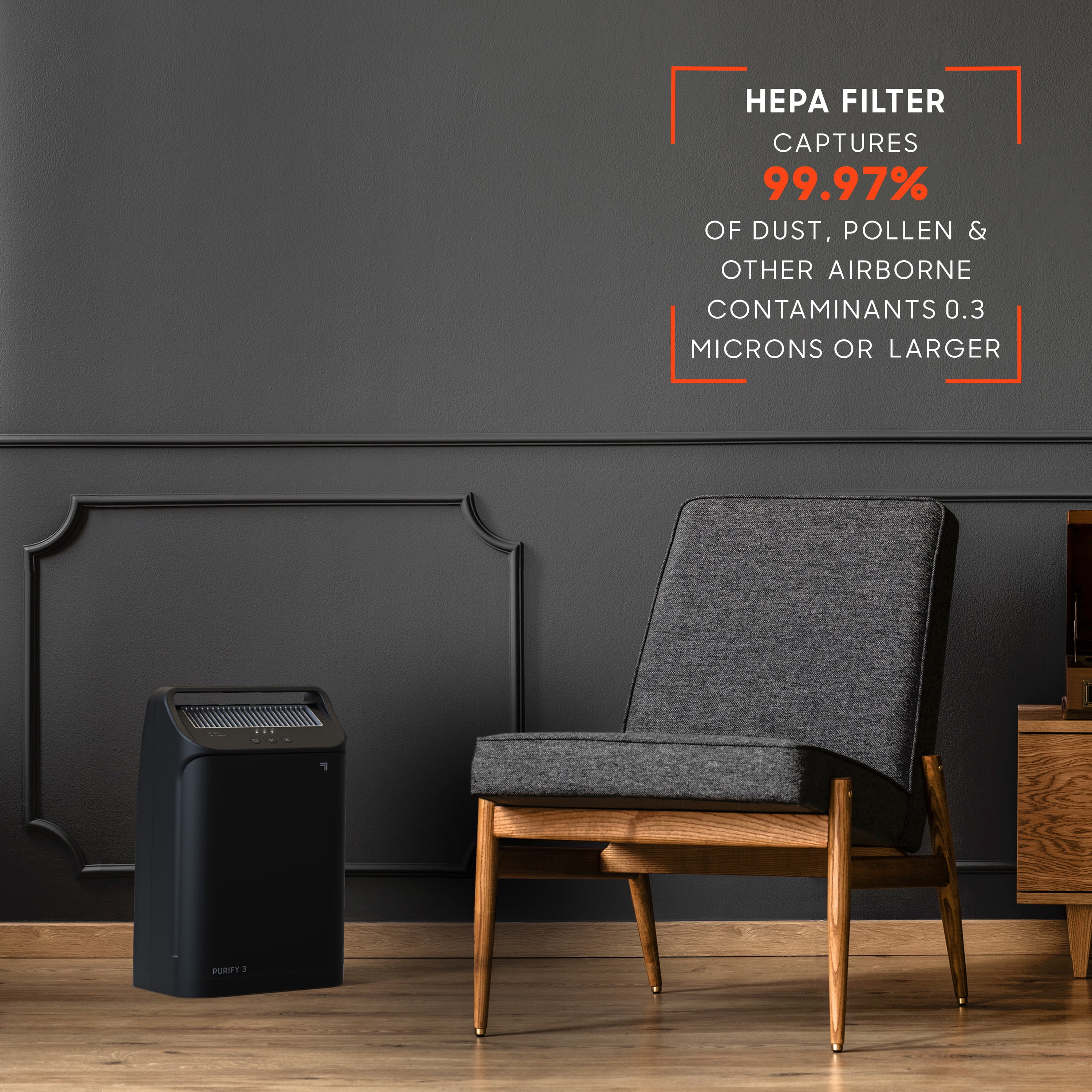 The all new PURIFY 3 uses True HEPA filtration to capture 99.97% of airborne particles – including ultra-fine particles down to 0.3 microns in diameter. The LED filter indicators, 3 Speed Settings and Electronic Controls make comfort effortless. In addition to the True HEPA filtration, the Activated Carbon Filter traps odors and a range VOC’s – delivering clean, fresh air into homes. The Portable Design handle makes the PURIFY 3 easy to move throughout the home and great fit for any room and every sense of style. PURIFY 3 brings its own kind of clever convenience and versatility. Effectively filter out 99.97% of airborne pollutants up to 0.3 microns. This includes bacteria, smoke, mold spores, and pet dander. The Pre-Filter purifies the air from larger particles. The True HEPA Filter effectively filters the allergens, and the Activated Carbon Filter captures odors and prolongs HEPA Filter life.