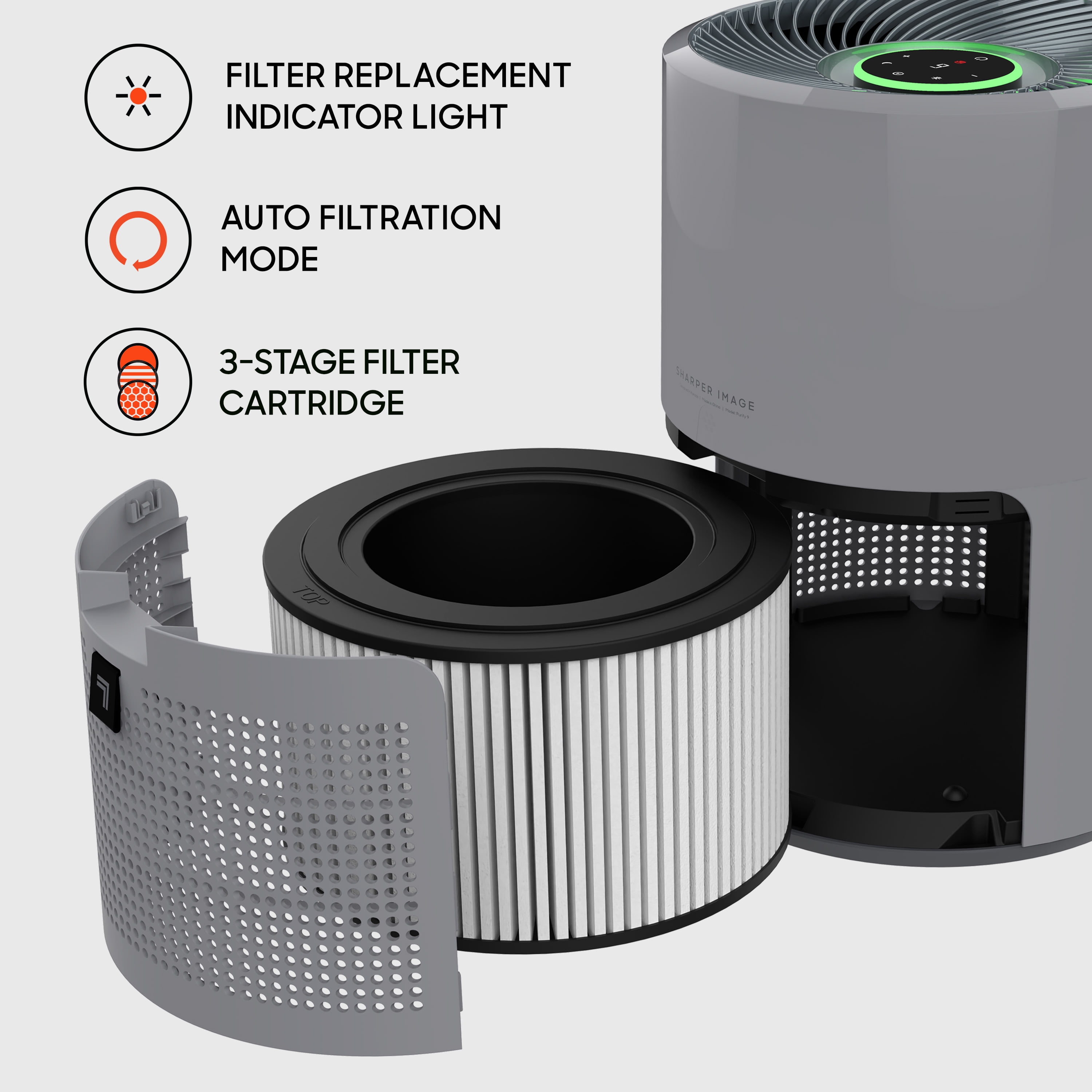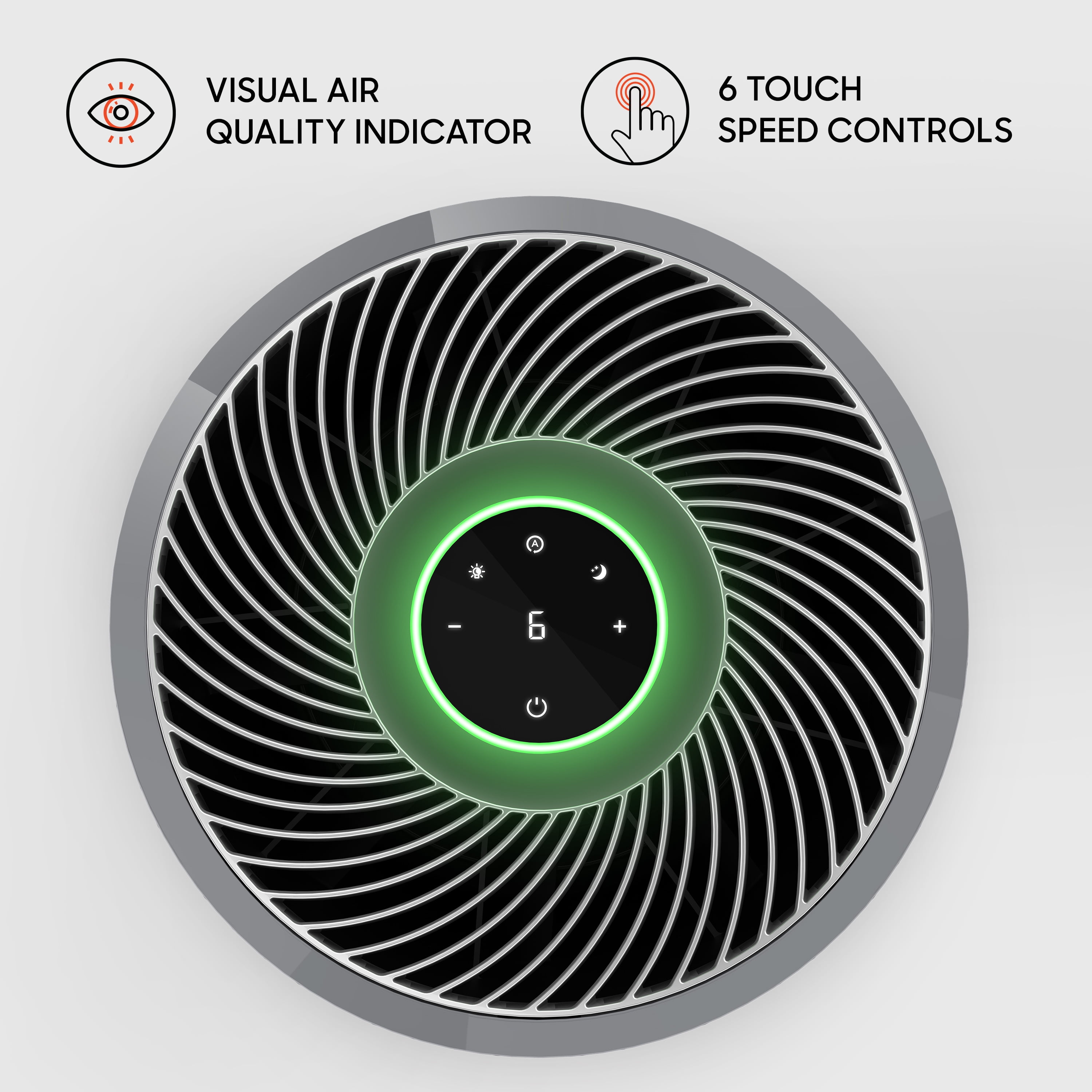 350 sq. Ft. Coverage Quiet night mode Filter replacement indicator Visual air quality indicator Bedtime light reducer 6 speed touch controls 3 stage air filtration Auto filtration mode Compatible filter: MD1-0046