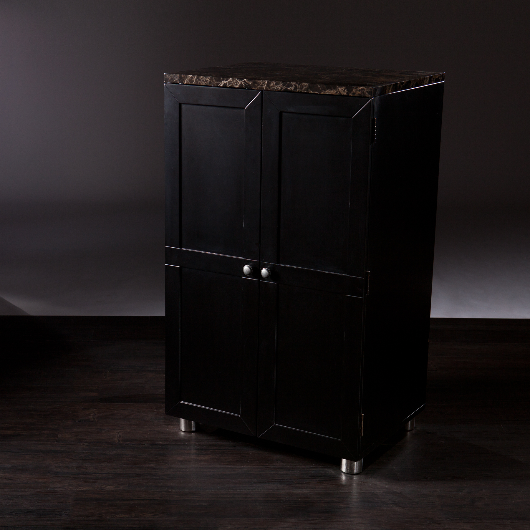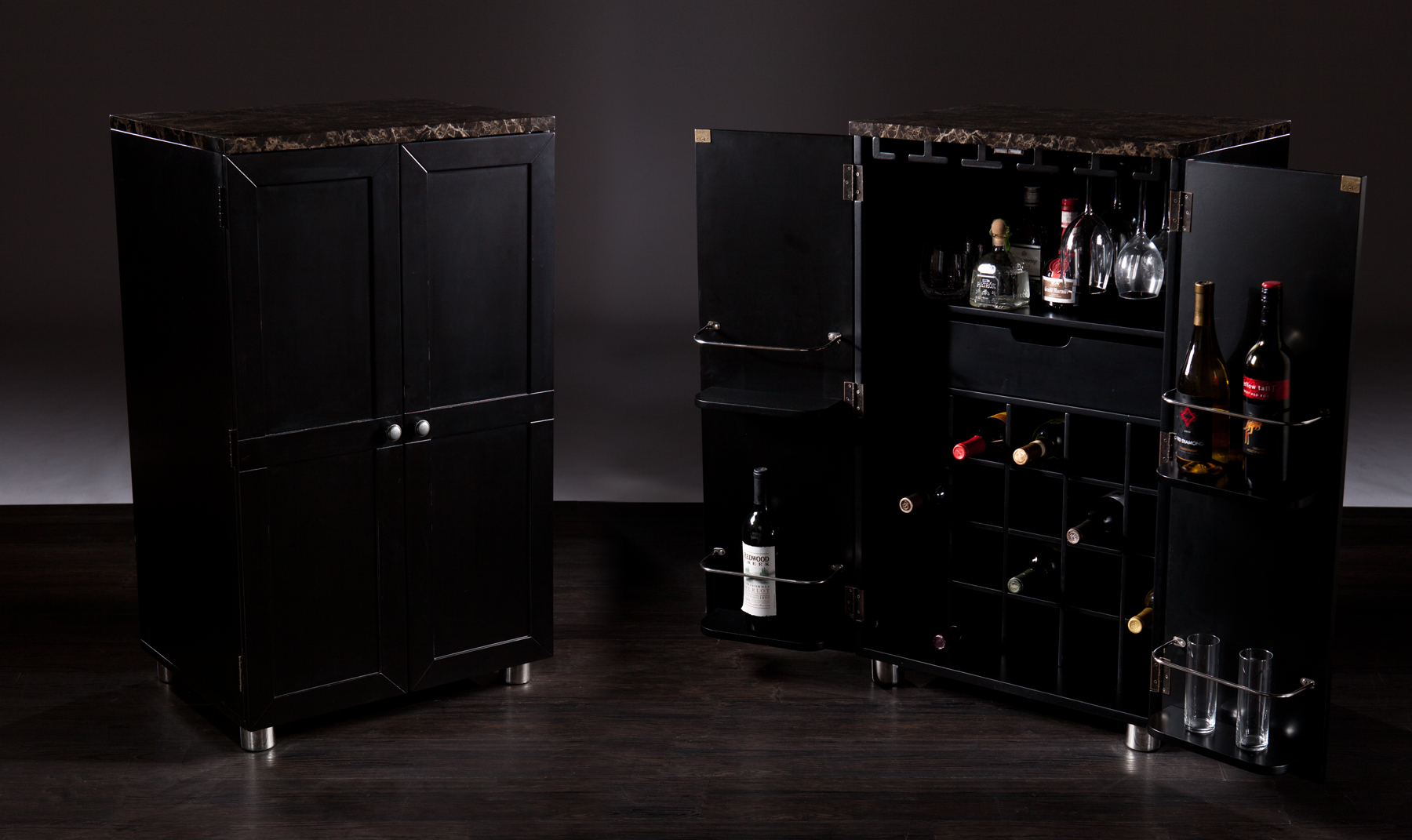 Sheena Contemporary Bar Cabinet, Black: Marbleized countertop for elegant style Accommodates up to 20 wine bottles Space-saving design Sophisticated brushed nickel and stainless steel hardware Painted black finish Includes 1 drawer, 1 fixed shelf, 5 stemware racks, and 4 door shelves Assembly required Dimensions: 24″ W x 18″ D x 40″ H Supports up to: 30 lbs (top), 10 lbs (per door), 40 lbs (inside) Materials: MDF, faux marble, stainless steel, and brushed nickel hardware The kitchen bar cabinet includes 2 brackets and plastic chains for securing to the wall Model# WM984469