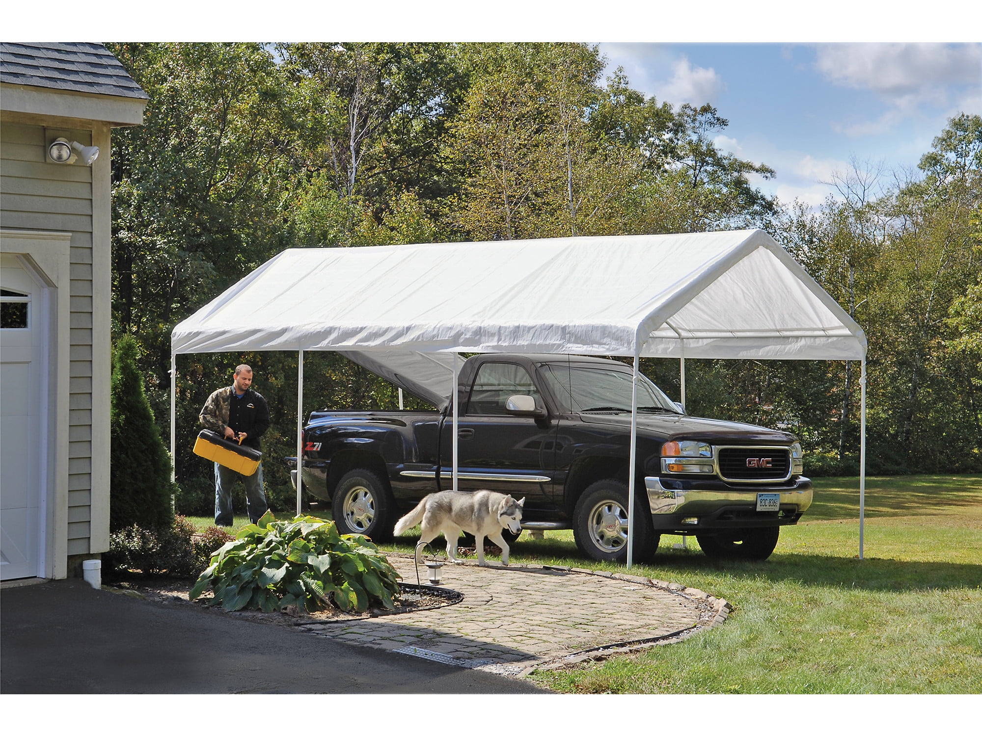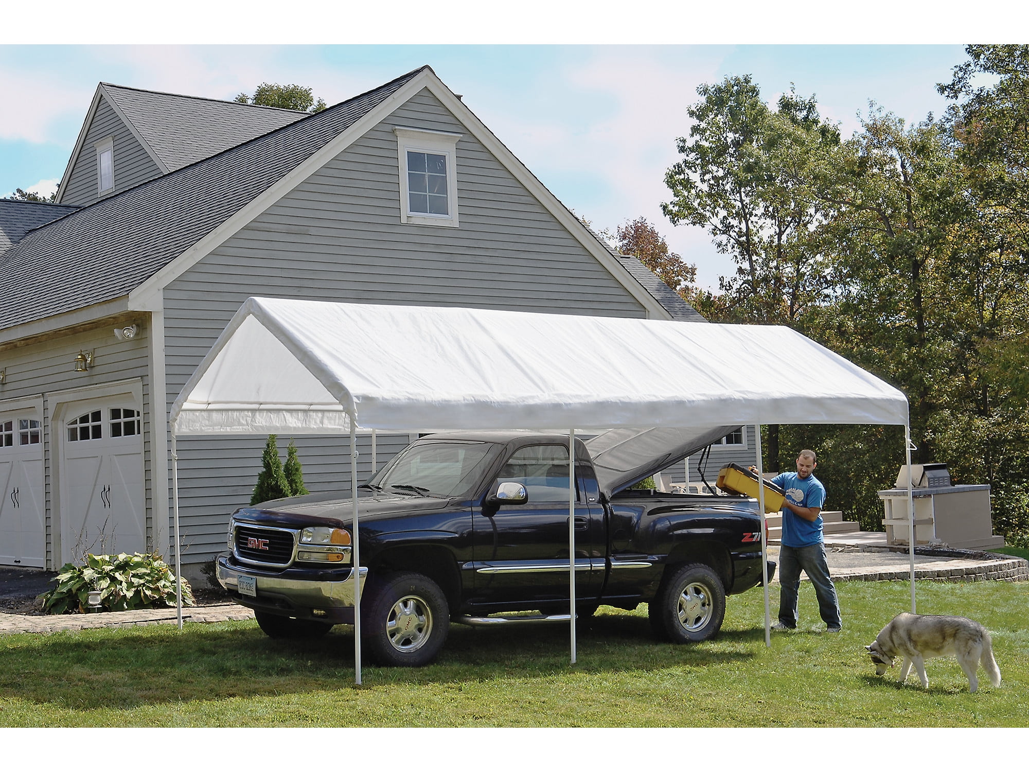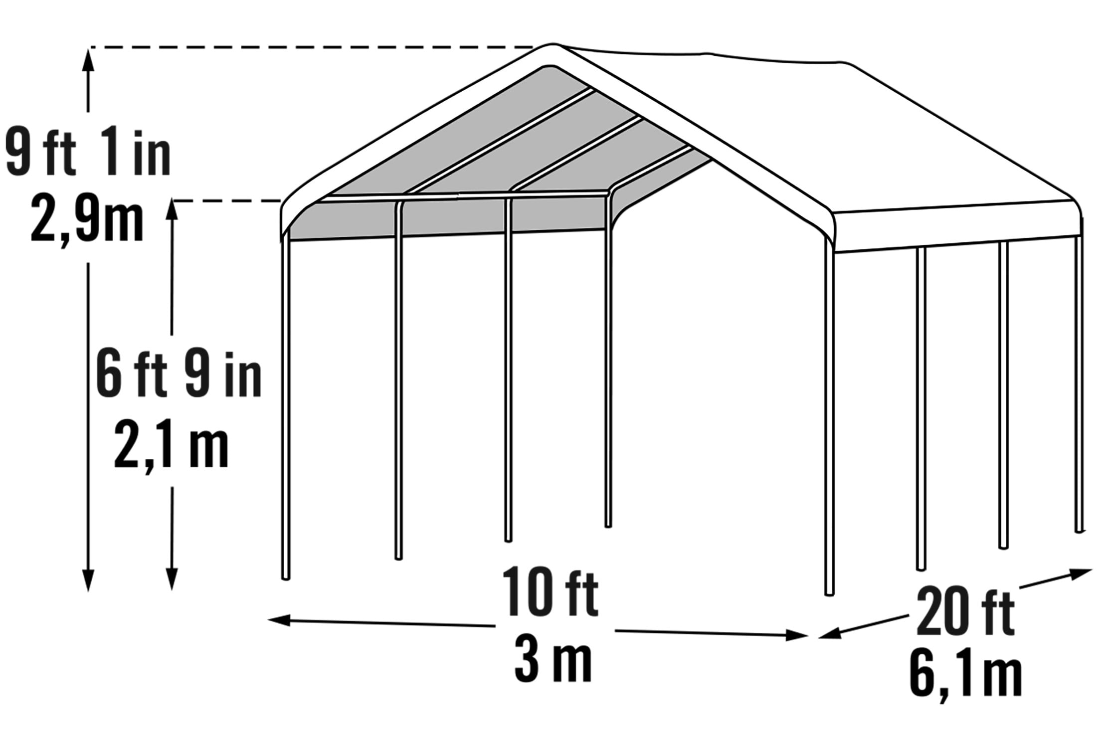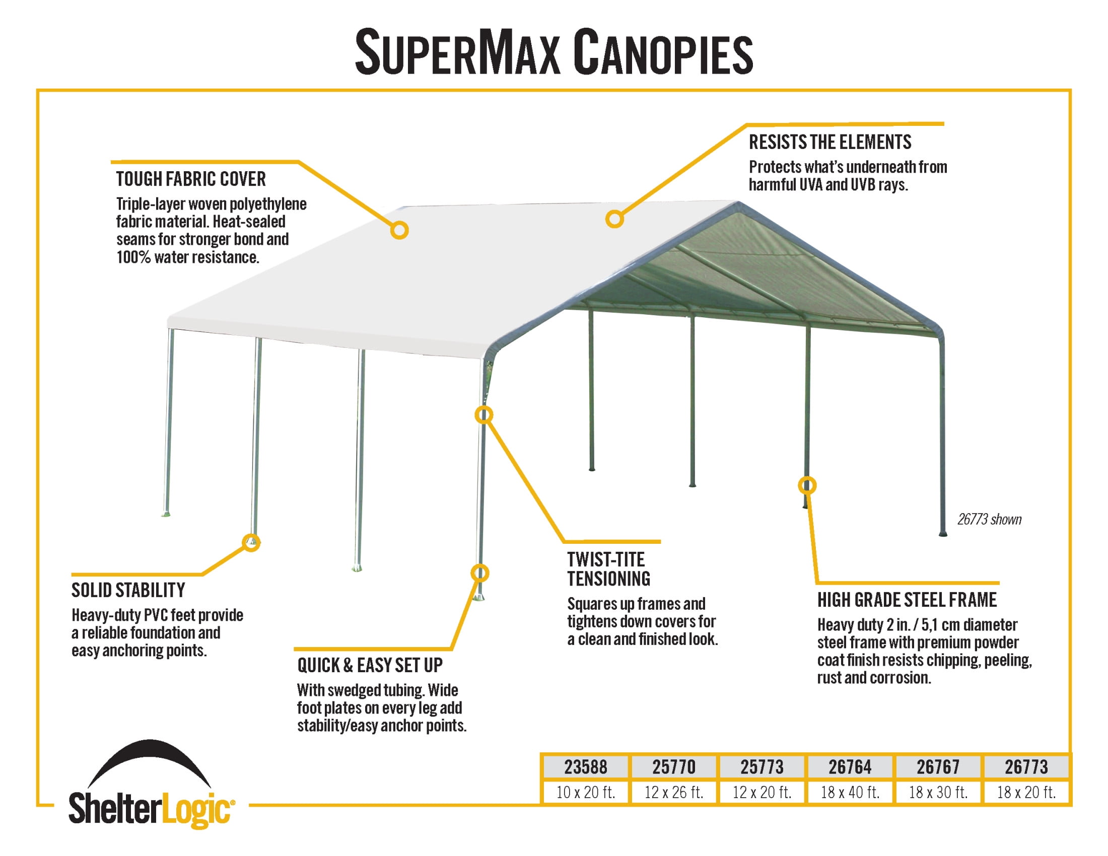 The ShelterLogic Super Max eight-leg canopy is great for any seasonal shade occasion including vehicle or boat shade, backyard, events, camping, commercial job sites, picnic areas, lawn and garden equipment storage, pool or patio cover and much more. Features Easy-to-install swedged frame is constructed of heavy duty 2 in diameter steel Premium powder coat finish protects frame from corrosion and rust Ripstop, UV treated polyethylene fabric cover is 100% waterproof and heat welded, not sewn Patented Twist-Tite tensioning squares up the frame and tightens down cover Cover and walls attach with bungee fasteners Wide foot plates on every leg add stability and easy access to secure anchor points 50+ UPF Sun Protection blocking 98% of harmful UV rays Manufacturer recommends one anchor per legSpecifications Color: White Style: Peak Size: 9.5 x 10 x 20 ft. Frame Color: White Assembly Required: Yes Rib Tubing Diameter: 1.97 in. Number of Frame Legs: 8 Size: 10 x 20 ft. Weight: 200 lbs – SKU: SHLTL2118