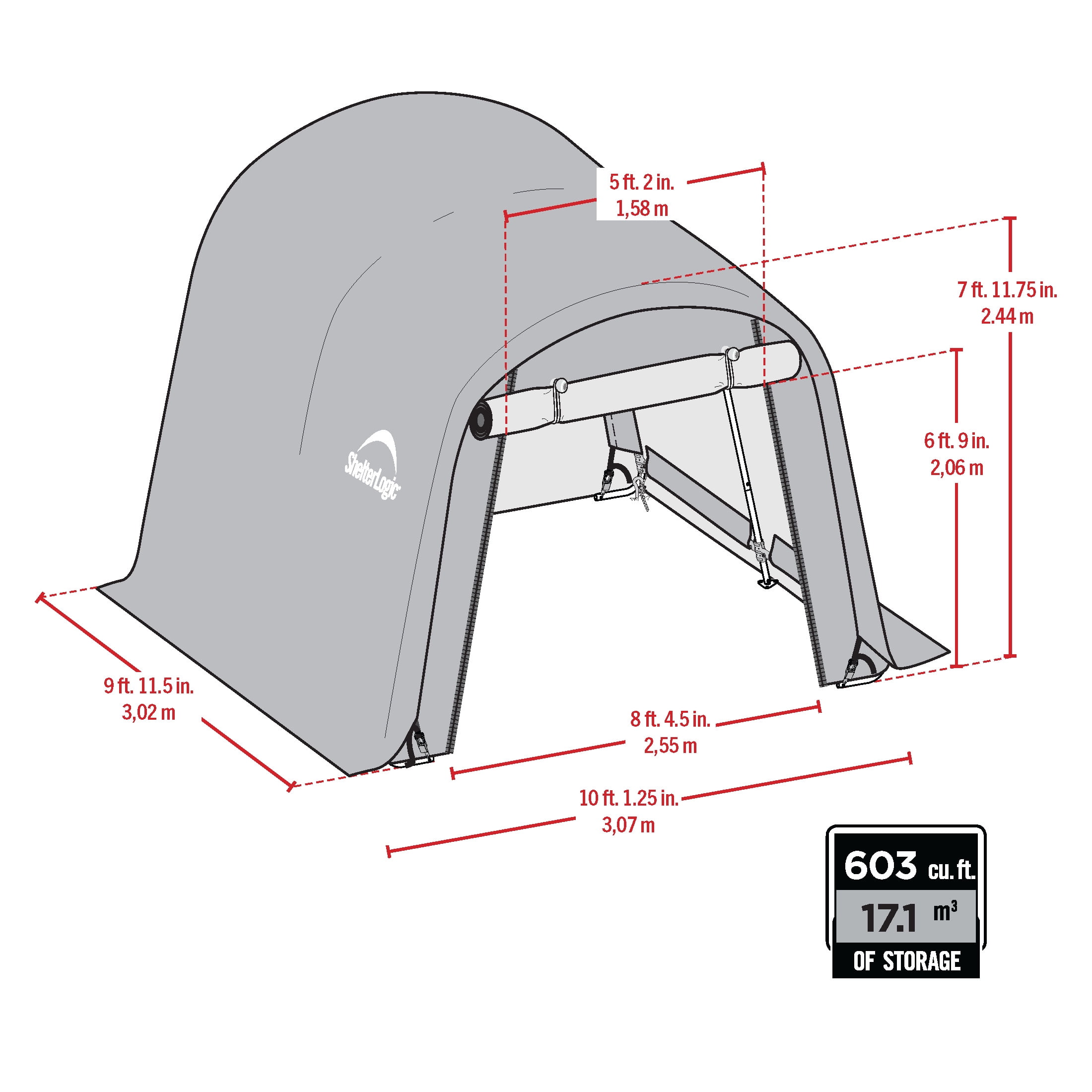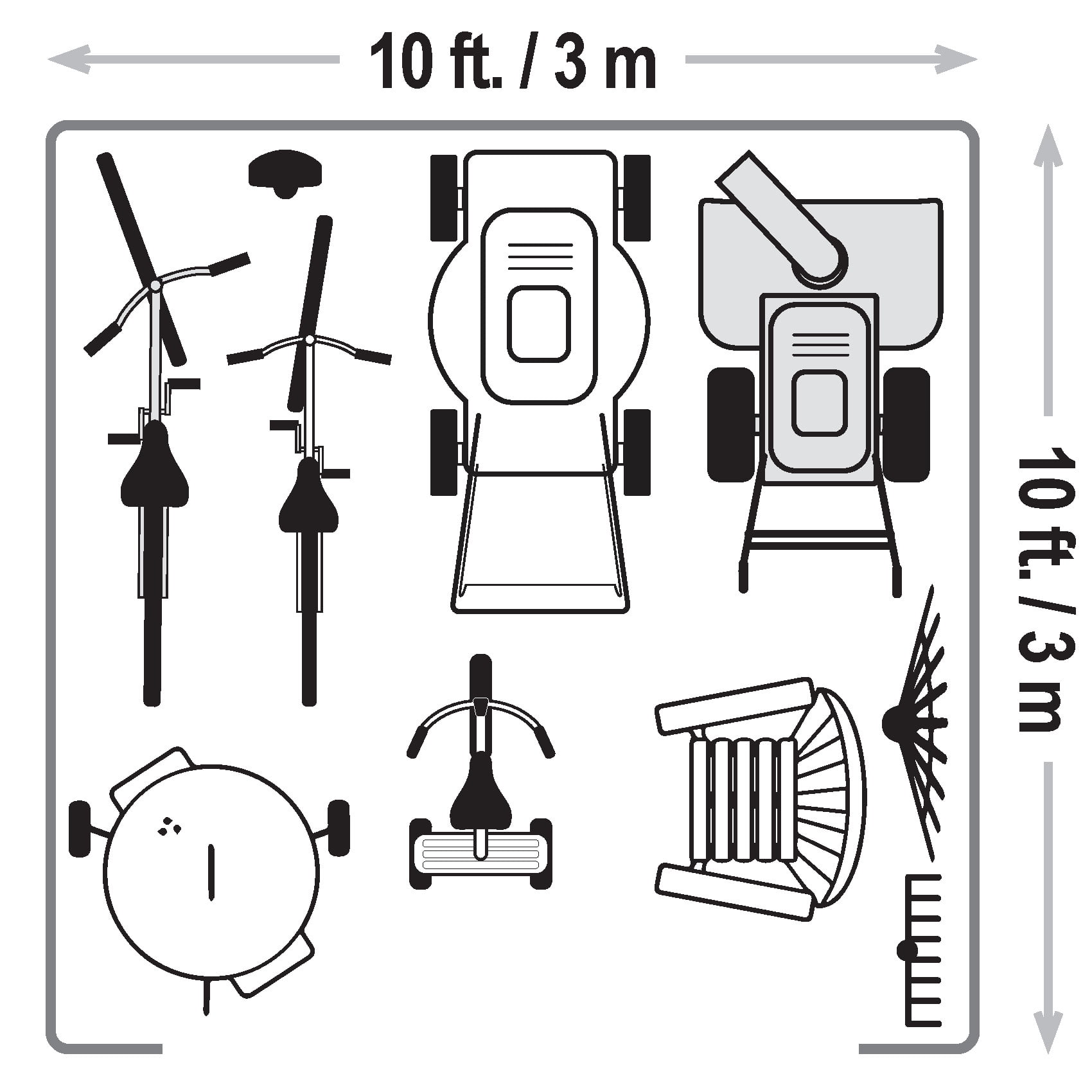 SMALL FOOTPRINT: The ShelterLogic Outdoor Storage Shed-in-a-Box has a small footprint and big value. Easily setup a ShelterLogic outdoor shed in your backyard space. OUT OF SIGHT: Use the outdoor Shed-in-a-Box as a mower, snow blower, ATV, pool or garden shed, fit to store your equipment and outdoor accessories. ALL-YEAR USE: The ShelterLogic Storage Shed-in-a-Box is built with lasting durability. The storage shed includes a ratchet tite cover, designed for all seasons to protect against sun, rain, sap and more. STABLE DESIGN: Patented ShelterLock stabilizers ensure rock solid stability, delivering a durable outdoor shed. The ShelterLogic shed has an Easy Slide Cross Rail system for secure fit. WATERPROOF: The triple-layer ripstop polyethylene shed cover is waterproof and UV-treated with fade blockers, anti-aging, and antifungal agents. The ShelterLogic storage shed is powder-coated to prevent chips, peeling, rust and corrosion.