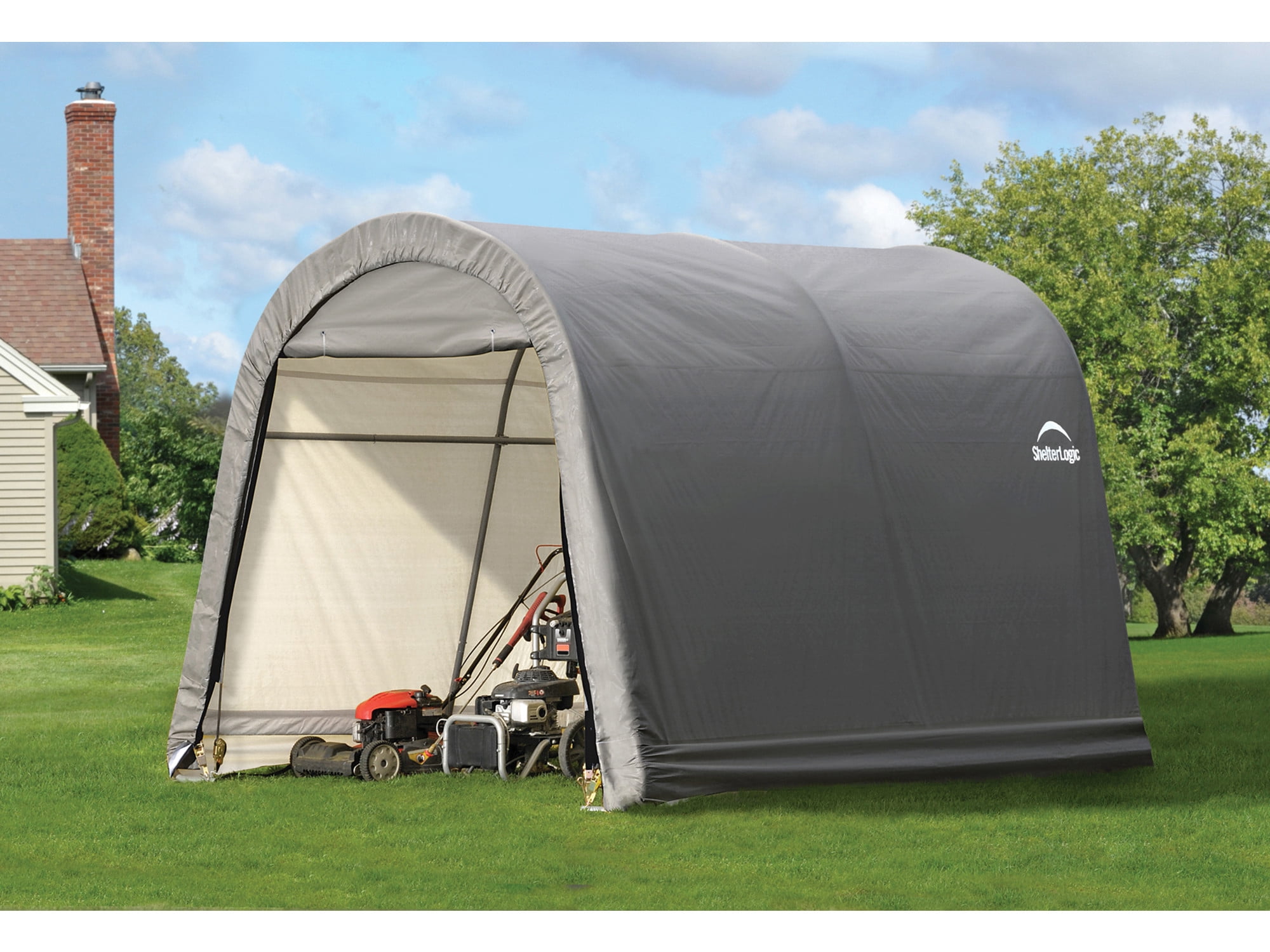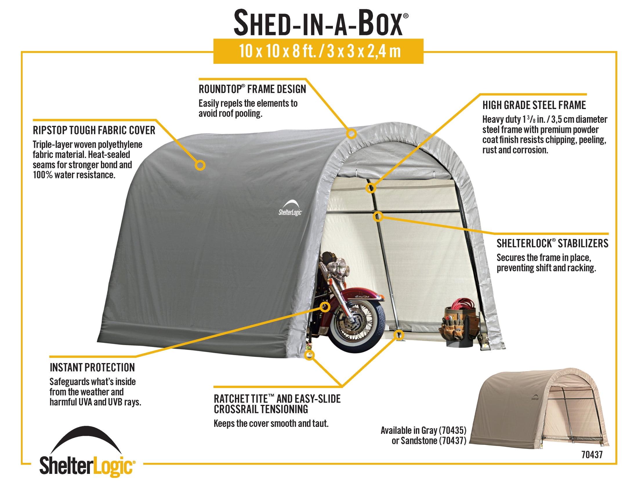The Original Shed-in-a-Box RoundTop 10x10x8 makes back yard storage fast and easy. Constructed of heavy duty 1 3/8 in. steel frame. Bonded with DuPont Premium powder coat process which prevents chipping, peeling, rust and corrosion. Advanced engineered rip stop tough woven polyethylene fabric is triple layered, heat bonded for ulitimate 4 season performance.and is waterproof, UV treated inside, outside and in between with added fade blockers, anti anti-aging and ant- fungal agents High profile white interior provides enhanced illumination. patent pending ShelterLock stabilizers at every rib connection ensure a rock solid frame. Rugged Ratchet Tite Tensioning system enables quick cover installation. Easy Slide Cross Rail system locks down and squares up frames for initial and continuous frame to fabric fit.- SKU: SHLTL173