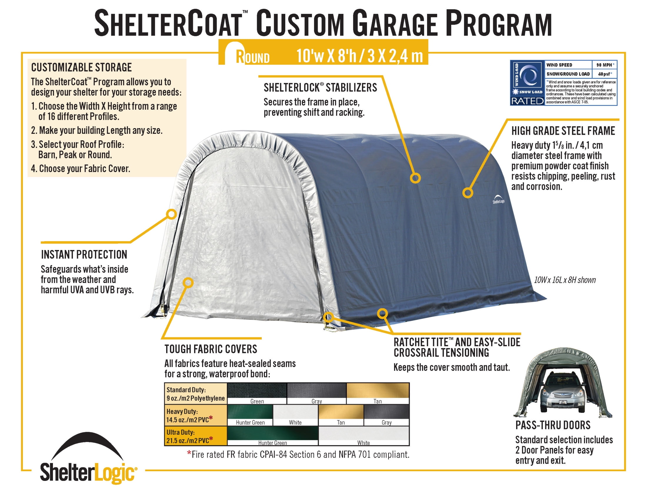 ShelterCoat garages are the ideal compact storage solution for ATV’s, lawn and garden equipment, small tractors, patio furniture, pool supplies, tools and equipment and bulk storage. Choose from the largest selection of premium powder coated steel frame, fabric shelters in the industry! With THOUSANDS of choices we have a shelter to custom fit any storage need at an affordable price.Frame constructed of heavy duty 1-5/8 in. diameter steel. Premium powder coat finish protects frame from corrosion and rust. Built to take on the tough weather – rated for winds up to 90 MPH and a snow load of 40 PSF. Ripstop tough advanced engineered polyethylene fabric cover is UV treated inside, outside, and in between. Heat welded seams, not stitched, are 100% waterproof.. Patented ShelterLock stabilizers at every rib connection for rock-solid strength and stability. Ratchet-Tite tension system and Easy-Slide cross rails keep the cover smooth and taut. Bolt-together hardware at every connection point ensures maximum strength and durability. Universal steel foot plates for easy and solid connection to ground anchors, cement, or pony walls. Manufacturer recommends one anchor per leg – see included Anchor Guide for more information.