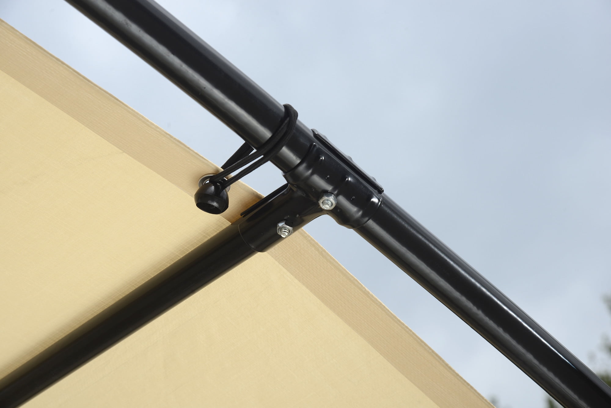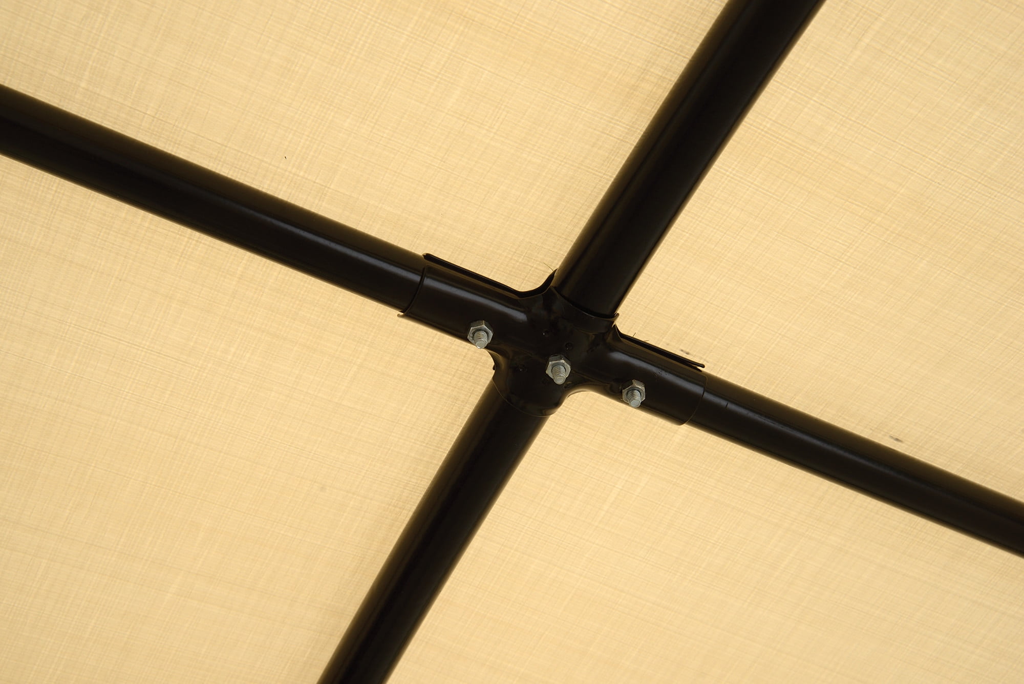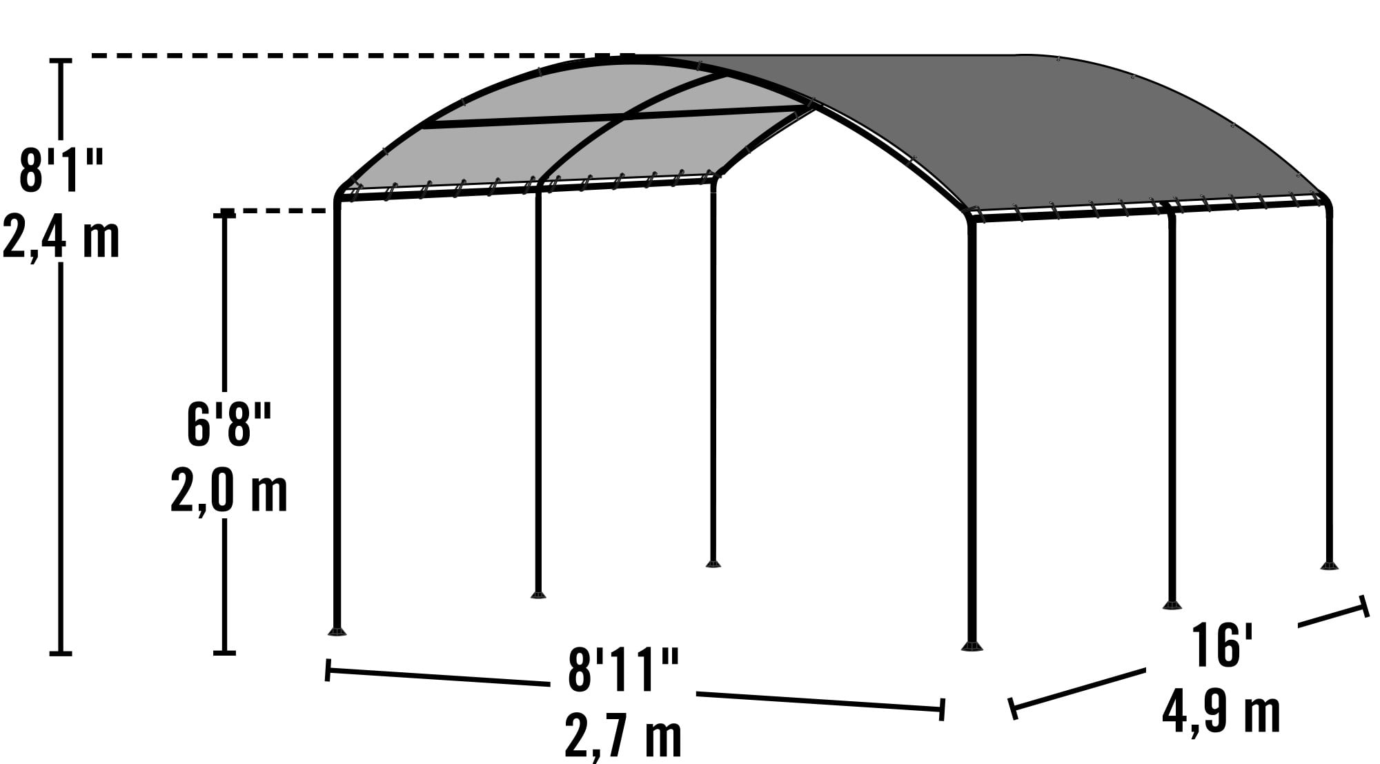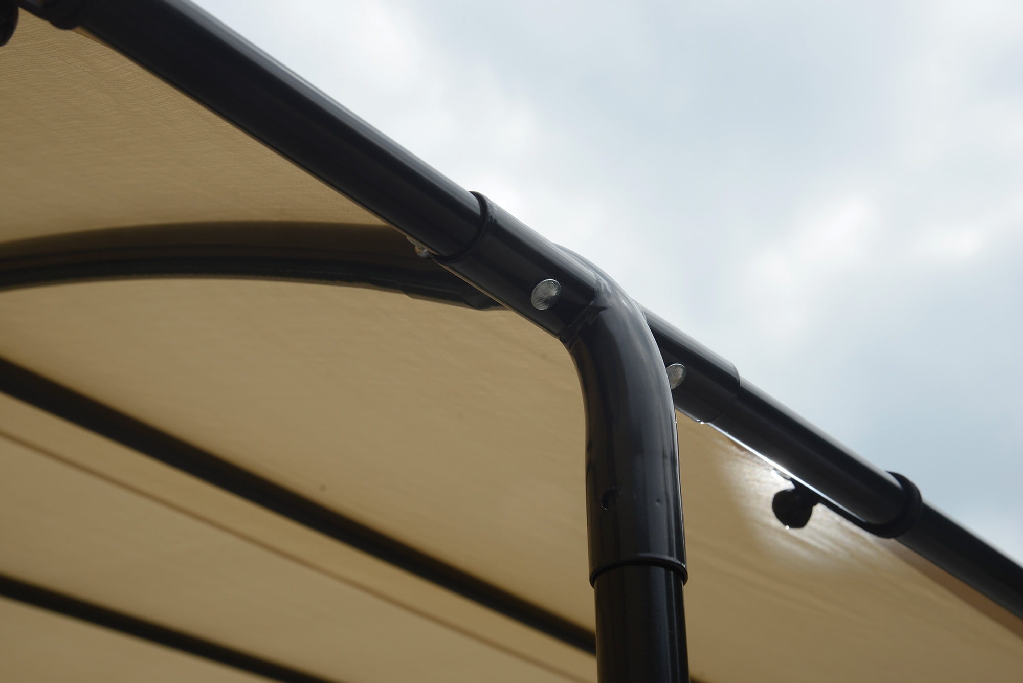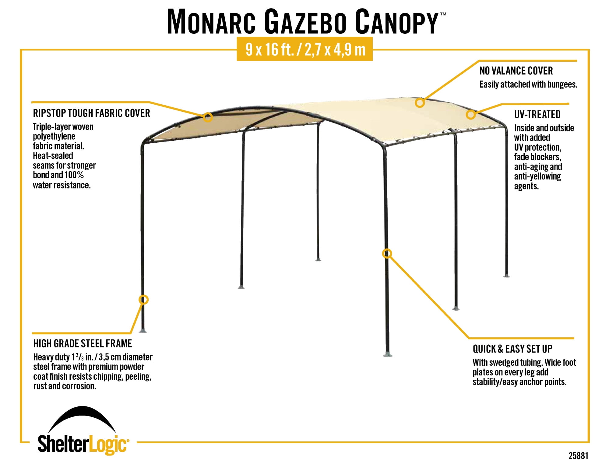 Add a stylish and modern outdoor canopy to your backyard or front yard with the ShelterLogic Monarc Gazebo Canopy. This updated, sophisticated take on affordable shade coverage will provide superior sun protection and is a great alternative to traditional wood gazebos. Your canopy will last season after season with its durable steel frame. The 1-3/8″ black steel tube frame is powder coated to resist chipping, peeling, corrosion, and rust. Features bolt connections and spike anchors for added security and stability. The 1-3/8″ cross beams provide robust anchoring for the outdoor canopy cover. The attractive, neutral tan canopy cover is constructed from a 5.5 oz thick ripstop fabric for durability. Its waterproof cover provides protection from UV rays and inclement weather. This stylish canopy offers an arch shape, clean lines, and earth tones to complement a variety of home exteriors and decor. Attaching the no-valanced gazebo cover is easy. Simply use the included bungees that encircle the cross beams to attach the cover for a drum-tight fit. Set-up of the frame is a cinch and requires 2 people for quick assembly. No additional parts are required for assembly. Add style and functionality to your backyard, patio, deck or wherever you need shade and protection with this portable gazebo canopy. The ShelterLogic Monarc Gazebo will provide superior quality and backyard shade at an affordable price. This outdoor canopy gazebo measures 111.4″ W x 191.18″ D x 97.86″ H and assembly is required. Purchase includes: (1) 9′ x 16′ black steel frame; (1) one-piece Sandstone polyethylene cover; temporary anchors; and easy step-by-step instructions.