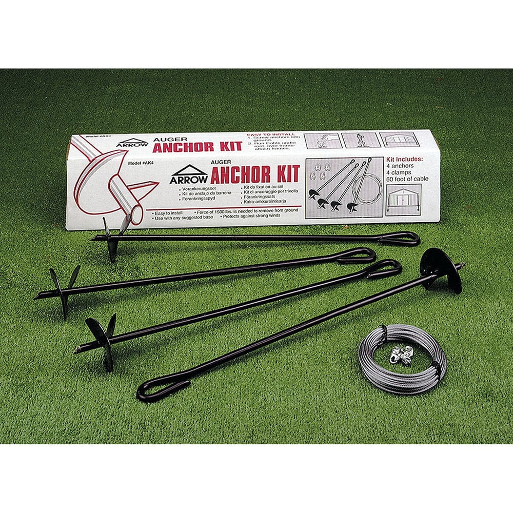 Arrow Earth Anchor Kit Includes: (4) 30″ Heavy Duty Steel Augers, (4) Cable Clamps, & 60′ of Cable Material: Galvanized Steel Color: Black Will Not Work With Carports or Yardsaver Sheds Assembly Required