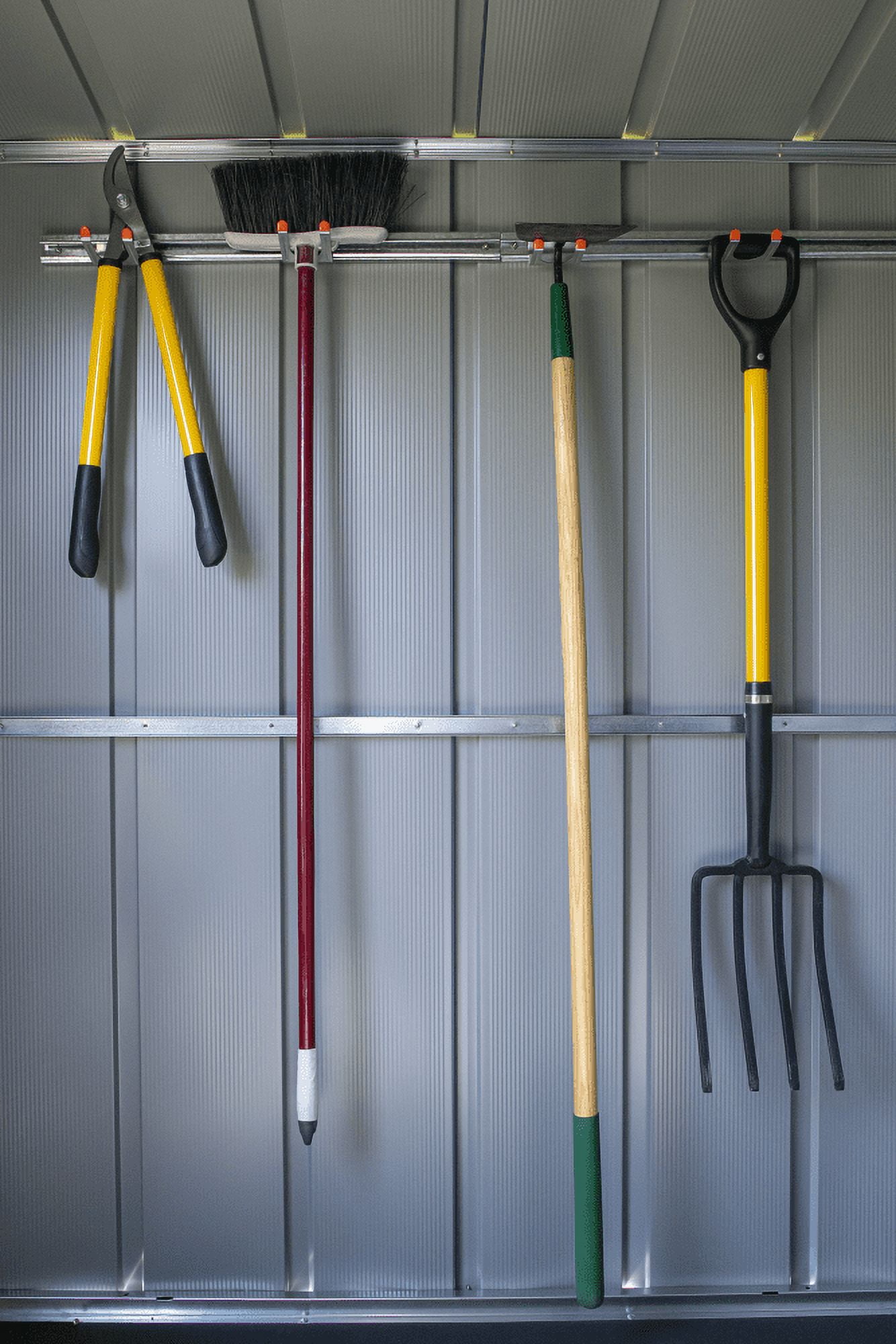 Arrow Tool Hanging Rack Material: Hot Dipped Galvanized Steel Color: Galvanized-Gray Assembled Exterior Dimensions: 51″W x 3.31″D x 1.86″H Assembly Required Includes: (2) 25.5″ Channels (5) Separate Large-Tool Holders that Snap into the Channel
