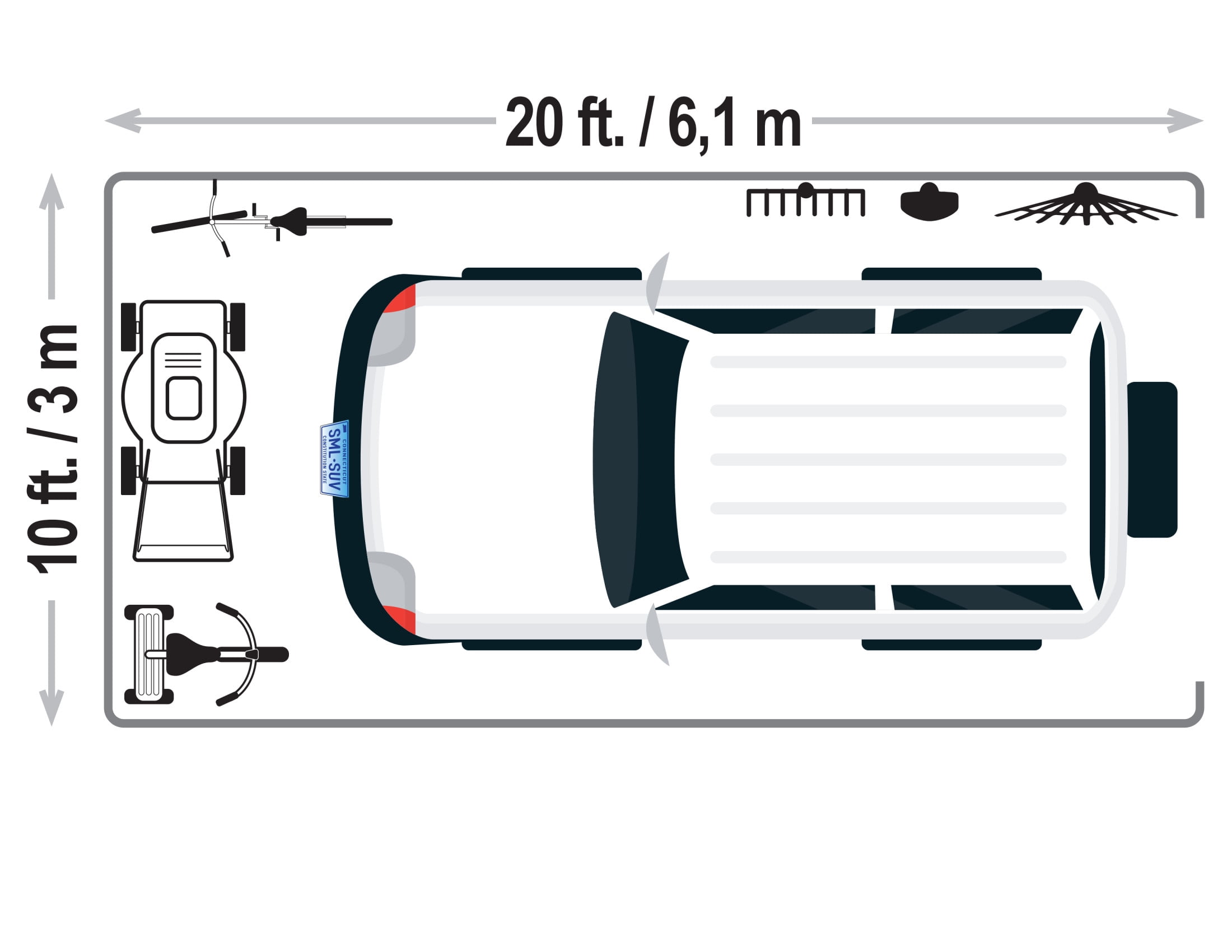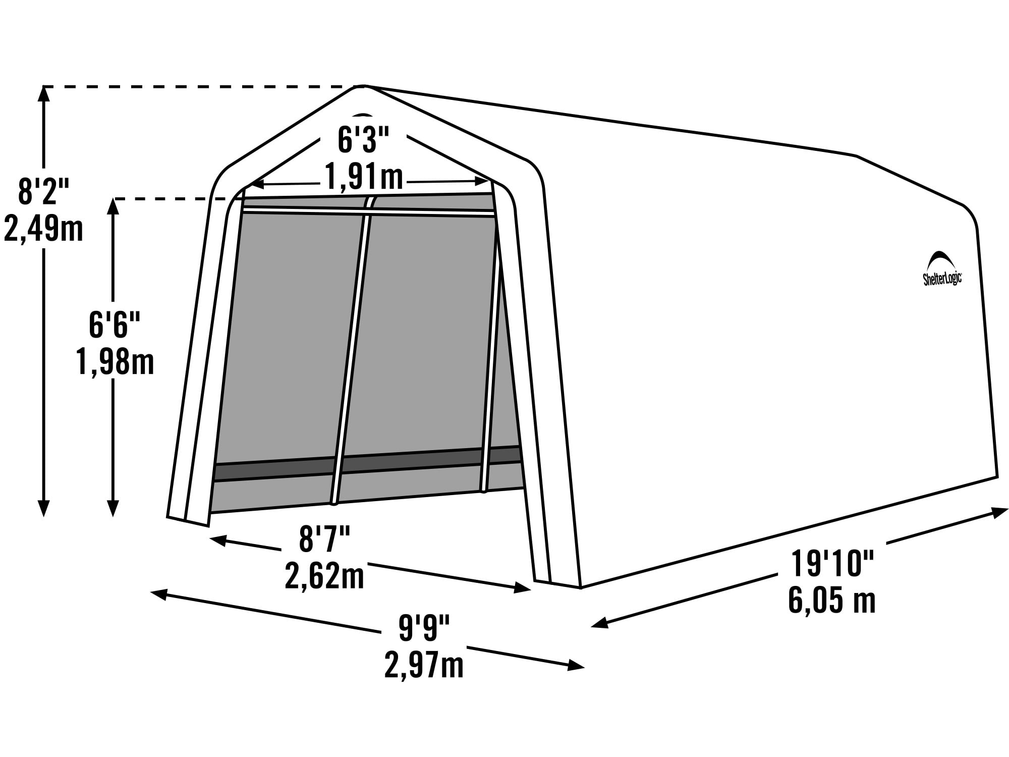 Durable frame: made from an all-steel metal 10 x 20 x 8-feet frame that is 1-3/8 inches thick, providing strength and stability Made to last: bonded with a premium powder-coated finish that prevents chipping, peeling, rust, and corrosion Waterproof coverage: sandstone cover is durable and made from an advanced triple-layer ripstop that is waterproof and UV-treated to resist fading Shelterlock: patented shelter lock stabilizers ensure rock-solid stability that delivers a stable, more durable shelter The ratchet-tight cover tensioning system ensures a drum-tight cover that keeps it tight and neat-looking Easy slide cross rail system: locks down and squares up frames for initial and continuous frame-to-fabric fit Assembly: shelter logic recommends 2 people for this project and approximately 6 hours of time set aside to complete Assembled dimensions and warranty: exterior- 10′ x 20′ x 8′ interior- 9’7″ x 19’7″ x 8′ 1 year limited warranty