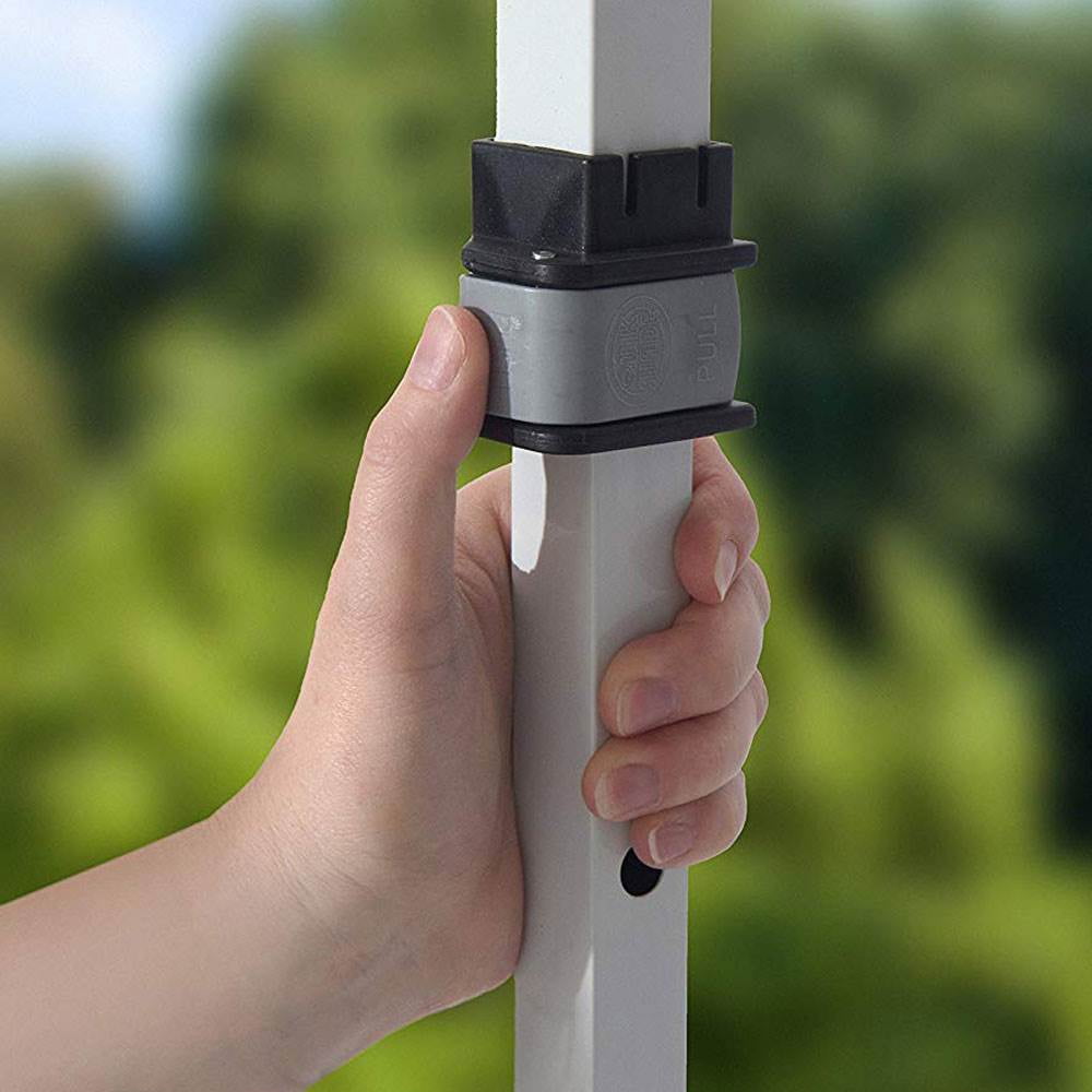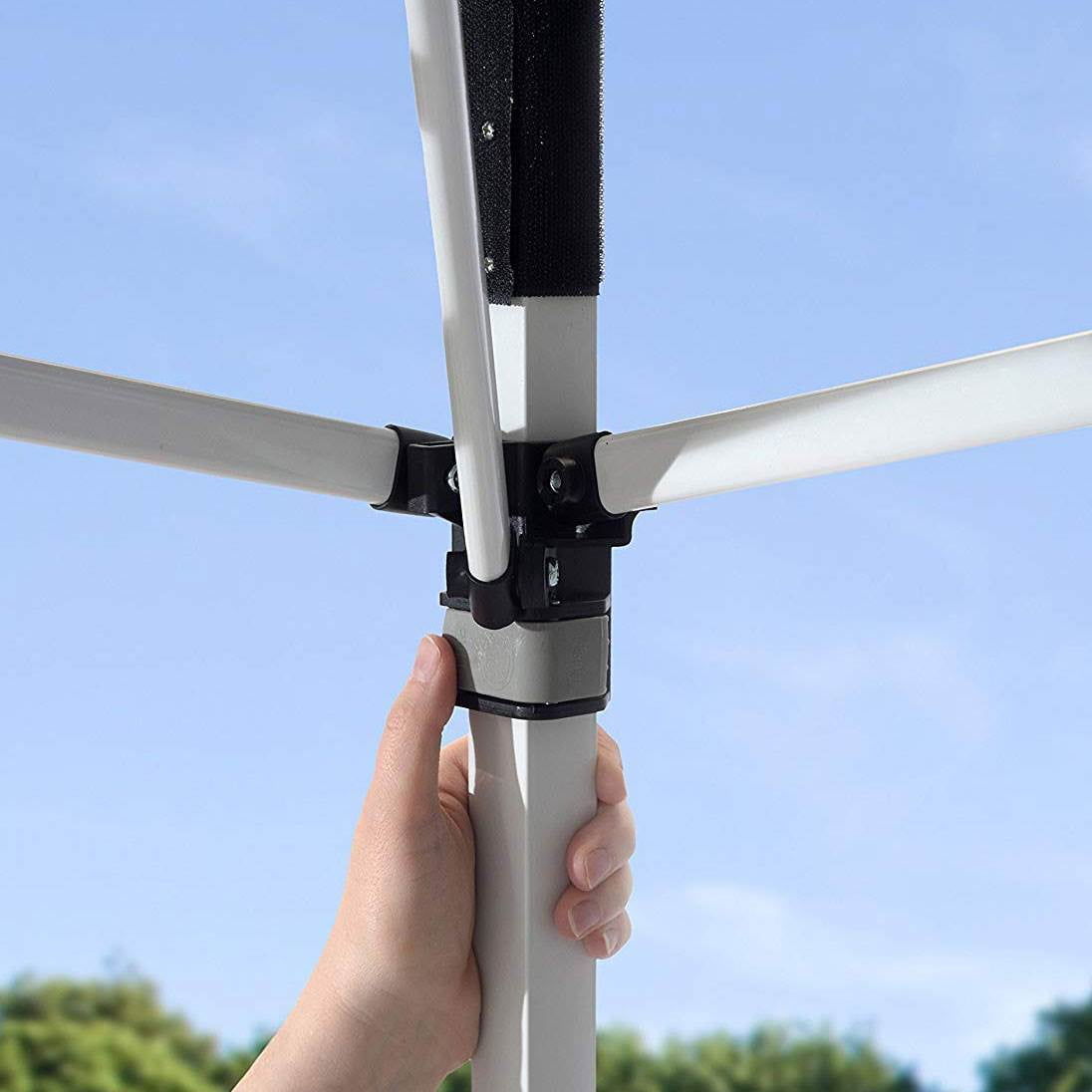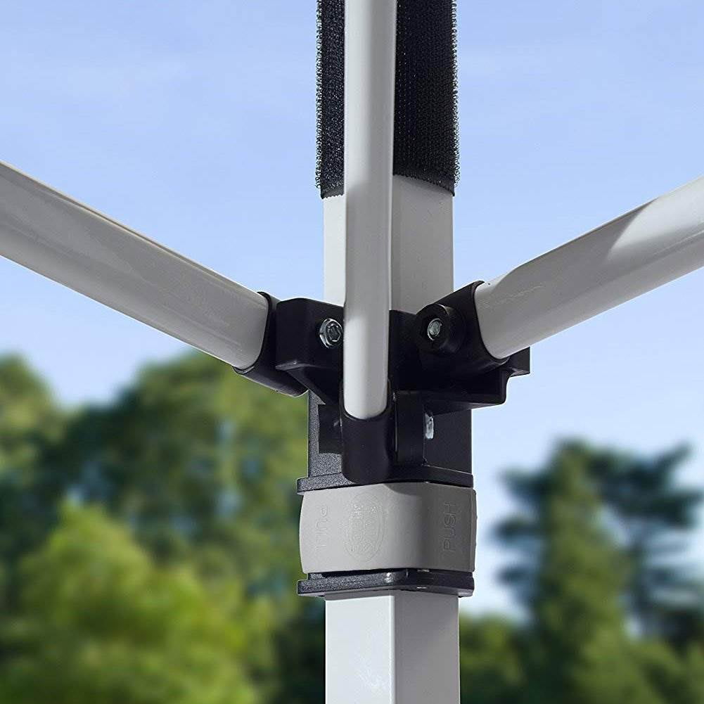 AMPLE SHADE SPACE: 10 x 10 foot instant canopy provides 100 square feet of shade for 8 to 12 people. Includes wall panel for extra protection and privacy SUN PROTECTION: Fabric canopy top made with 300 denier polyester with Aluminex-backed top ensures 99% UV protection, water resistance, and cooler shade area MADE TO LAST: Sturdy construction with rigid 12 x 23mm patented overlapping eave construction for added strength and stability EASY LATCH SYSTEM: Easy to use, patented Mega Latch sliders and leg extenders offer easy adjustment between 3 height positions. Micro glide Teflon bearings for easy glide STABLE AND SECURE: Frame features 30mm thick legs and nylon feet for stability and floor protection. 4 ground stakes are included for each canopy leg for solid anchoring
