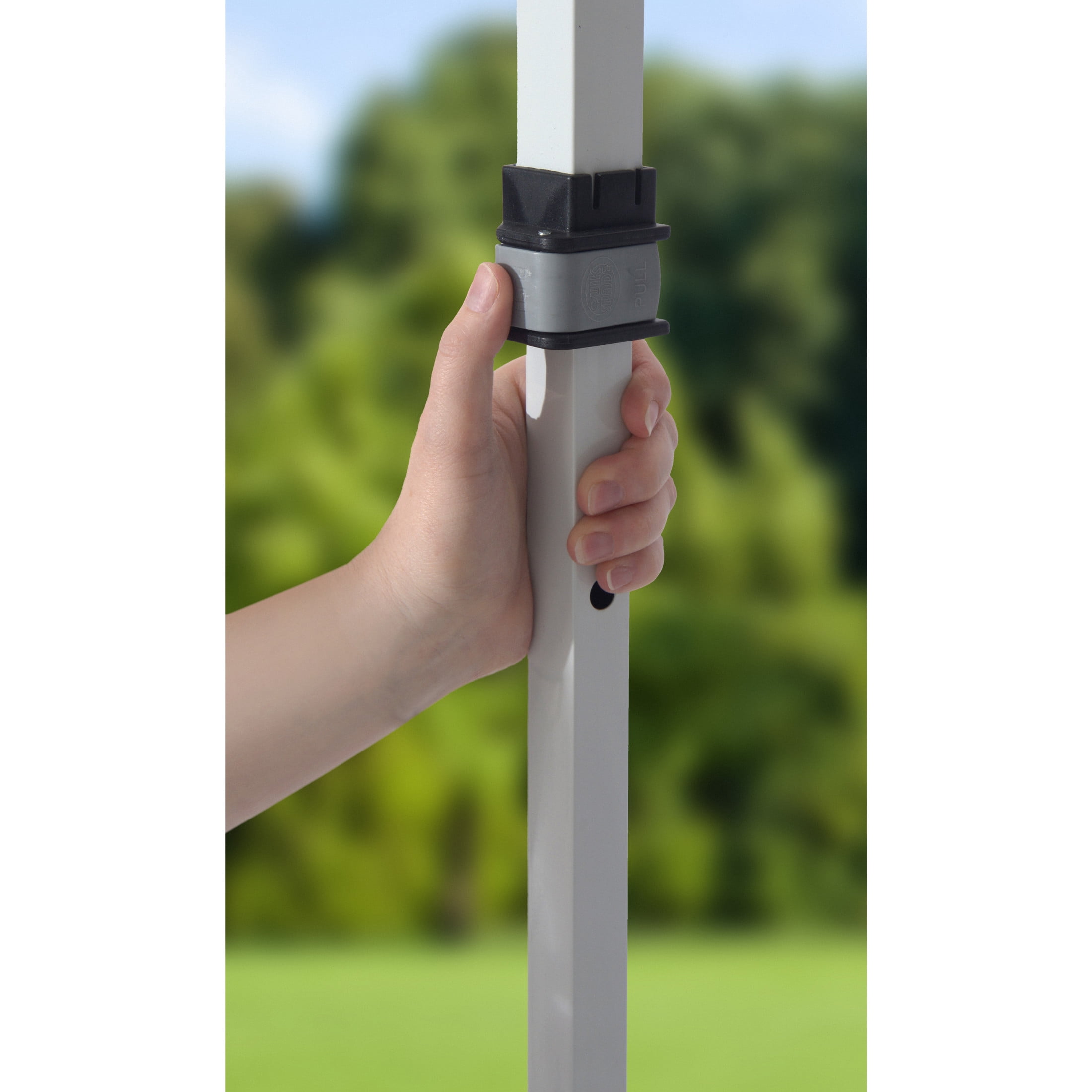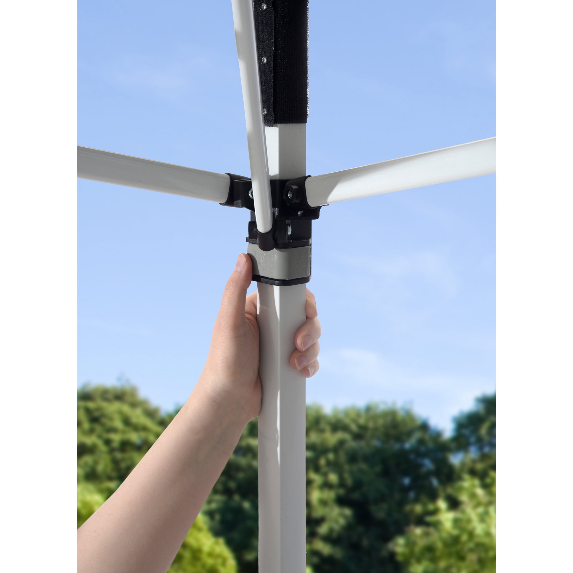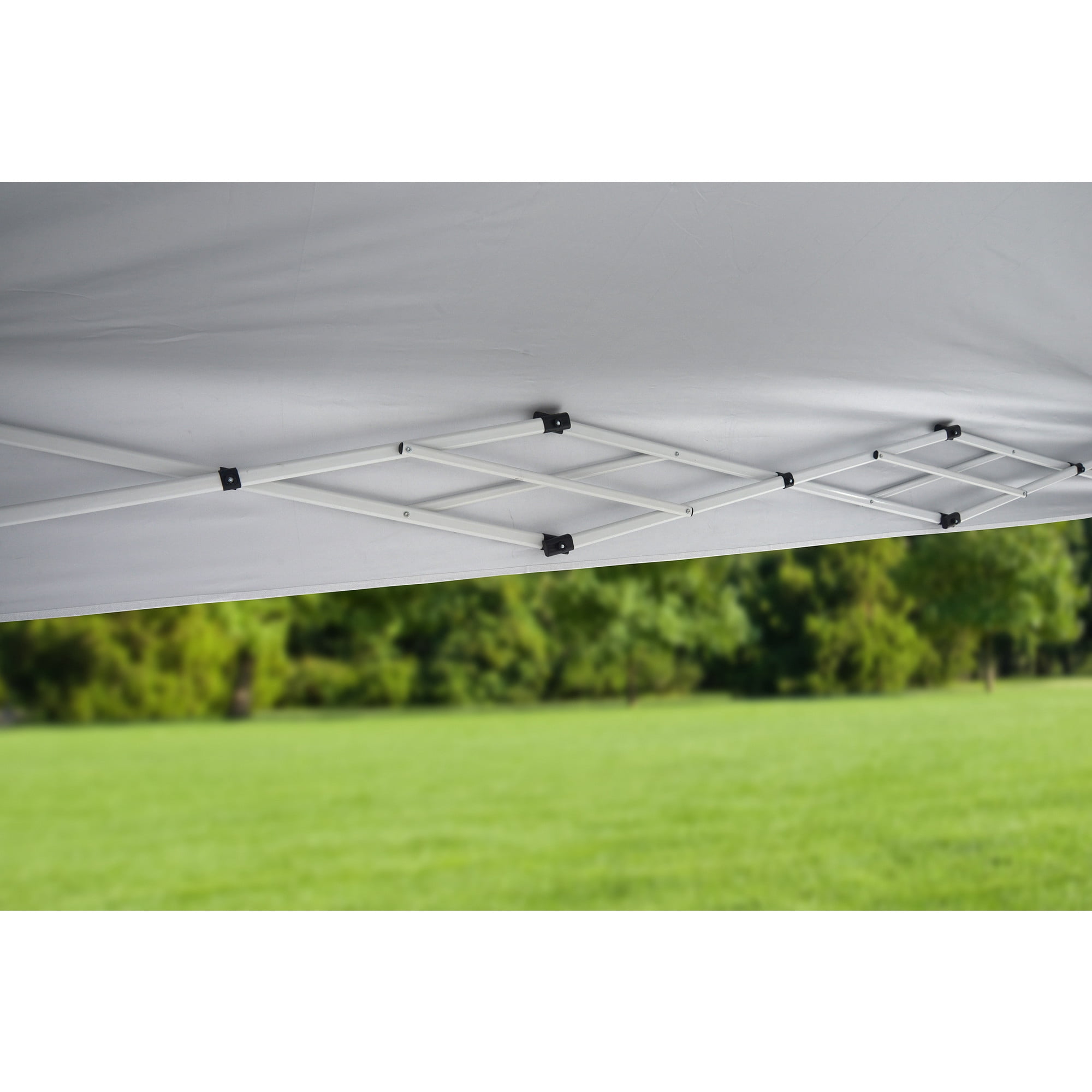 AMPLE SHADE SPACE: 10 x 10 foot instant canopy provides 100 square feet of shade for 8 to 12 people. Includes wall panel for extra protection and privacy SUN PROTECTION: Fabric canopy top made with 300 denier polyester with Aluminex-backed top ensures 99% UV protection, water resistance, and cooler shade area MADE TO LAST: Sturdy construction with rigid 12 x 23mm patented overlapping eave construction for added strength and stability EASY LATCH SYSTEM: Easy to use, patented Mega Latch sliders and leg extenders offer easy adjustment between 3 height positions. Micro glide Teflon bearings for easy glide STABLE AND SECURE: Frame features 30mm thick legs and nylon feet for stability and floor protection. 4 ground stakes are included for each canopy leg for solid anchoring