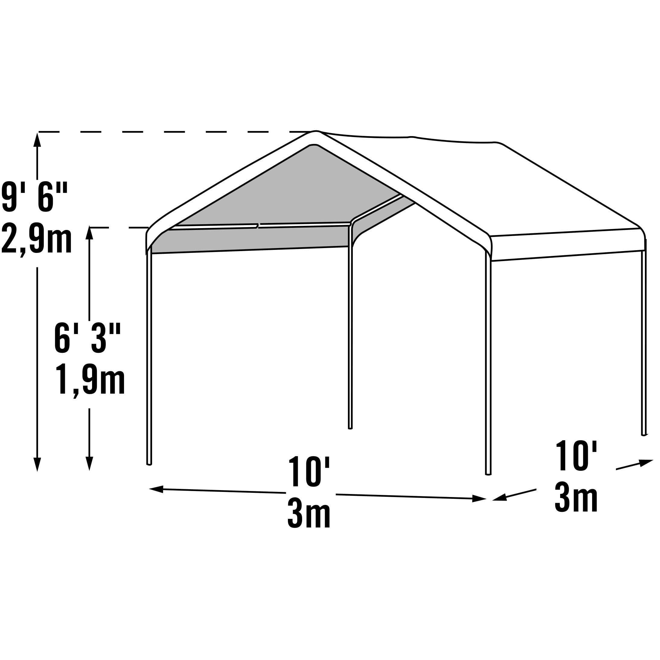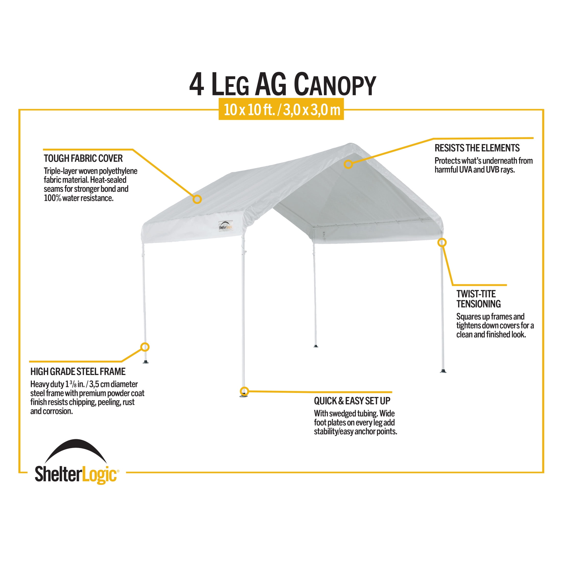 Heavy Duty 1-3/8 in. diameter powder-coated steel frame Easy up with built-in slip together swedged tubing Fully valanced polyethylene cover 100% waterproof with rip stop fabric 50+UPF rating blocks more than 98 percent of the UV harmful rays Twist Tie ™tensioning squares up frames and tightens down cover From the #1 shelter manufacturer in North America comes the ShelterLogic 10 x 10 MAX AP Compact Canopy, a professional-quality canopy that effortlessly provides instant shade and protection from the elements. Housing a number of excellent innovations in shelter design and built from only the most dependable materials, this piece promises to work perfectly in any situation – from decks and patios to vehicle storage and special events. The ShelterLogic 10 x 10 MAX AP Compact Canopy features: Sturdy, high-grade, 1.375-inch-thick steel frame subjected to a proprietary 13-step Rhino Shield steel surface preparation process, then bonded with DuPont thermoset baked-on powder coat. Prevents chipping, peeling, rust, and corrosion. Advance-engineered, triple-layer polyethylene cover, UV-treated inside and out with patented fade blockers and anti-aging/anti-fungal agents, resulting in a cover that withstands the elements. Quick and easy setup built in with slip-together swedged tubing and patented Twist Tite tensioning squares up frames and tightens down covers for a clean and finished look. All of this comes together in the hands of ShelterLogic, a company world-renowned for its constant commitment to quality and pioneering designs, so well illustrated in this canopy. The ideal shelter solution for any outdoor event, the ShelterLogic 10 x 10 MAX AP Compact Canopy means instant and effortless shade and protection. Want to keep the bugs at bay? See below for enclosure accessories that will keep your canopy interior insect-free! About ShelterLogic LLC ShelterLogic LLC specializes in manufacturing and distributing a full line of multi-purpose, all-weather shelters and accessories for consumer and commercial use. ShelterLogic offers the most diverse shelter product line and is the worldwide leader in innovative shelter design and manufacturing. The company makes shelters for all kinds of weather and custom solutions for every customer’s need – from a full line of canopies, garages, sheds, and storage shelters to popular ports, greenhouses, equine, and engineered structures. More than 2 million ShelterLogic all-weather shelters provide protection and stand between valuable possessions and the destructive forces of nature’s elements.