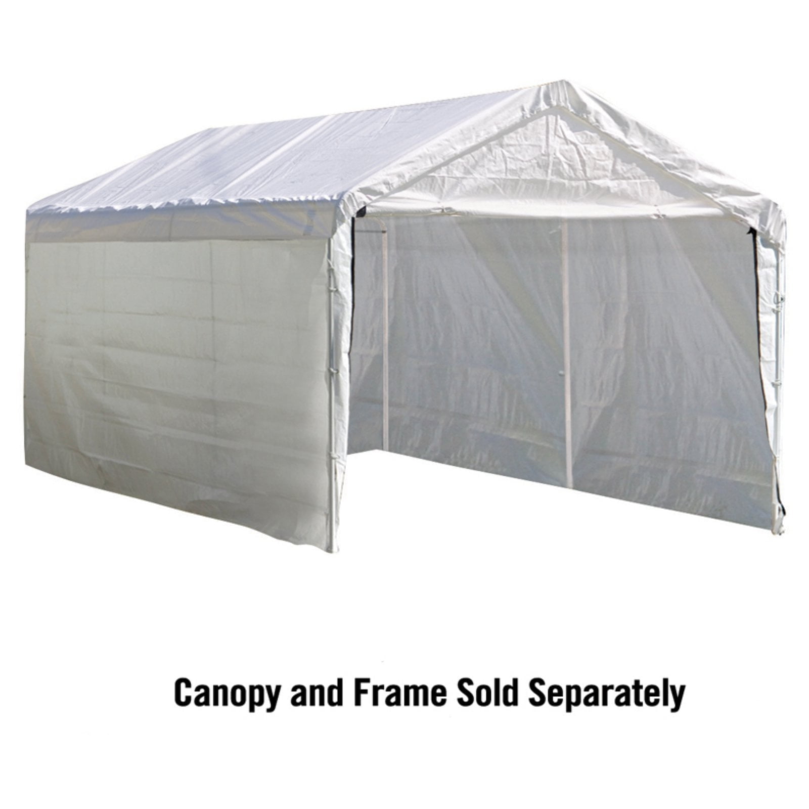 The ShelterLogic MaxAP 10 ft. x 20 ft. Canopy Enclosure Kit delivers more options, and more versatility to your canopy. Quickly convert your 10 ft. x 20 ft. , 2 in. diameter fixed leg canopy to an enclosed shelter in minutes. Attaches to the frame quickly and easily with bungee fasteners. Create a great low cost seasonal storage solution in minutes. Canopy frame and cover sold separately.ENCLOSURE KIT ONLY – CANOPY FRAME AND COVER SOLD SEPARATELY. Fits all 10 x 20 ft. SuperMax 2 in. diameter canopies.. Heat sealed seams not stitched for a stronger bond. 100% water resistant. Constructed of ripstop woven polyethylene fabric. 50+ UPF Sun Protection blocking 98% of harmful UV Rays. Added UV protection, fade blockers, anti- aging, anti-yellowing and anti-microbial agents. UV protection treated inside, outside and in between. Quick and easy set-up attached to canopy frame in minutes with bungee fasteners, reuse your existing bungees or reorder.