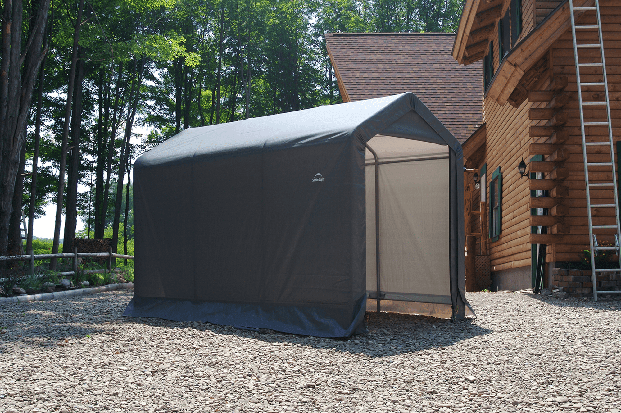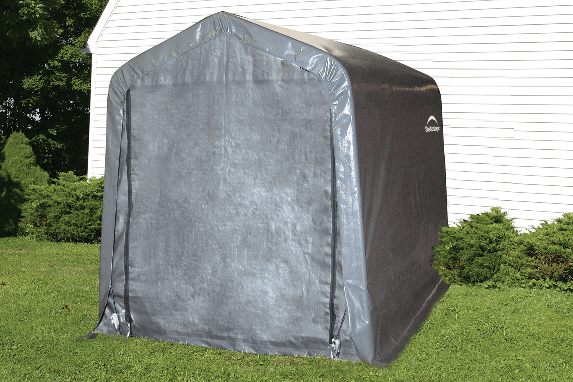 The Original Shed- in- a Box – compact 6 x 10 x 6 ft. back yard storage made simple. Constructed of heavy duty steel frame. Bonded with DuPont Premium powder coat process which prevents chipping, peeling, rust and corrosion. Advanced engineered rip stop tough woven polyethylene fabric is triple layered, heat welded seams for ultimate 4 season performance and is 100% waterproof, UV treated inside, outside and in-between with added fade blockers, anti-aging and anti-fungal agents. High profile white interior provides enhanced illumination. Easy to set up and take down as needed with slip fit connectors and best in class swedged tubing. Patented ShelterLock stabilizers at every rib connection ensure a rock solid frame. Rugged Ratchet Tite tensioning enables quick cover installation. Easy Slide Cross Rail system locks down and squares up frames for initial and continuous frame to fabric fit. Comes ready to install. Features: Finish: gray Includes frame, 2 double zippered front door, ratchet tie downs, fitted cover, 4 auger anchors and foot plates Made of polyethylene fabric and steel Patent-pending shelterlock 3x steel stabilizers ensure rock solid stability and durability DuPont premium powder coat prevents peeling, rusting, chipping and corrosion Waterproof , UV-treated inside and out with added fade blockers High profile white interior provides enhanced illumination Swedged tubing for quick, slip-together easy assembly Specifications: Overall Dimensions: 78″ H x 72″ W x 120″ D Product Weight: 83 lbs