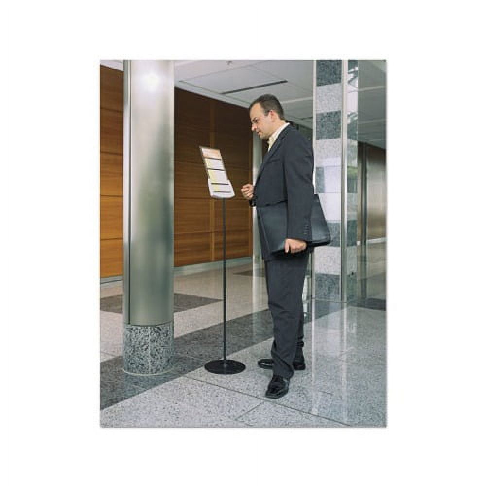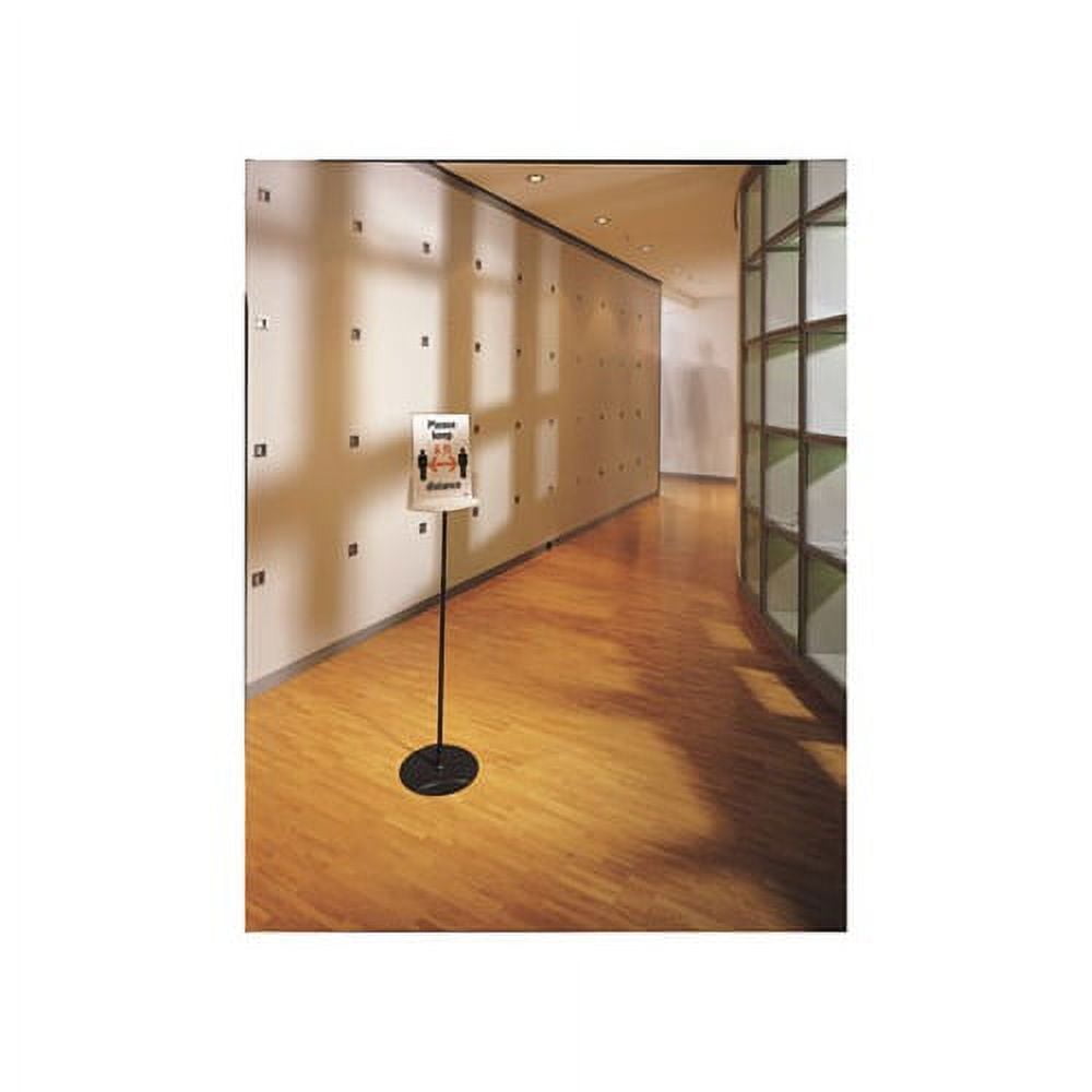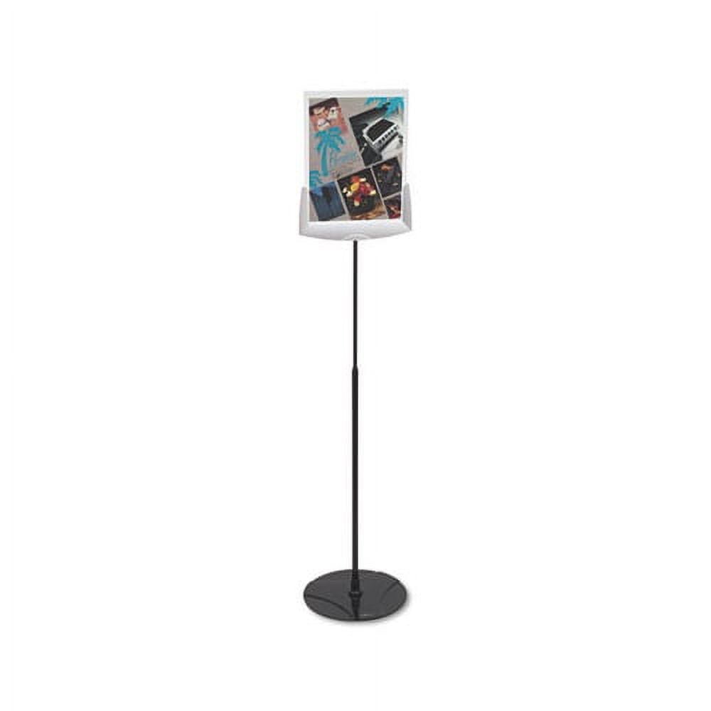 Takes your message from the printer to the public in a snap Telescopic floor sign stand for 8 1/2″ x 11″ inserts. Removable hard acrylic panel is open on three sides for easy loading. Tilt-adjustable panel can be viewed from either side. 40-60″ height-adjustable pole posts sign at desired level. Stable round base. Frame Color: Gray Size: 40″ to 60″ Insert Size: 8.5 x 11 Materials: Acrylic/Metal. Green : Master carton is of recycled material.