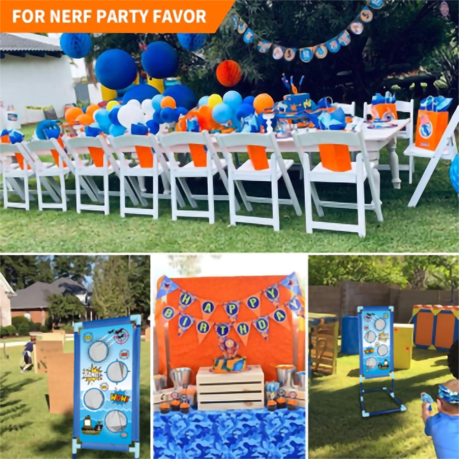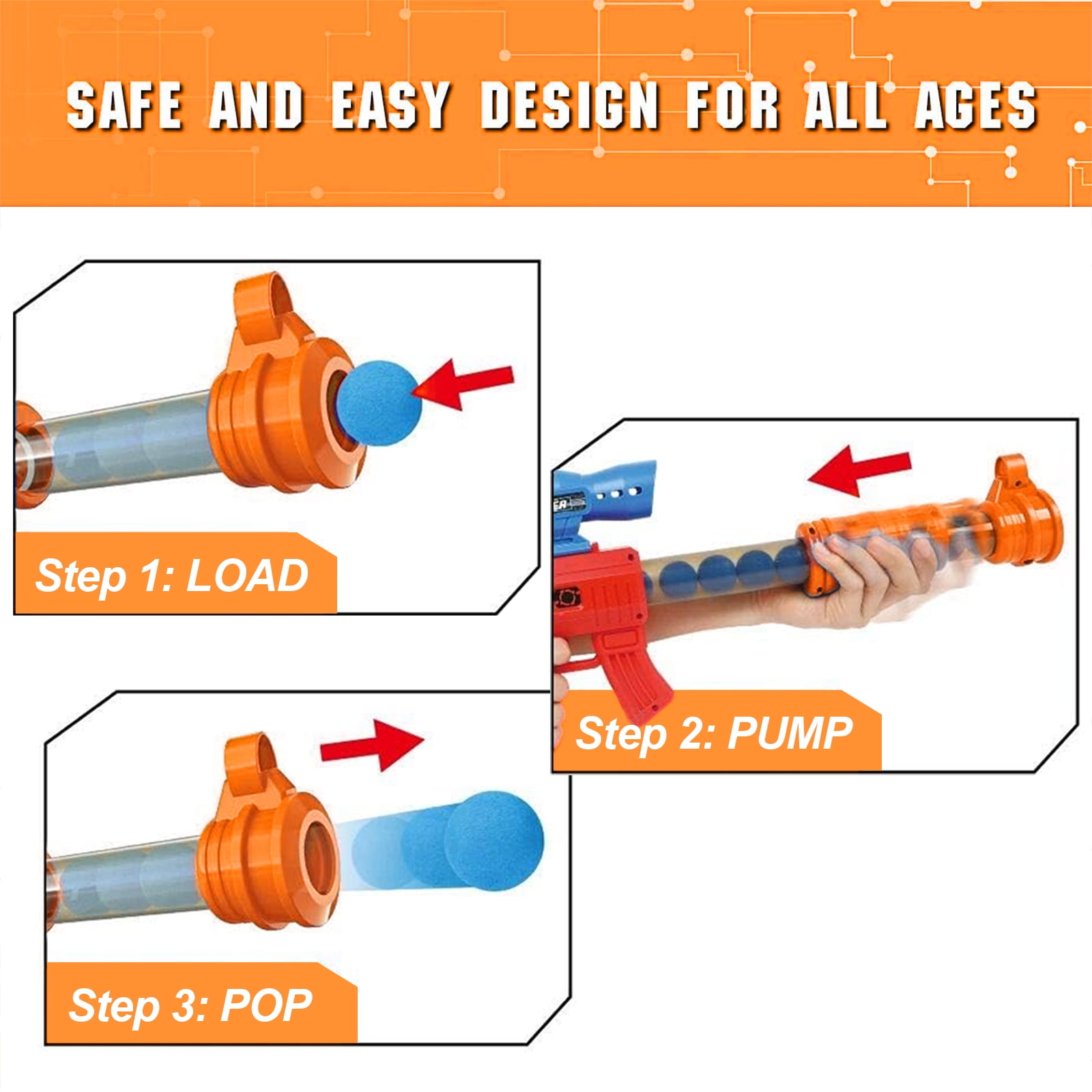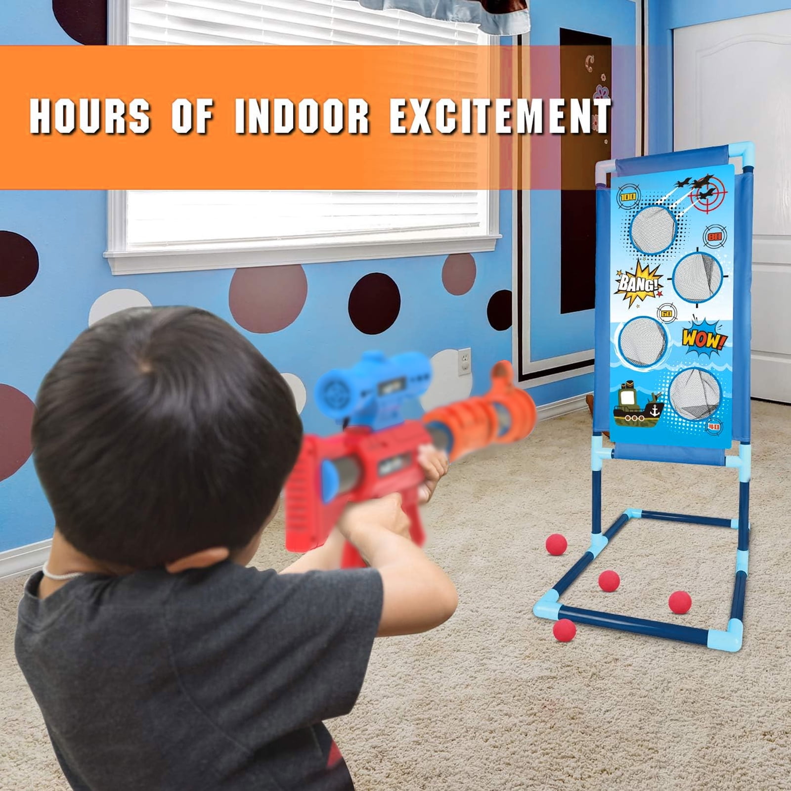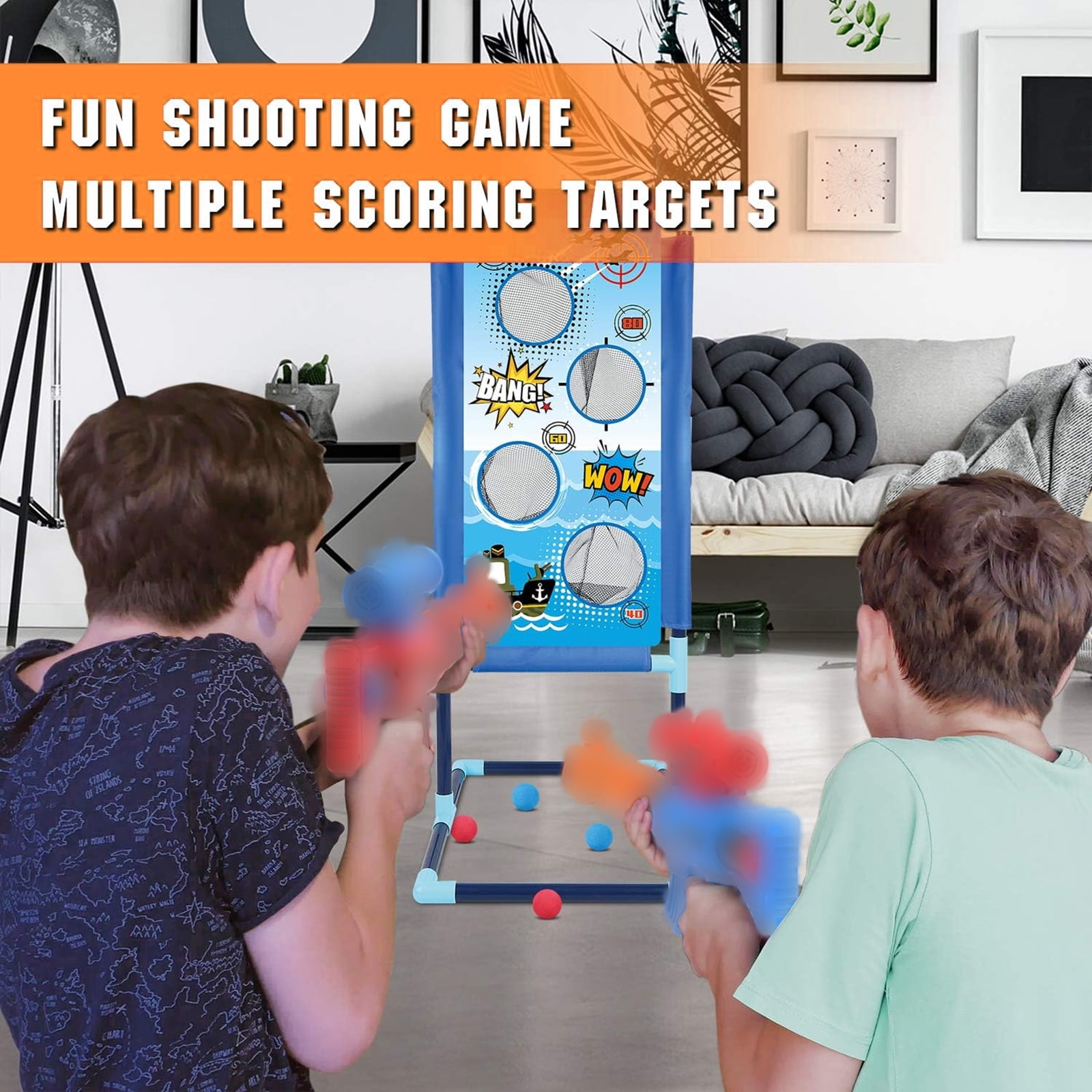 Shooting Target Games Kit: Package has a whole setup with shoot range board, 24pcs soft foam balls (2 colors: 12 red and 12 blue) and 2pcs blaster. This target practice toy is perfect because it comes with everything you need for a fun and big enough for 2 kids to shoot the targets at the same time. 2-Player Mode Fun Shooting Toy: The target board is very light weight and easy to setup and easy to put away as wel. The use and operation of the shooting toy is easy enough for the youngest to operate. The shooting game has 360 degree butt and shoot around 12ft, so much fun shooting at the target and competing for who can get the most shots. Great Indoor Game for Kids: The shooting toy is easy to load by just pressing the balls by hand into the front where they are shot out of. The foam balls are very light and very safe for little kids. The balls being two different colors is very helpful so that players can easy enough to add up points and know who will win more scores. Fun for Kids and Adults: The blast shooting game can play outside or a big basement, and kids can play with friends and family. This toy can shoot quite a distance. Perfect for target practice and games, improve hand-eye coordination and fine motor skills. A great well made toy for children of all ages. Best Idea Gift for Age 5+: It’s a parent-child interactive toy that can reduce kid’s devices time and make fun family time! Highly recommend it if you’re looking for something simple and entertaining that promotes physical activity and can be used indoors or outdoors. The best choice for boys Birthday gift or Christmas gift.