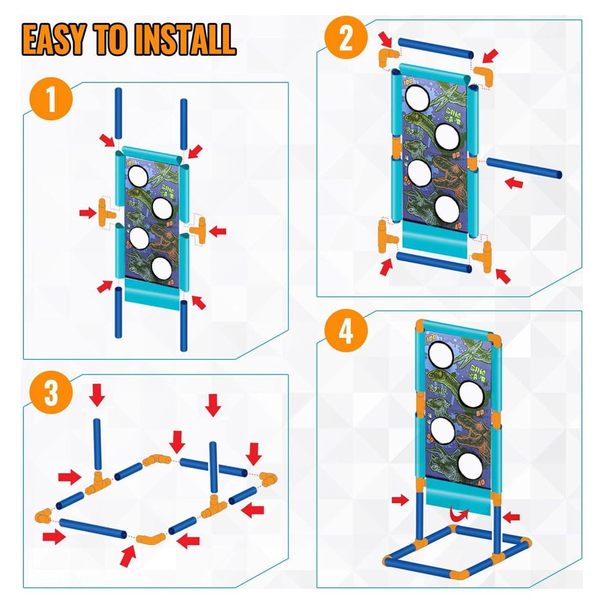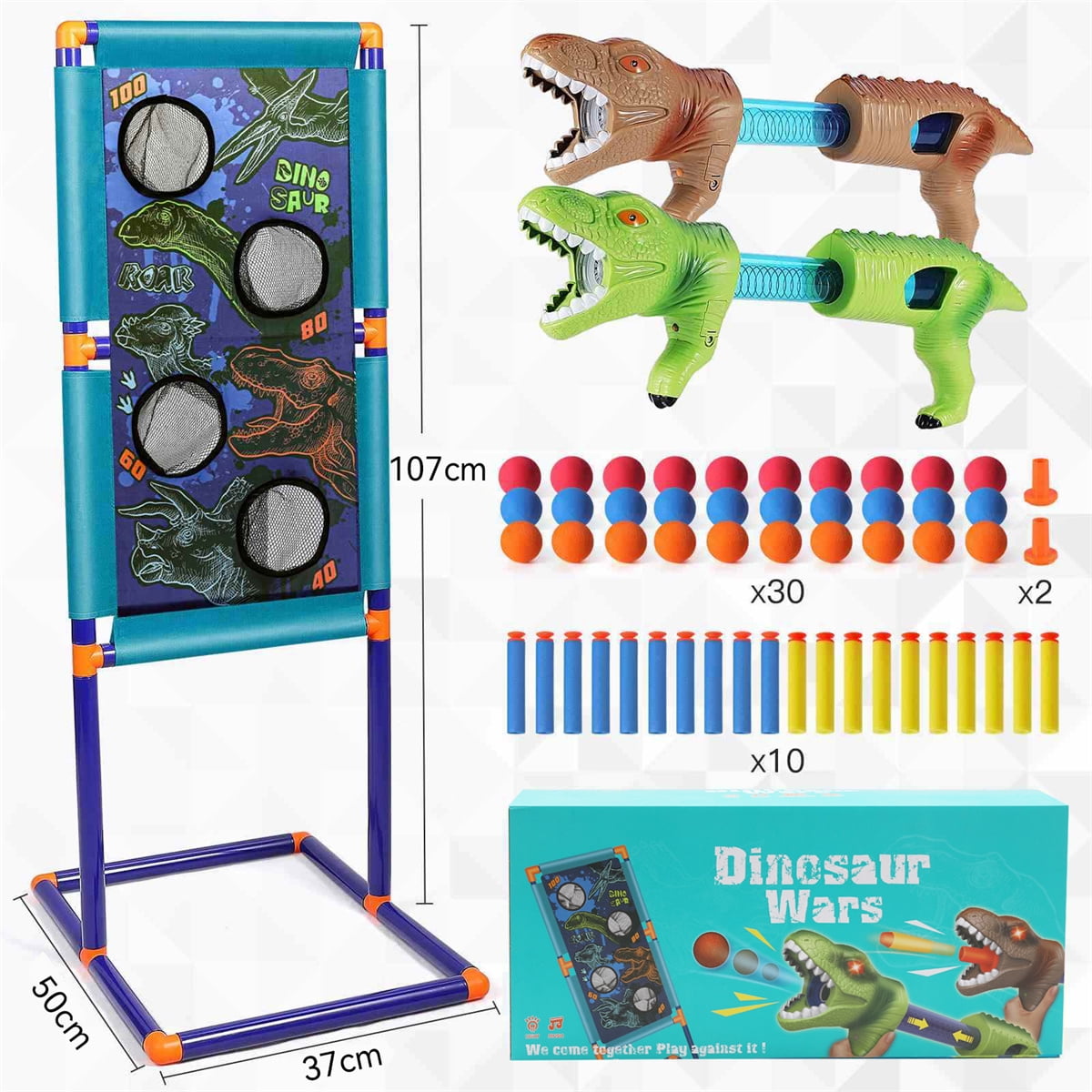 【Shooting Game Outdoor Toys】The kit includes 2 pack dinosaur air blasters, 30 soft foam balls, 20 official darts, 2 bullet adapters and 1 dinosaur-themed standing shooting target. Whether play independently or as a team against each other, it’s flexible enough to meet all your needs. Good choice for indoor & outdoor activities 【Dinosaur Design Kids Toys】Vivid T-Rex dinosaur shaped gun and dinosaur-themed standing target will bring kids into a fantastic Jurassic World. Press the button on the head of dinosaur to light up the eyes and press the trigger to make a realistic dinosaur roaring sound. All those dinosaur related elements give your children endless fun 【Easy to Operate Educational Toys】Each air-powered gun blaster can hold 9 foam balls, fire them into different scoring pockets to get as many points as possible. Kids can change launch head and shoot with soft darts. The shooting target is easy for kids to put together. This dinosaur game help improve hands-on and spatial perception 【High-Quality & Safe Crafts】Made of high-quality, non-toxic and recyclable ABS plastic. Firm structure ensures that the gun can withstand the air impulse without falling apart. The very light-weighted sponge balls do no damage to their targets — household items, and people, even the kids can battle each other with the foam balls 【Ideal Kids Birthday Gifts】The dinosaur shooting game play set is incredibly fun and well-packaged, so it’s perfect to be served as a boy or girl birthday and holiday gift for Easter, Thanksgiving, Christmas, New Year Eve and so on. We highly recommend this dino toy gift for kids age 4-5 & age 6-8 and let them stay away from electronics