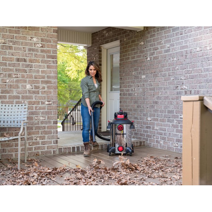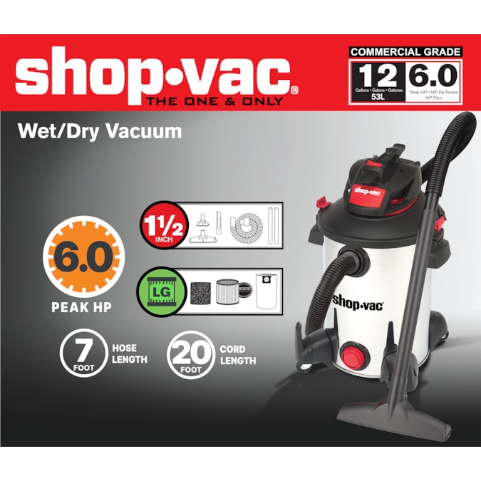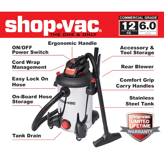 - The Shop-Vac® 12 Gallon* 6.0 Peak HP** Stainless Steel Wet / Dry Vacuum features a durable, easy to clean, stainless steel tank – This vacuum provides you with powerful cleaning for picking up wet or dry messes in your garage, workshop or basement – You can aAttach the hose to the rear blower port to blow dirt out of those hard to reach places in your workspace or grass clippings from your sidewalk.