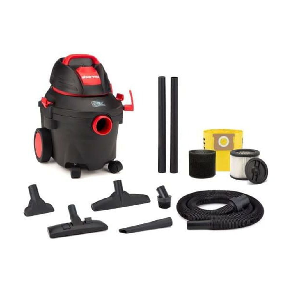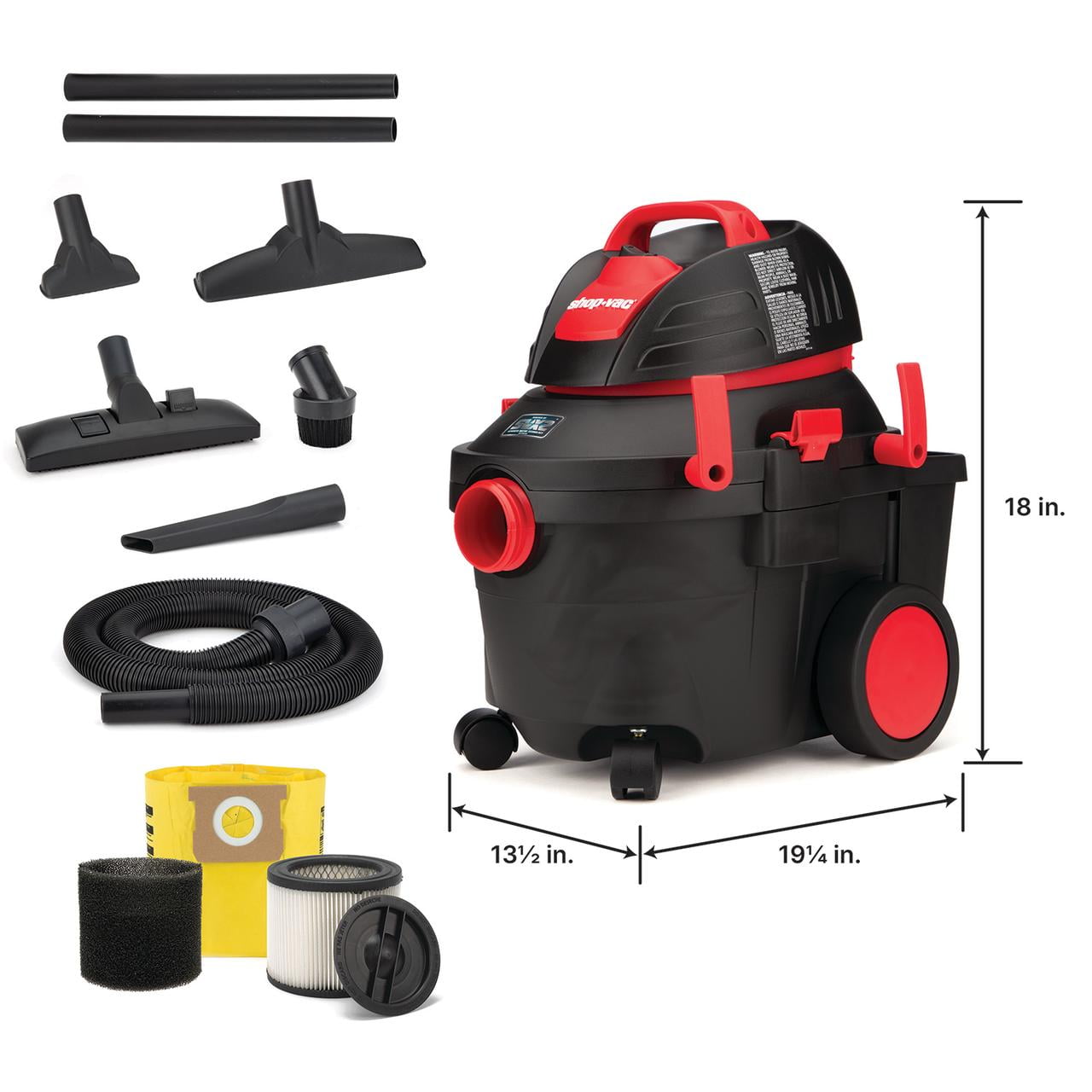 Shop-Vac 4 Gallon 5.5 Peak HP Wet Dry Vacuum with SVX2 Motor Technology, Model 5914411 New 4 Gallon Poly Tank 5.5 Peak Horse Power SVX2 motor technology 20-foot cord length Rear blower port 8-foot by 1.50-inch diameter lock-on hose two 1.50-inch diameter extension wands (91995) dual surface selector nozzle (91968) 12-inch wet/dry nozzle (91991) crevice tool (91996) gulper nozzle (91914) round brush (91997) onboard tool storage Small Cartridge Filter (90398, Type AA) Small Foam Sleeve (90526, Type CC) High Efficiency Disposable Filter Bag (91964, Type D) Backed by the Shop-Vac Limited Lifetime Warranty.