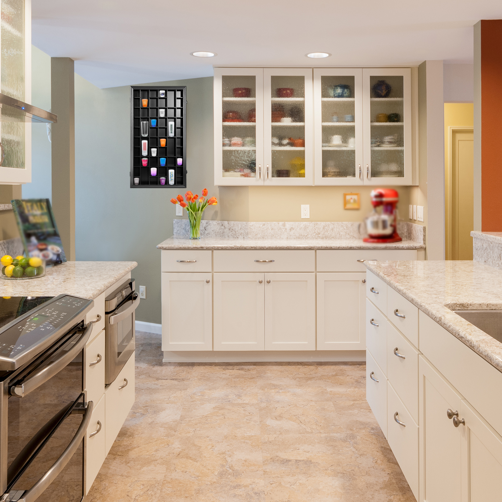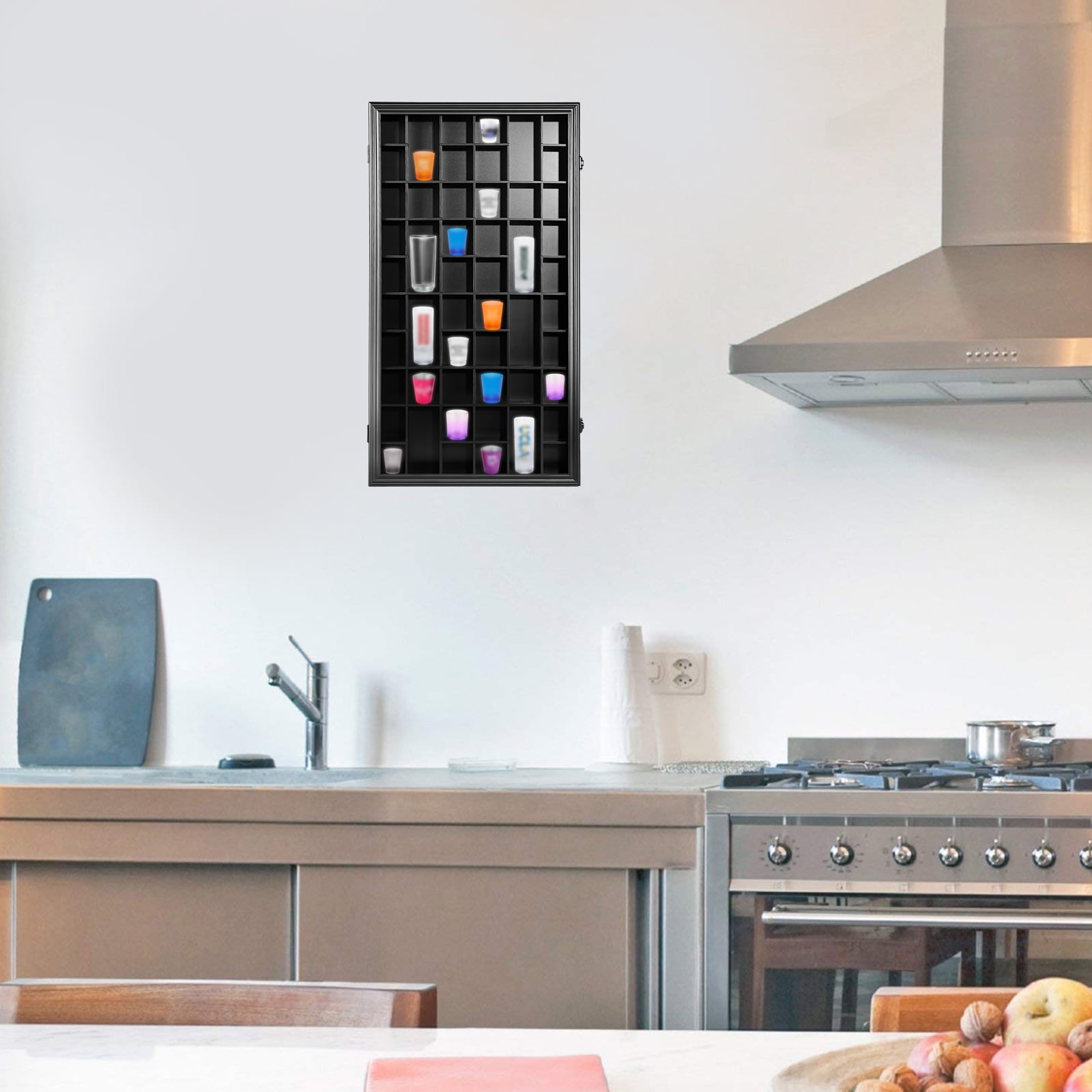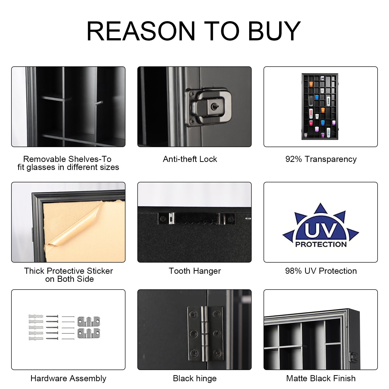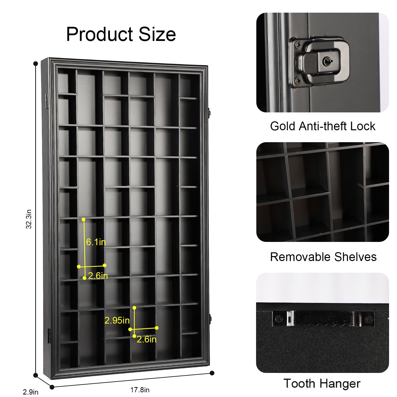 EXTERIOR DESIGN: Matte black wood finish for durability and longevity. The black anti-theft locks and hinges and 92% clarity acrylic panels not only maintain the overall consistency of the frame, but also provide excellent protection for your cherished glass collection. SIZE: The outside dimensions of this shot glass display case are 32.5 ” x 17.9 ” x 2.9 ”. Inside, each small compartment measures 2.95 x 2.6 x 1.96 inches; the large compartment measures 6.1 x 2.6 x 1.96 inches. All compartments hold a total of 52 wine glasses. PROTECT & DISPLAY COLLECTIONS: Highly transparency acrylic panels not only display your treasures visually and clearly, but also provide 98% UV protection to keep your treasured glasses from yellowing and fading under direct sunlight. Tooth hooks on the back panel and matching hanging accessories help you to better display your precious shot glasses. Removable shelves accommodate different glass sizes. (Note: Shot glasses are not included) SPECIAL GIFT – The Shot Glass Display Case is perfect as a thoughtful gift for family, friends and that special someone who enjoys collecting glasses during various holidays or birthdays. The classic and durable design is practical and functional, able to protect glasses while displaying treasured glasses and serving as a unique piece of home décor. PACKAGING PROTECTION – The shot glass display box is surrounded by foam and protected. The acrylic panels are protected by thick stickers on both sides to prevent as many scratches as possible to the acrylic panels in transit.