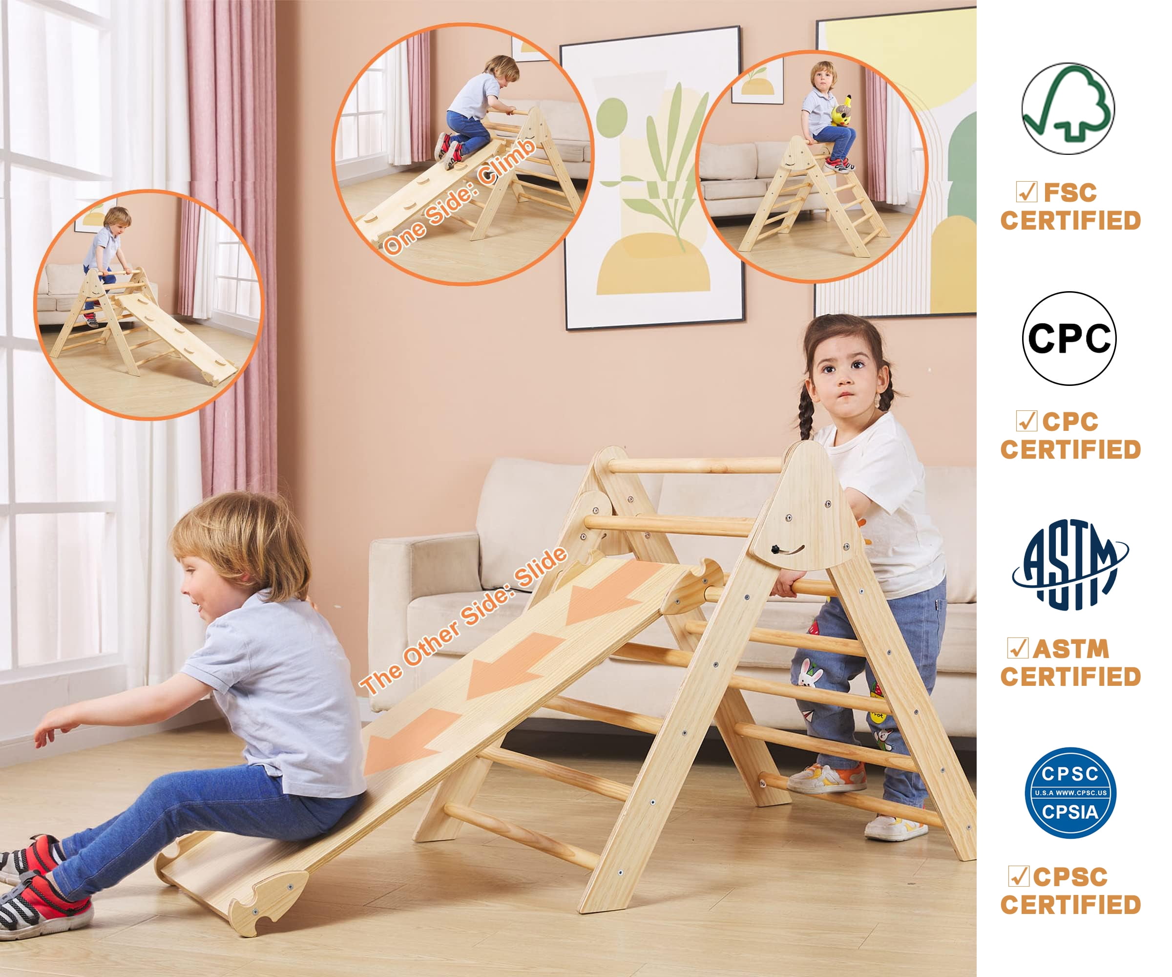SHWWQUE Foldable Pikler Triangle Climbing Set for Kids is a versatile and fun climbing toy designed for children aged 12 months to 6 years old.otal, but has at least 8 amazing functional play. Play and Exercise: This climbing set is perfect for use in small spaces, such as apartments or playrooms, and can be used both Indoors and Yard. Overall, the Indoor Foldable Pikler Triangle Climbing Set for Kids is a great investment for parents looking to provide their children with a fun and engaging way to stay active and develop their physical abilities. It is also a great way to encourage imaginative play and creativity, as children can use the climbing set as a fort, a bridge, or any other structure they can imagine. BRING THE PLAYGROUND HOME Don’t let weather dictate when your kids can go to the park to run around. Rain or shine, this indoor slide is ready to deliver hours of fun at the snap of a finger! The elegant modern design makes it very beautiful, no toddler can refuse it. Give kids even more opportunities to have fun. Let your children play and grow in a safe environment. POP UP THE FUN! Instantly turn any room into a play area! Lightweight and portable, take this toddler slide with you wherever you go and keep your young ones entertained for hours. Who said playing indoors is boring?! Encourage children to explore more ways to play and enhance their imagination. 3-IN-1 MONTESSORI TODDLER CLIMBING TOYS INDOOR Climbing ladder, tent, ramp, rocker four-in-one, saving space. Let your children freely choose their favorite items for entertainment, increase their physical fitness and balance, exercise hand-foot coordination, and enhance family affection.