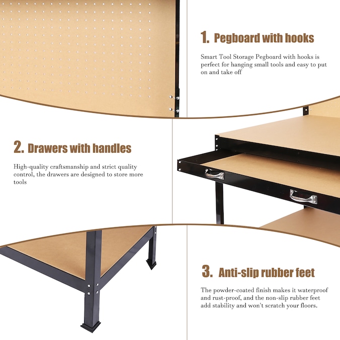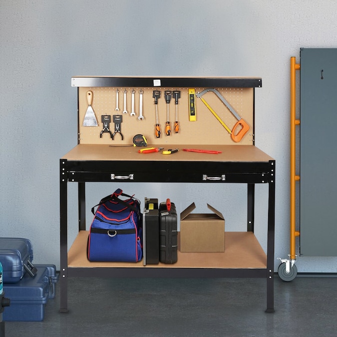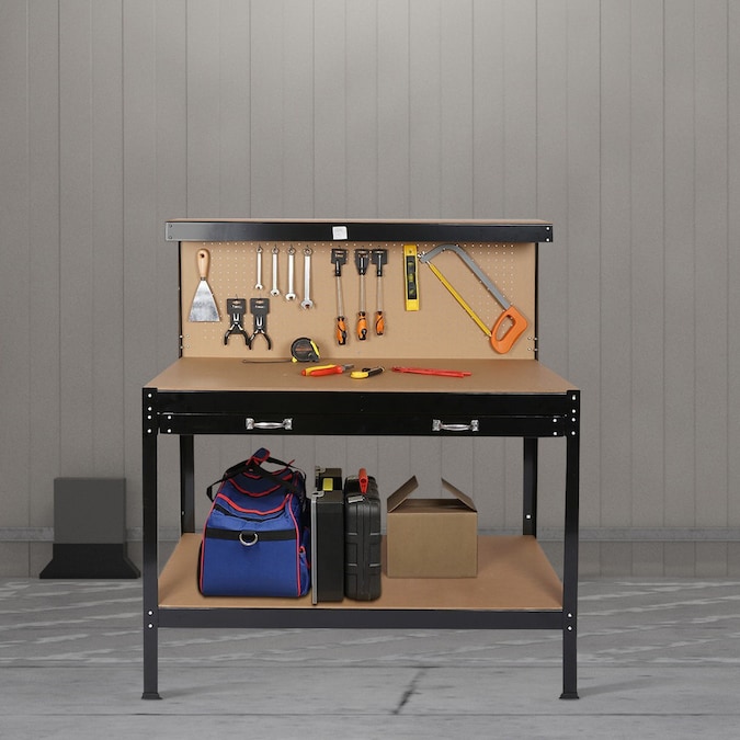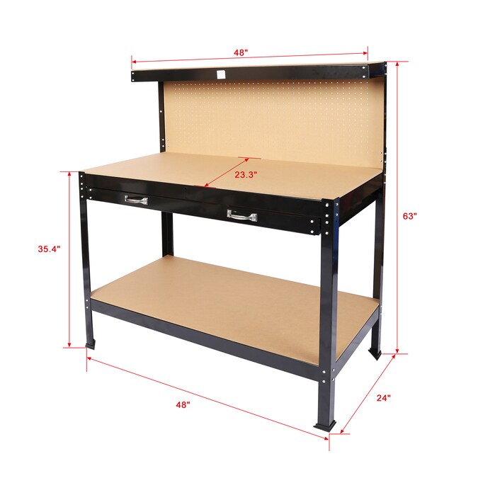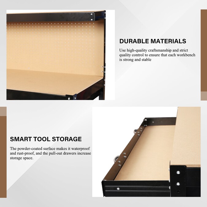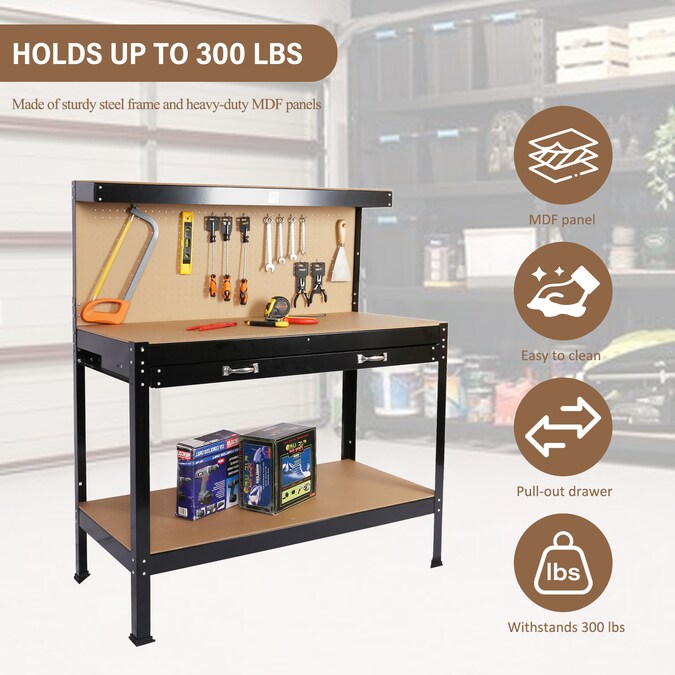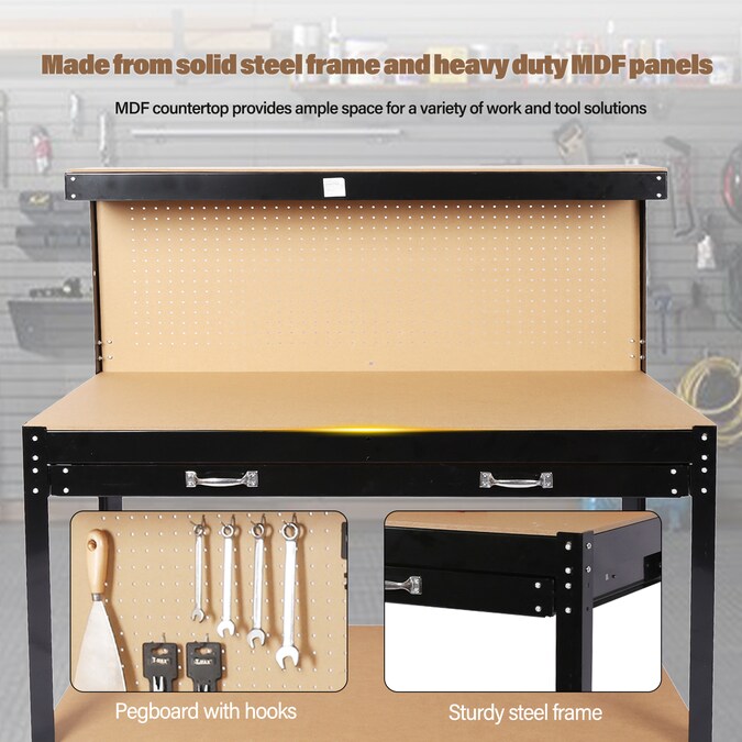 - Made of solid steel frame and heavy duty MDF panel, high quality craftsmanship and strict quality control are used in the manufacturing process to ensure that each workbench is sturdy and stable enough to hold up to hard use in the workshop; The work surface can handle the heavy load of tool storage, holds up to 300 lbs.