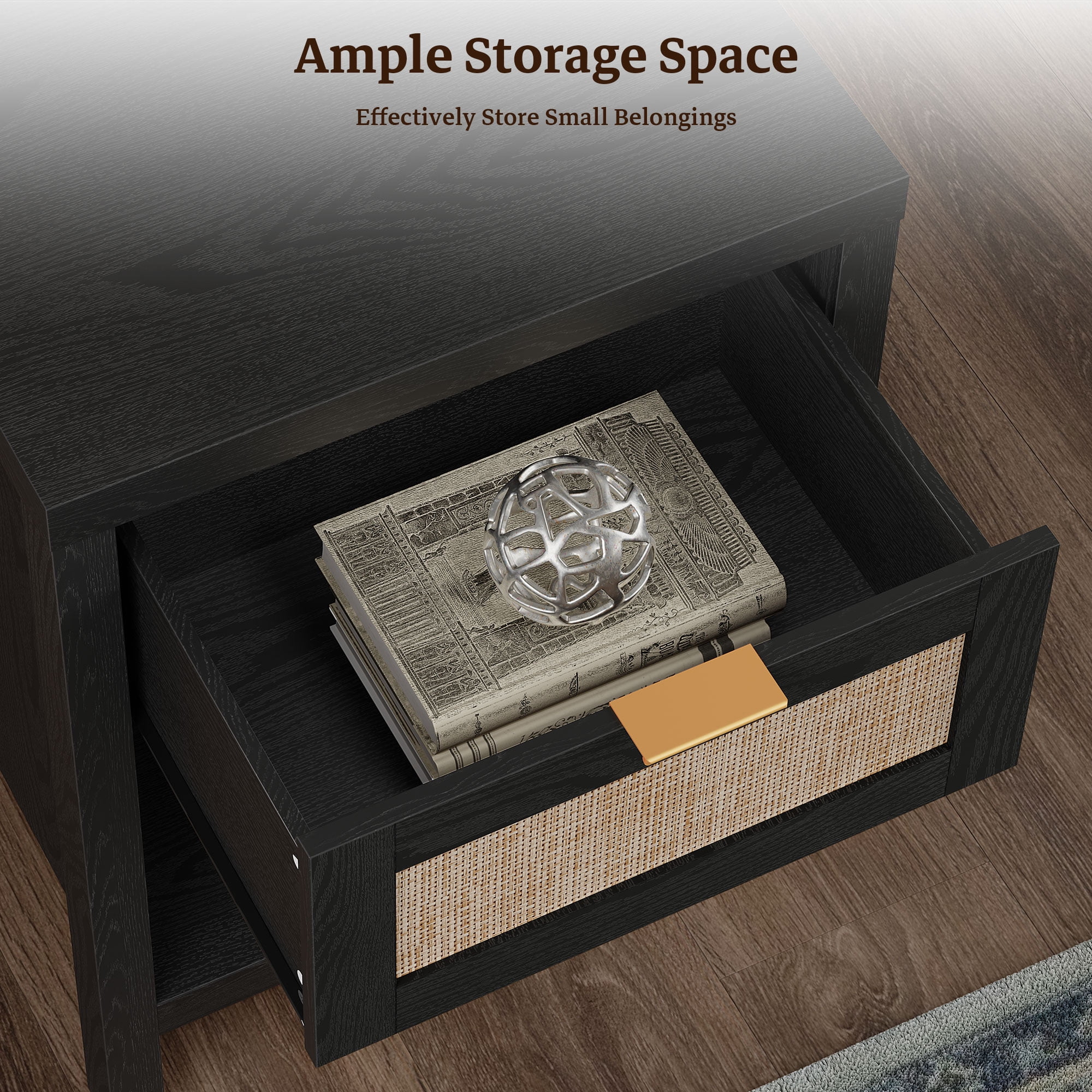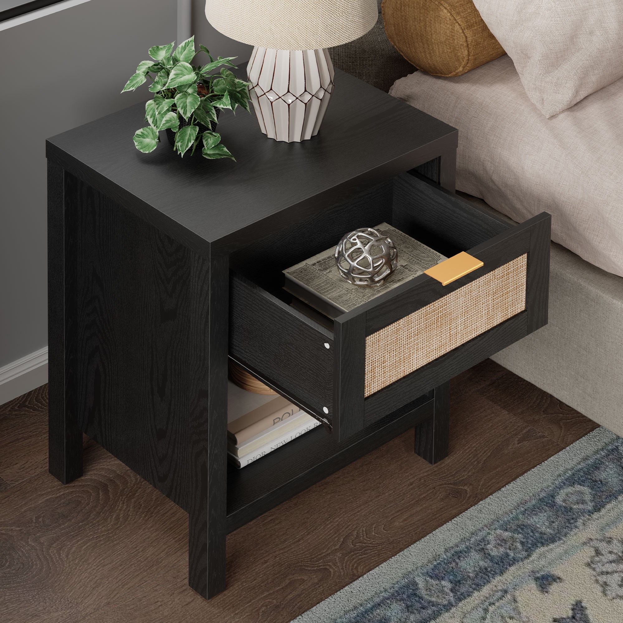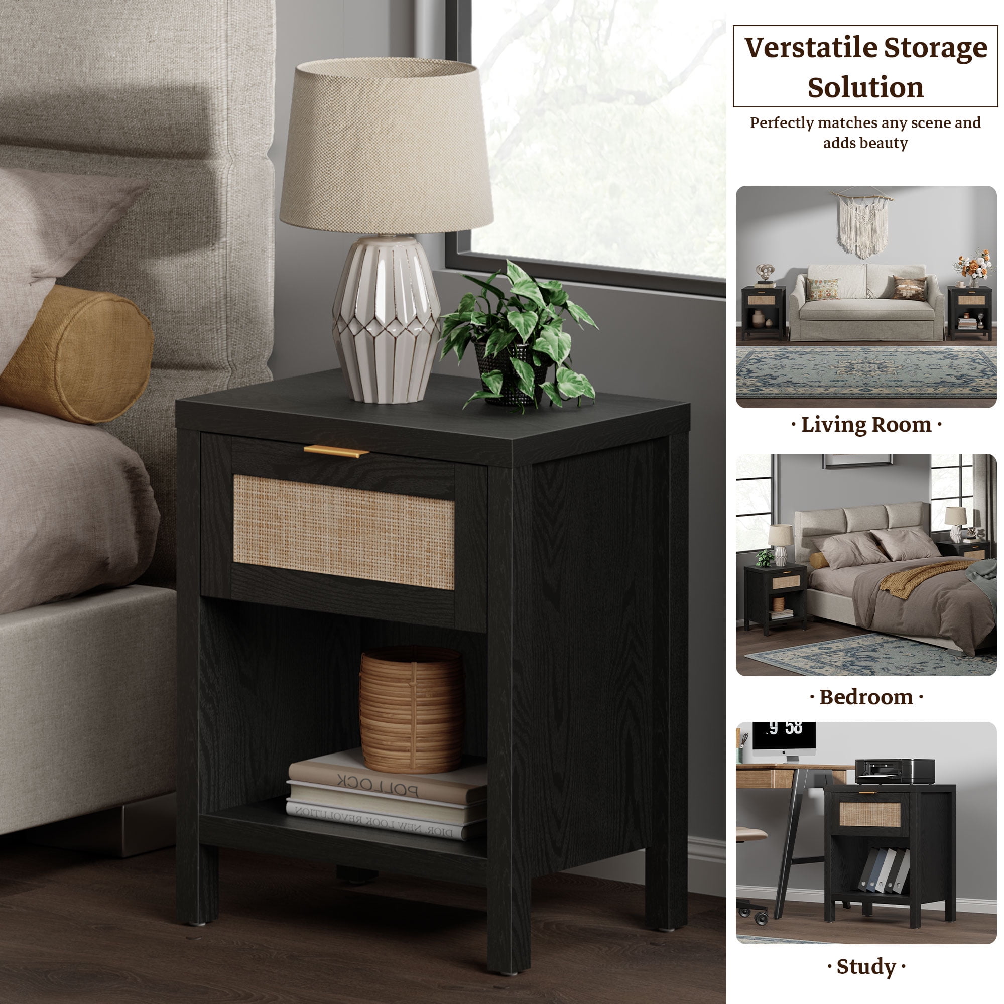 This farmhouse-inspired rattan nightstand set of 2 is the perfect addition to your modern home. Crafted with durable oak wood boards, plastic, and metal, these nightstands feature a drawer and open shelf for convenient storage. The black finish adds a rustic touch, while the stable and heavy-duty construction ensures long-lasting use. Versatile in design, these nightstands can be placed as bedside tables or end tables, seamlessly blending with your home’s decor. Easy to assemble, this set is a practical and stylish solution for your bedroom or living room.