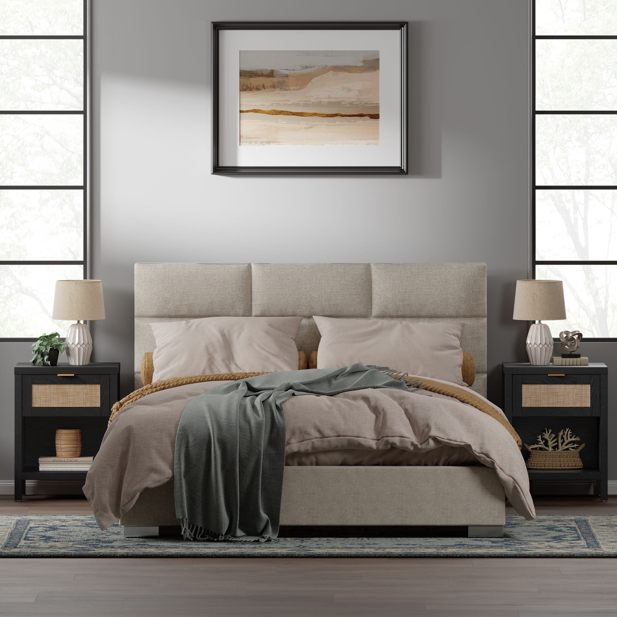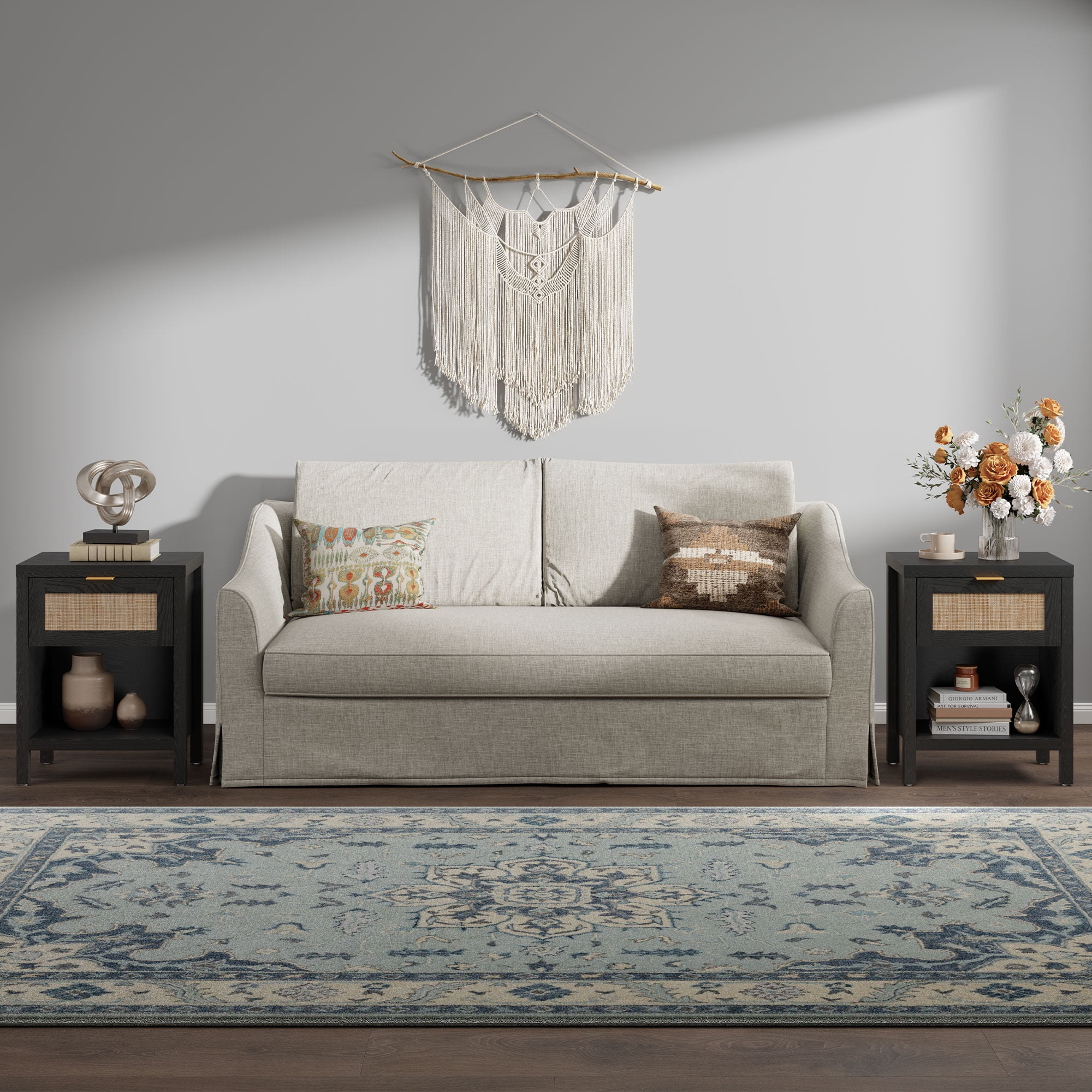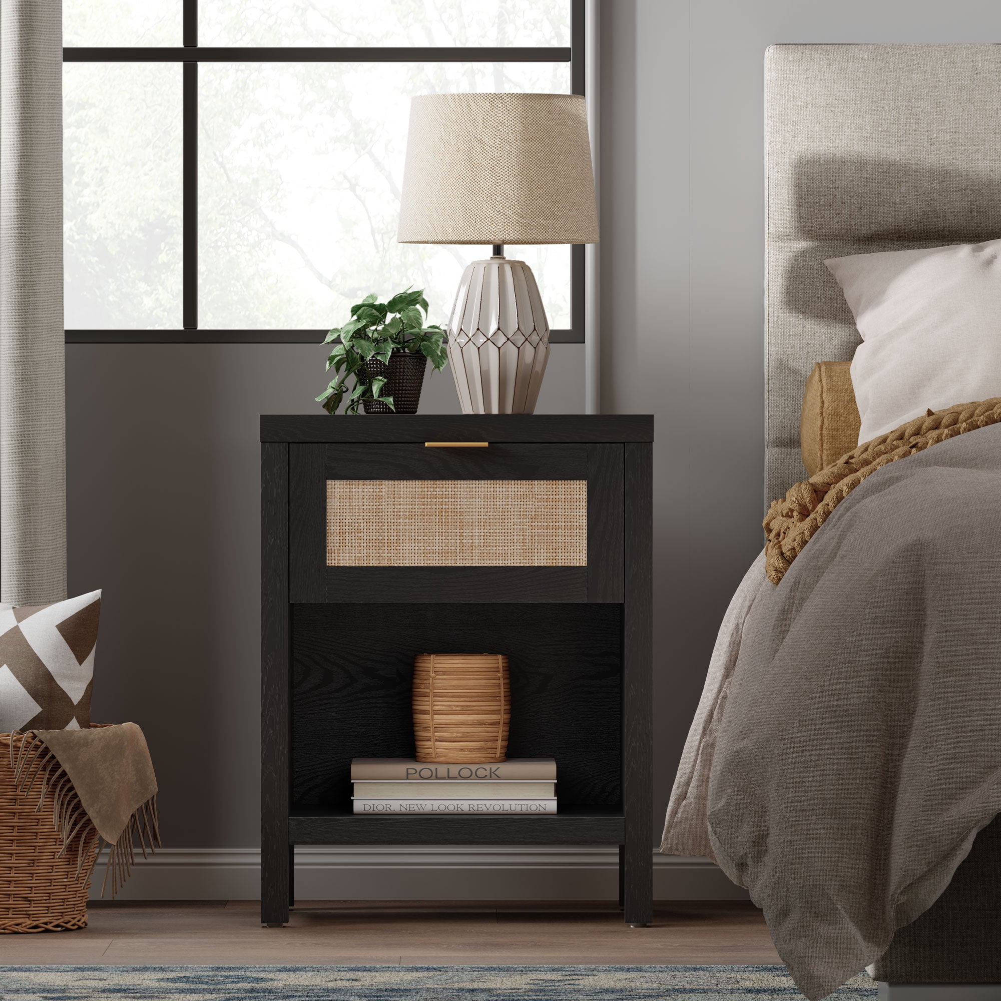 This farmhouse-inspired rattan nightstand set of 2 is the perfect addition to your modern home. Crafted with durable oak wood boards, plastic, and metal, these nightstands feature a drawer and open shelf for convenient storage. The black finish adds a rustic touch, while the stable and heavy-duty construction ensures long-lasting use. Versatile in design, these nightstands can be placed as bedside tables or end tables, seamlessly blending with your home’s decor. Easy to assemble, this set is a practical and stylish solution for your bedroom or living room.