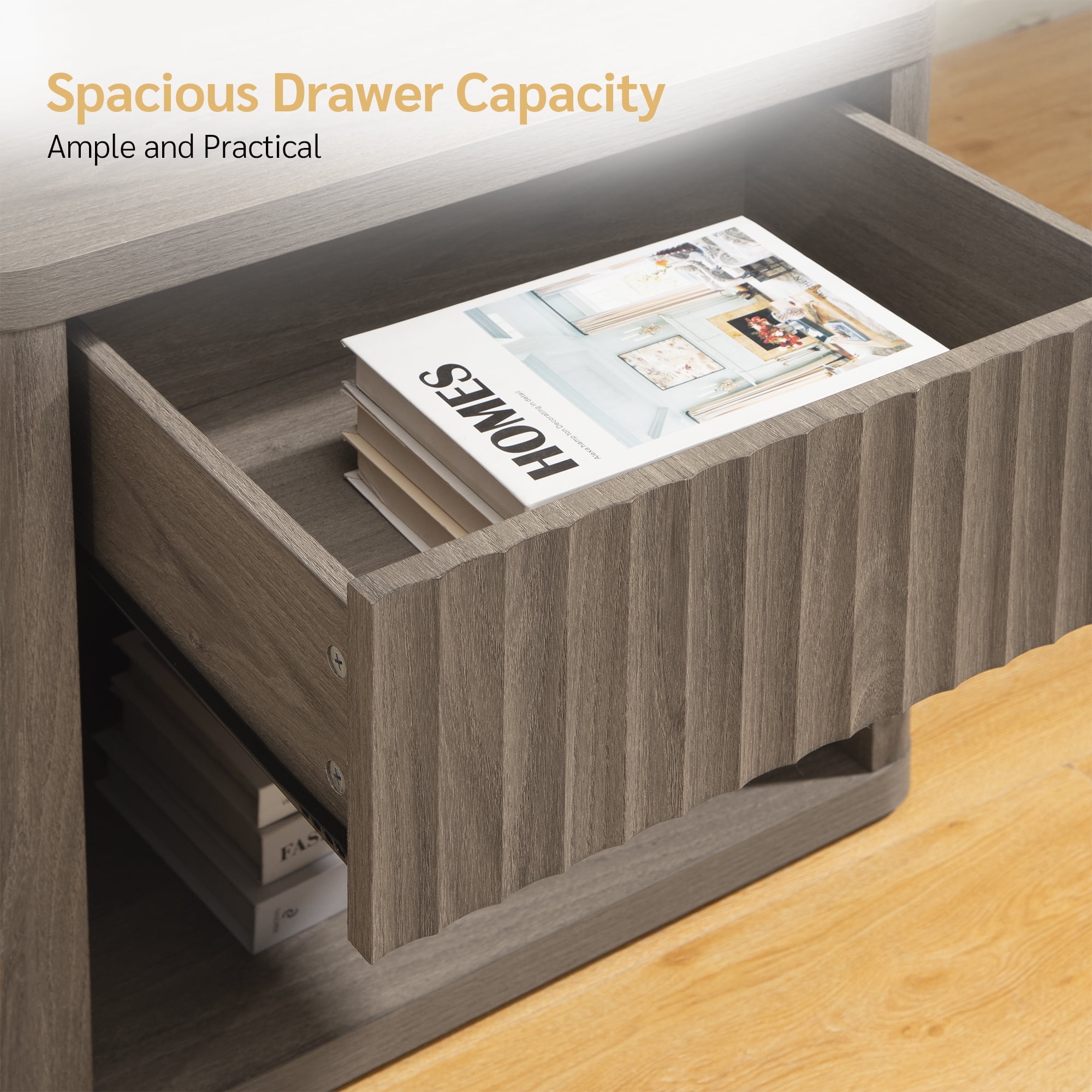 Enhanced Size and Spacious Design – Overall dimensions: 22.7″W x 15.4″D x 24.1″H. Our generously sized nightstand offers abundant storage space for all your bedside essentials. Whether it’s books, reading glasses, electronic devices, or personal items, this nightstand provides ample room to keep them organized. Featuring a roomy desktop, a large drawer, and an open compartment, our bedside table ensures that your belongings remain neatly arranged and easily accessible. Sleek & Functional Design – Our bedside table showcases a minimalist curved profile and features a drawer with a distinctive waveform panel, effortlessly combining modern aesthetics with practicality. Its chic appearance effortlessly complements a range of bedroom styles, from contemporary to mid-century modern. Designed with smooth lines and rounded corners, it ensures safety for both kids and families, while also serving as a standout piece that enhances the ambiance of your room. Robust & Long-lasting – Constructed with a reinforced, top-grade MDF board and equipped with scratch-resistant and water-repellent surfaces, our end table is meticulously crafted to withstand everyday wear and remain a dependable companion for years to come. Its sturdy build guarantees stability and durability, ensuring that it remains a practical and enduring addition to your bedroom. Furthermore, this side table is solid and odor-free, providing you with peace of mind as you place it next to your bed. Versatile Usability – This two-tier nightstand serves not only as an exceptional bedside table in bedrooms but also as an excellent end table or side table complementing your sofa, couch, or armchair in your living room, hallway, or office. Moreover, it seamlessly doubles as a toy storage solution in nurseries. Its clean and refined aesthetic elevates the ambiance of any room it adorns, adding a touch of elegance and sophistication. Hassle-Free Assembly – Our nightstand comes with clear and detailed assembly instructions, ensuring effortless setup without any complications. We prioritize the satisfaction of our customers, offering professional and dedicated customer service throughout your purchase journey. If you have any inquiries or concerns, please don’t hesitate to reach out to us. Our team is readily available to provide you with prompt and satisfactory solutions to all your queries.