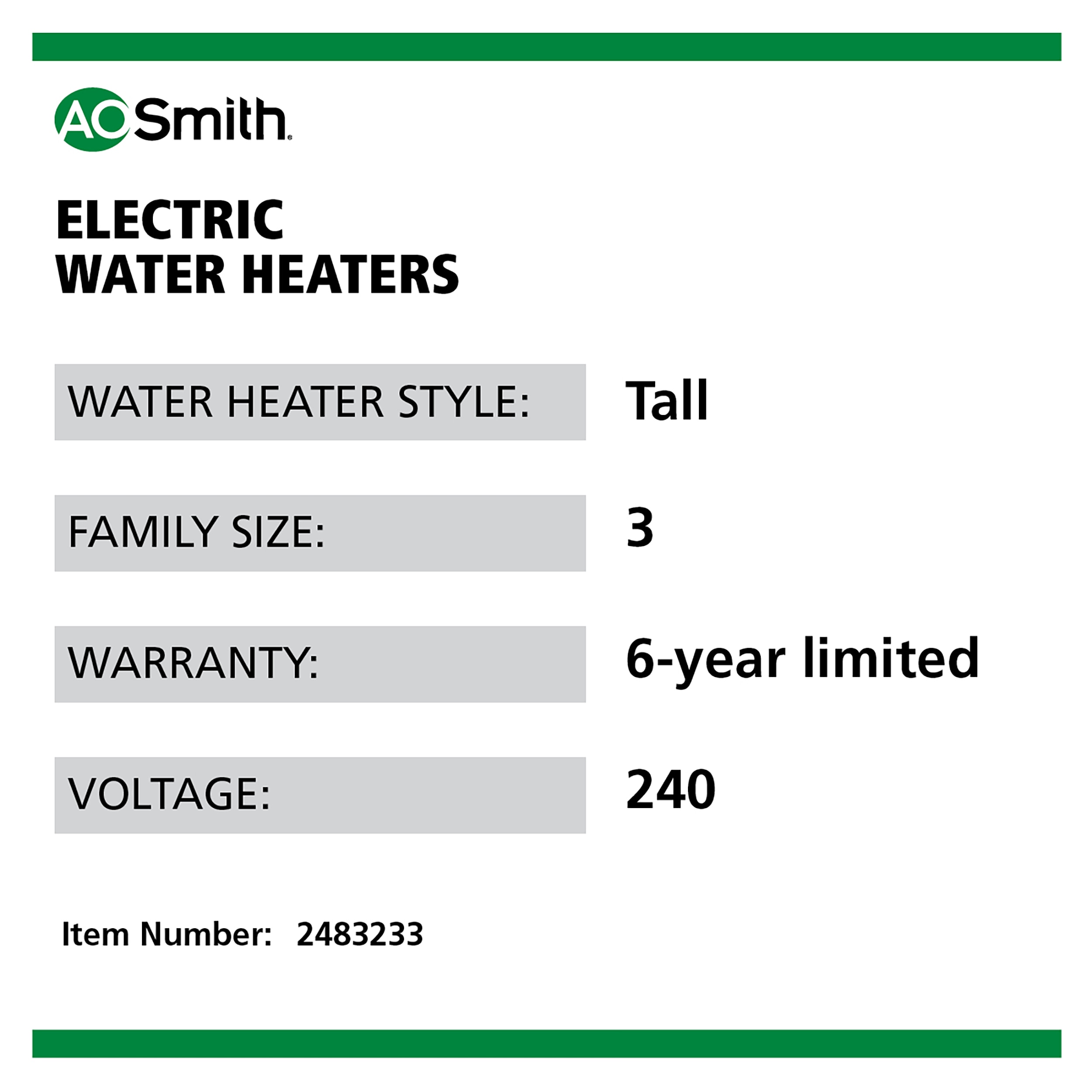 A. O. Smith’s Signature 100 Series 40-Gallon Electric Water Heater is designed to provide efficient and reliable hot water for households with 2 to 3 people when sized appropriately. Designed to last, it features dual copper heating elements, a protective anode rod and a ceramic fused tank shield to reduce corrosion and provide ultimate tank protection. It also has a self-cleaning dip tube to help prevent sediment build-up and extend the overall life of the water heater. This added protection comes with a 6-year limited warranty to give you additional peace of mind. Want to save money on your energy bills? This electric hot water heater operates at a 0.92 Uniform Energy Factor (UEF) which can reduce your energy consumption compared to less efficient models. Call 1-877-GOLowes to get this water heater installed.