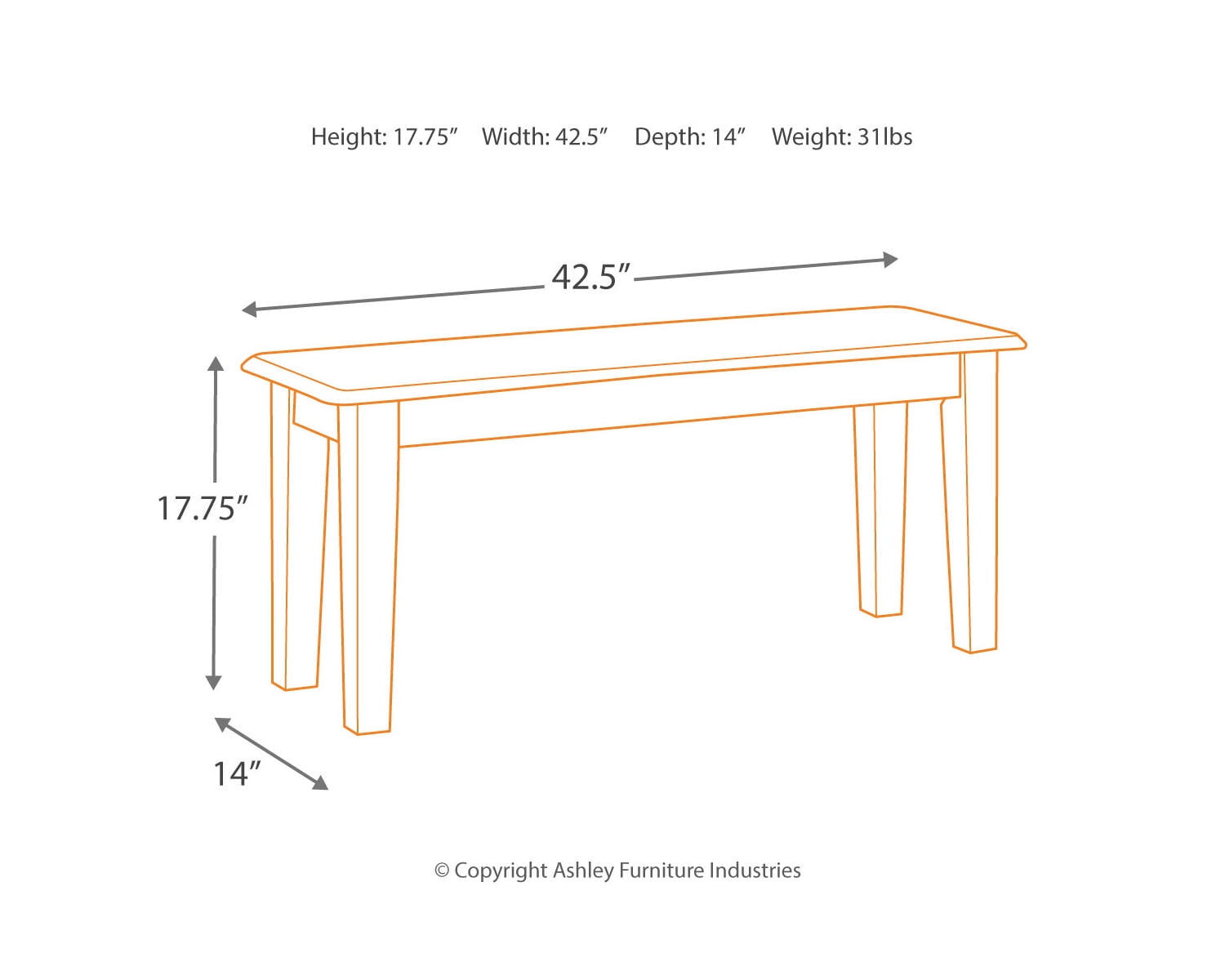 Made of wood, veneers and engineered wood Rustic hand-applied finish Assembly required LONG BENCH: Measuring 42.5” W x 14” D x 17.75” H, this bench is great for narrow entry ways, eat-in kitchen areas or dining room tables EASY ASSEMBLY: Instructions, hardware and tools included