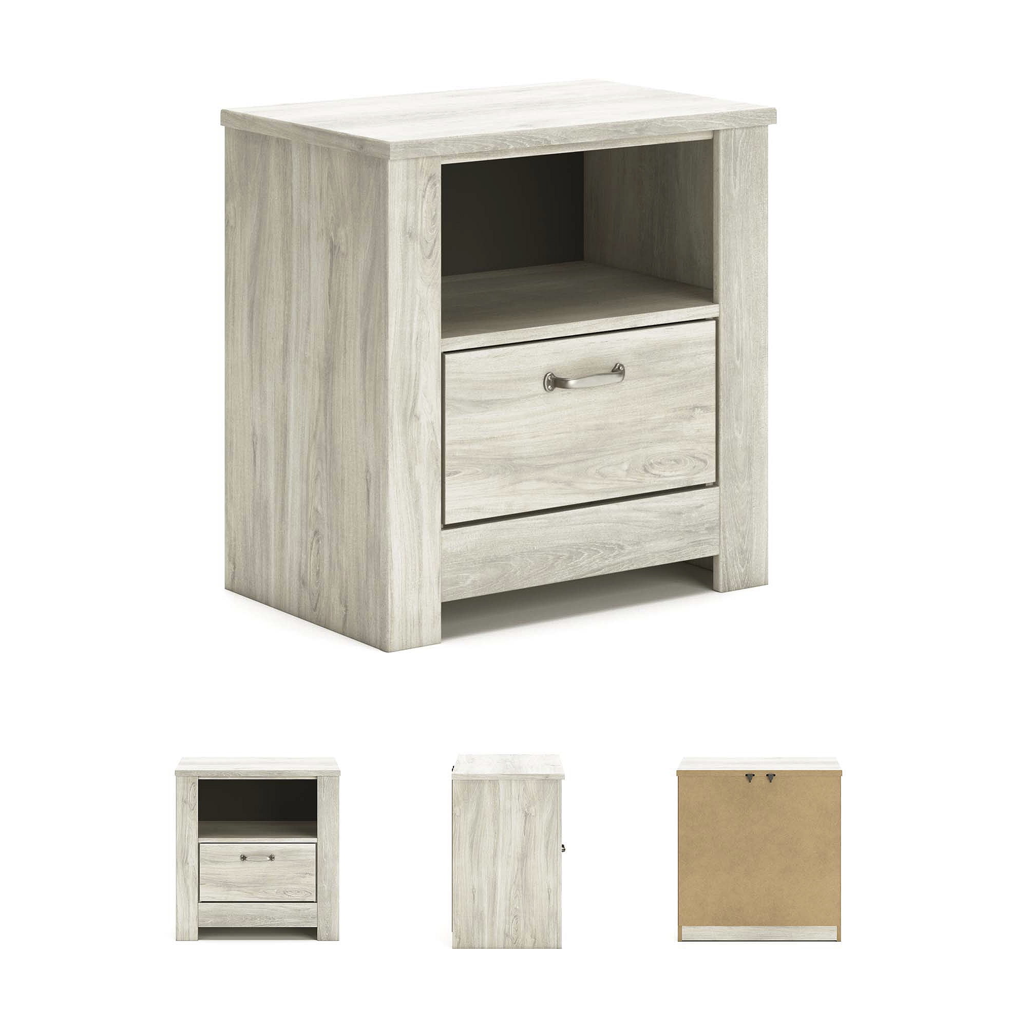 Your bedroom isn’t just a room. It’s a canvas. Express your farmhouse style with the Bellaby nightstand. Wispy white finish over replicated oak wood grain brightens up the space with charm. Brushed nickel-tone handles with black edging finesse the piece with a bit of shine. Drawer is spacious and lined with faux linen laminate to hold your belongings with care. This clean-lined profile is the perfect authentic foundation for inviting decor.