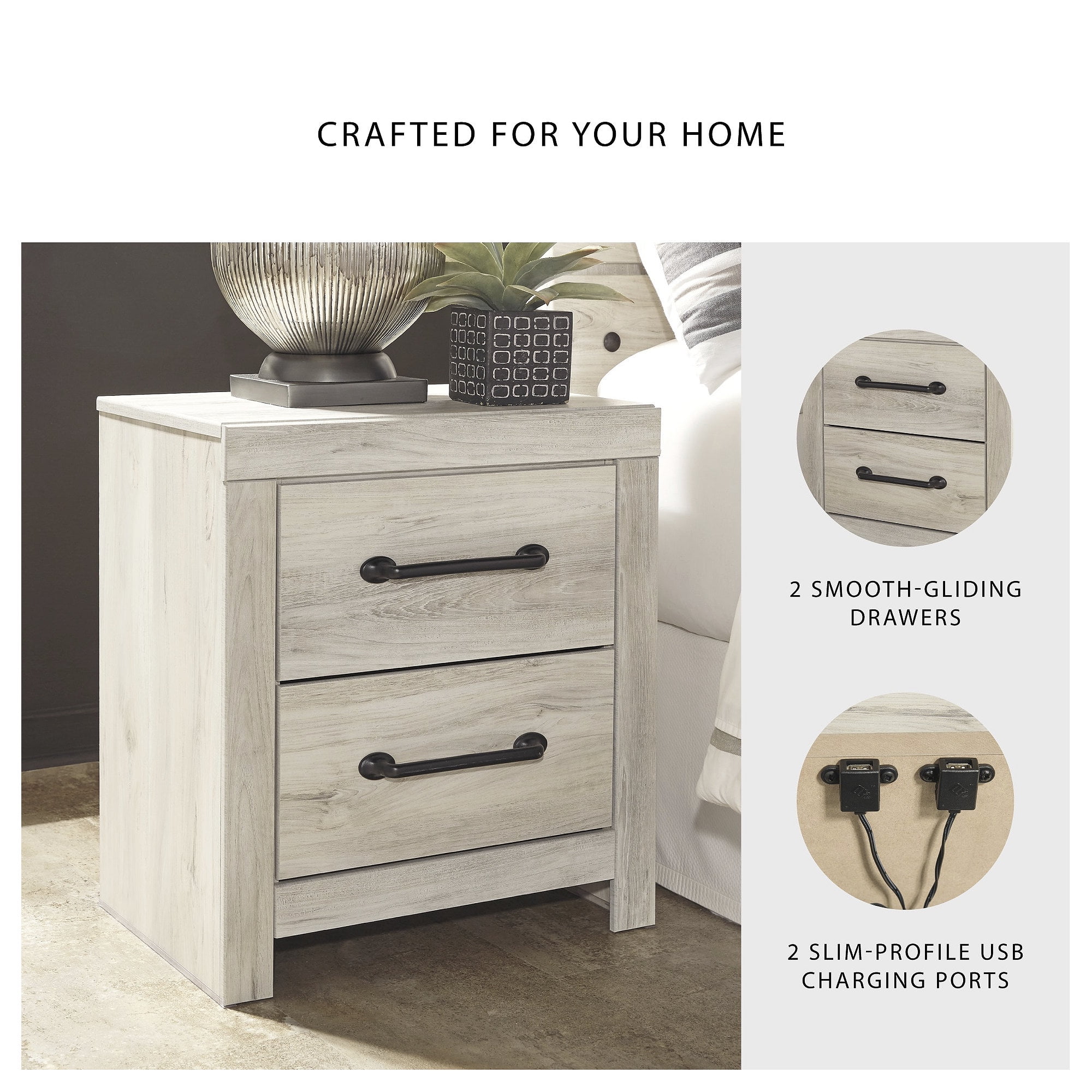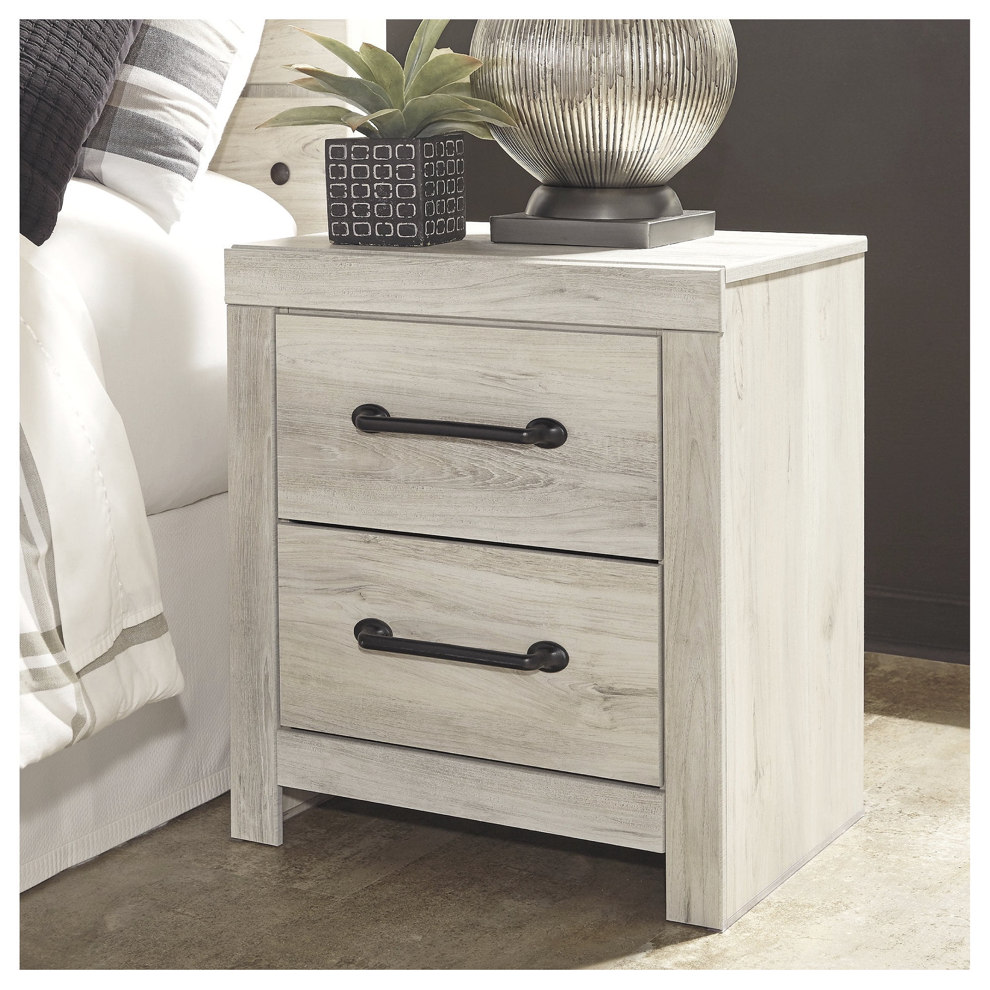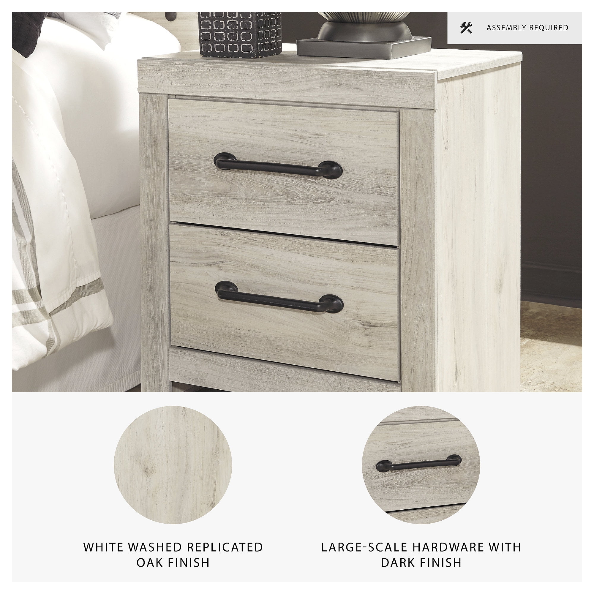 Made of engineered wood and decorative laminate Wispy white finish over replicated oak grain with authentic touch Dark-tone industrial hardware 2 smooth-gliding drawers Drawers lined with faux linen laminate for finished aesthetic