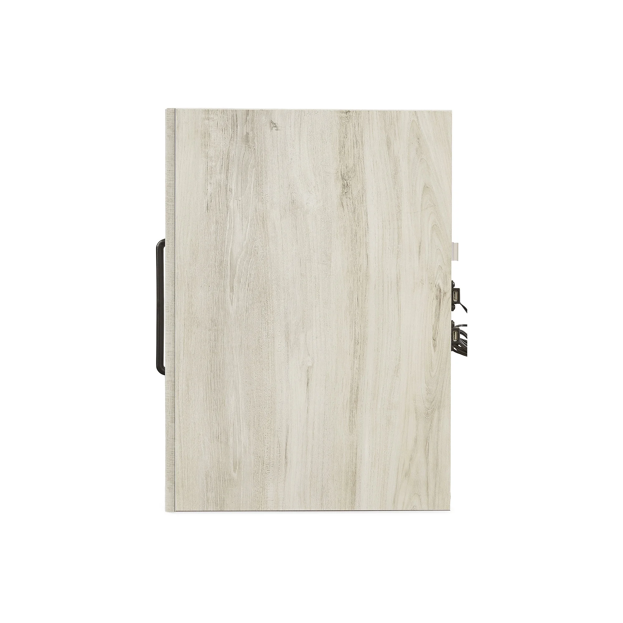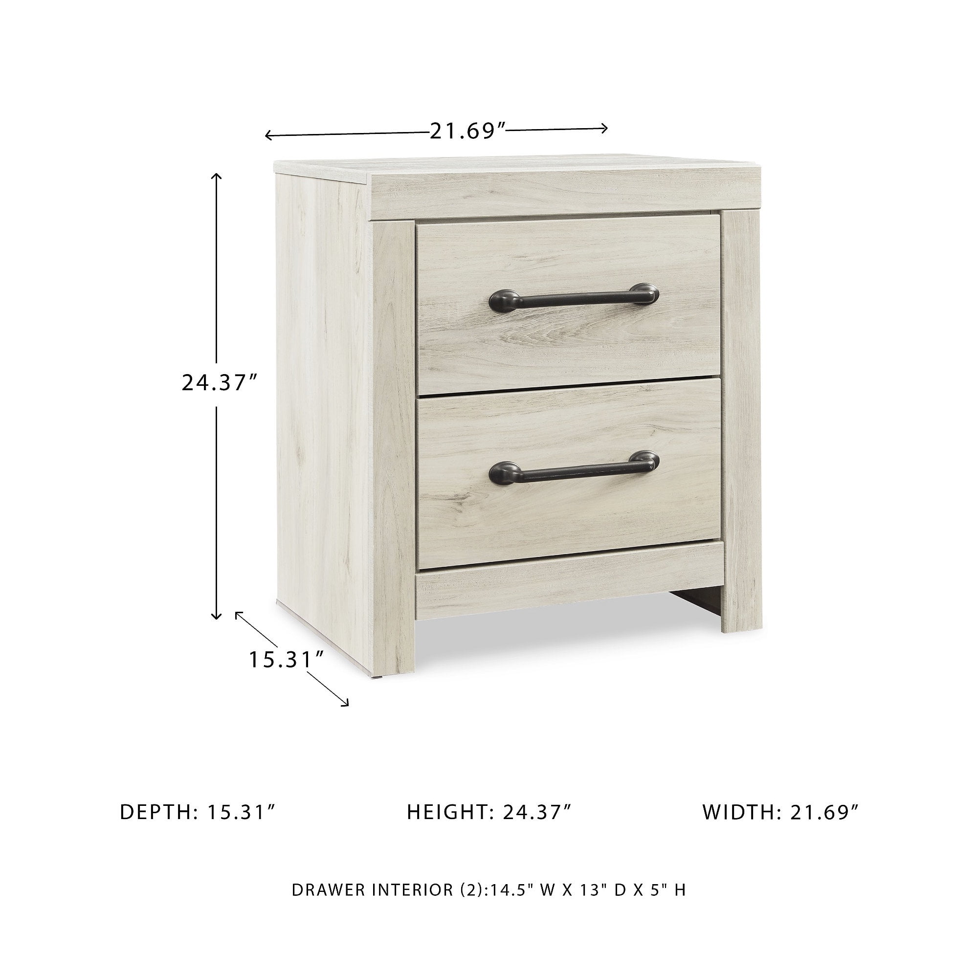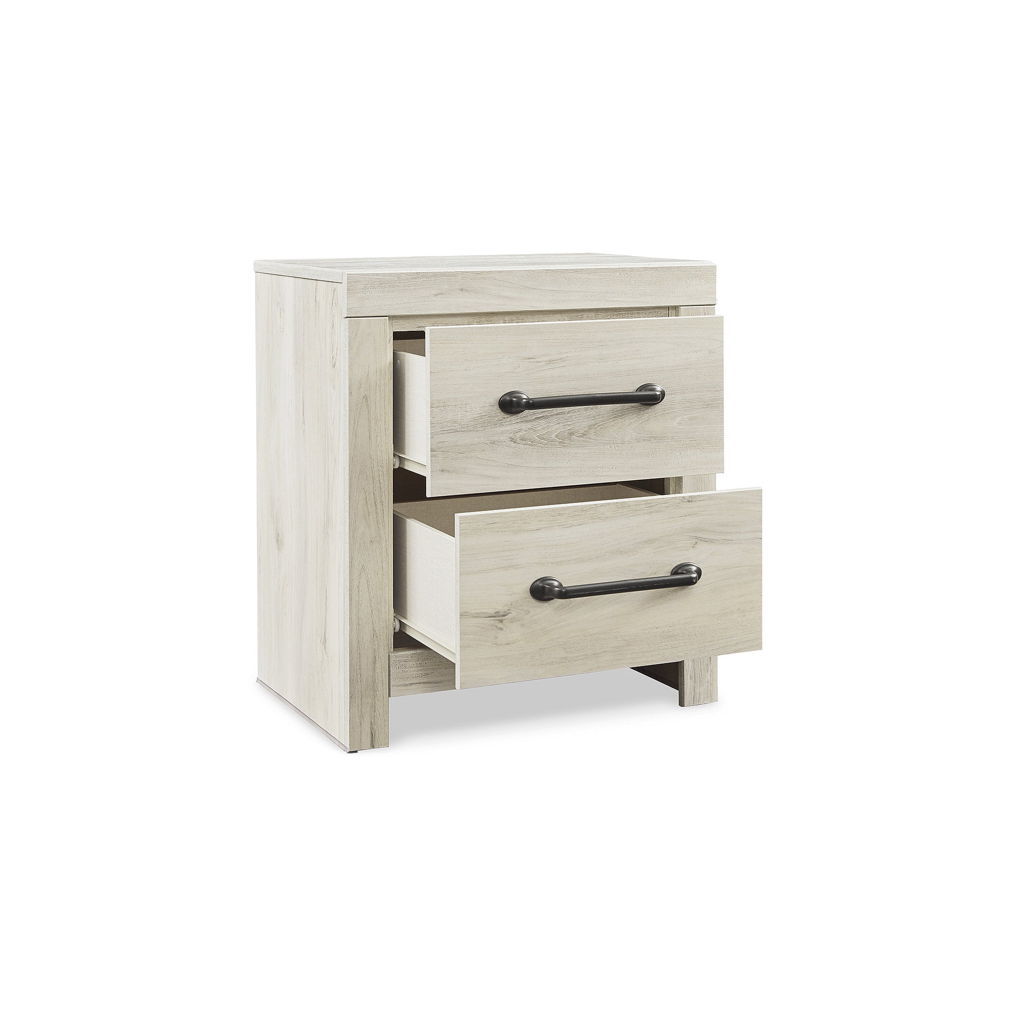 Made of engineered wood and decorative laminate Wispy white finish over replicated oak grain with authentic touch Dark-tone industrial hardware 2 smooth-gliding drawers Drawers lined with faux linen laminate for finished aesthetic