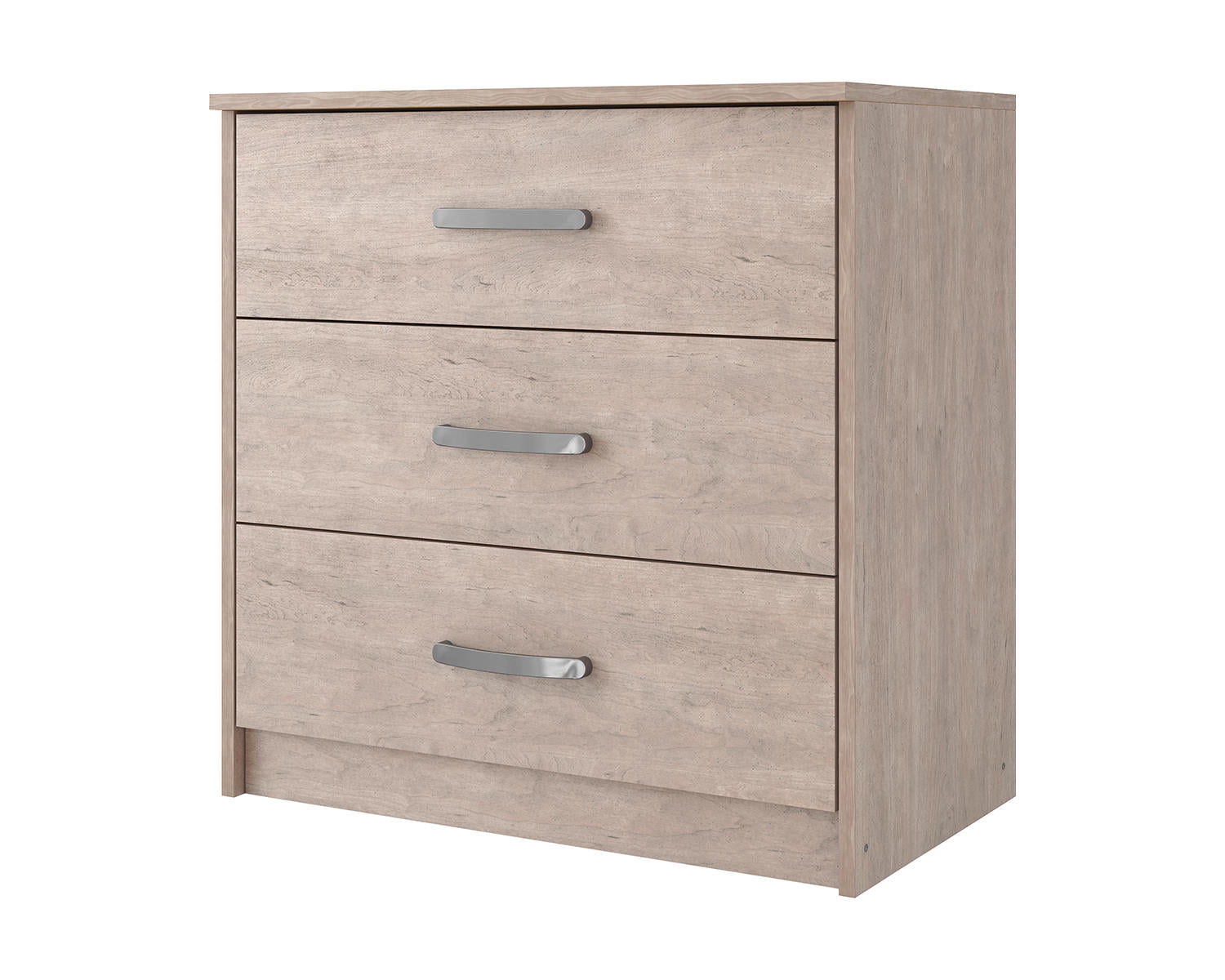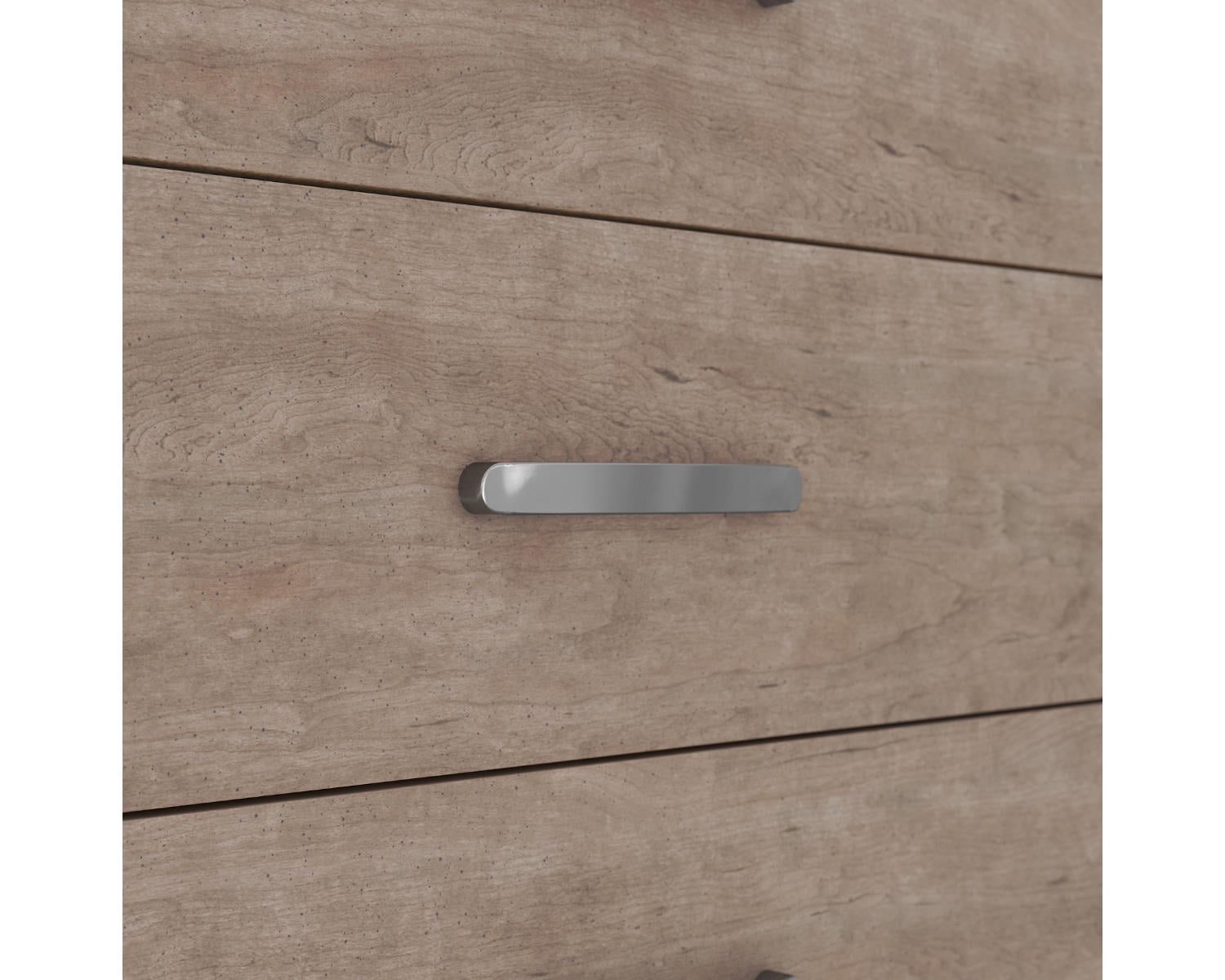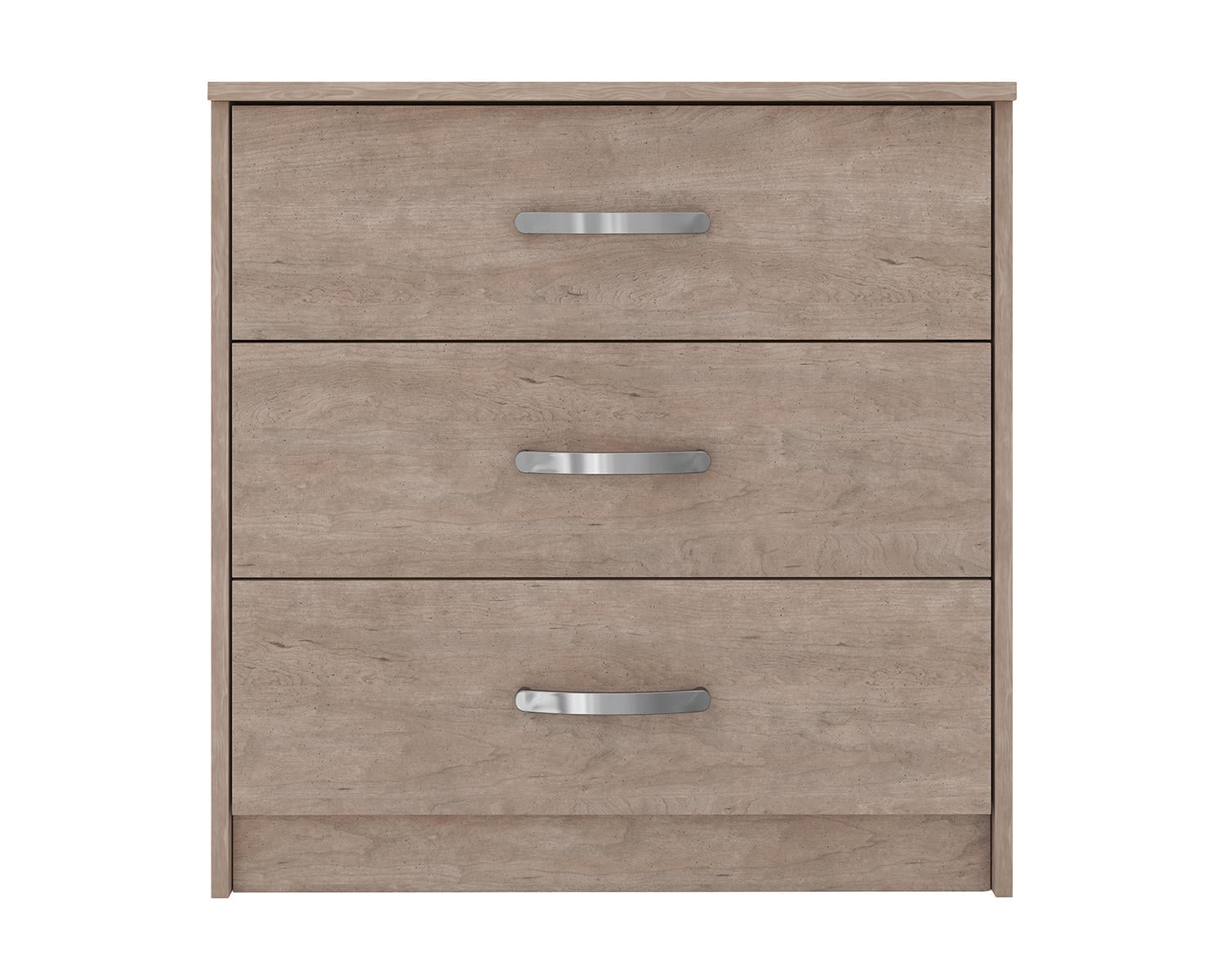 Made of engineered wood and decorative laminate Warm gray vintage finish with subtle pearl effect over replicated cherry grain Satin nickel-tone hardware 3 smooth-gliding drawers Vinyl wrapped drawer sides and back for durability