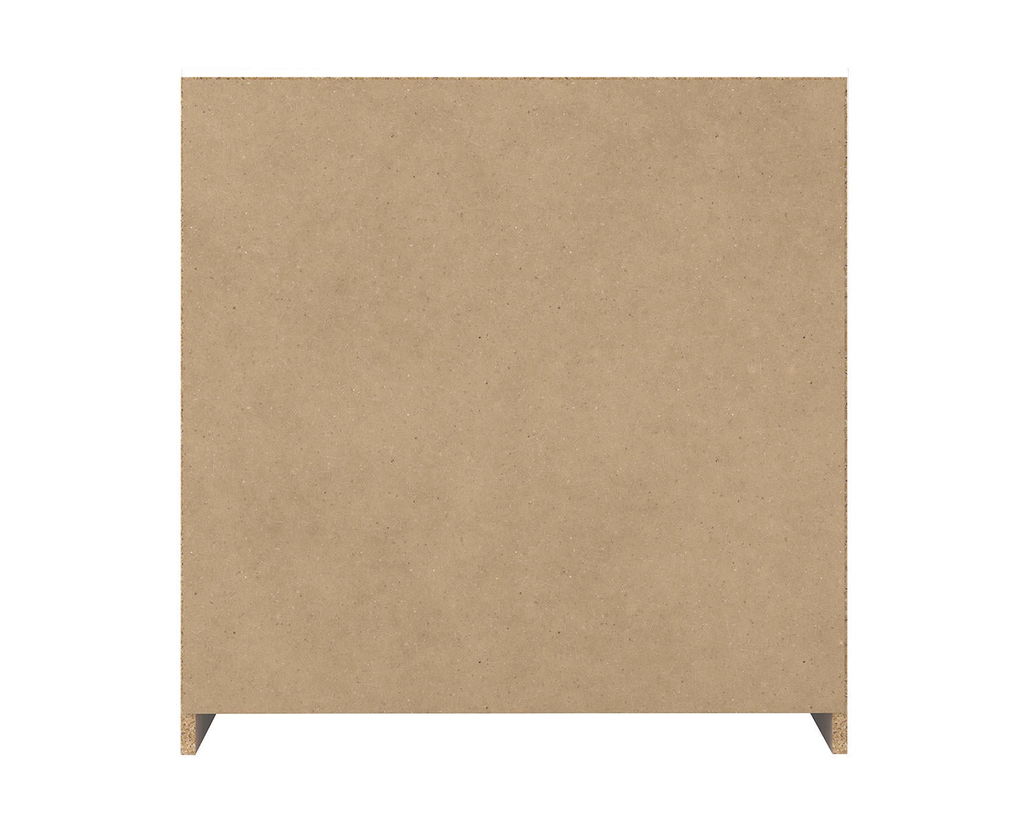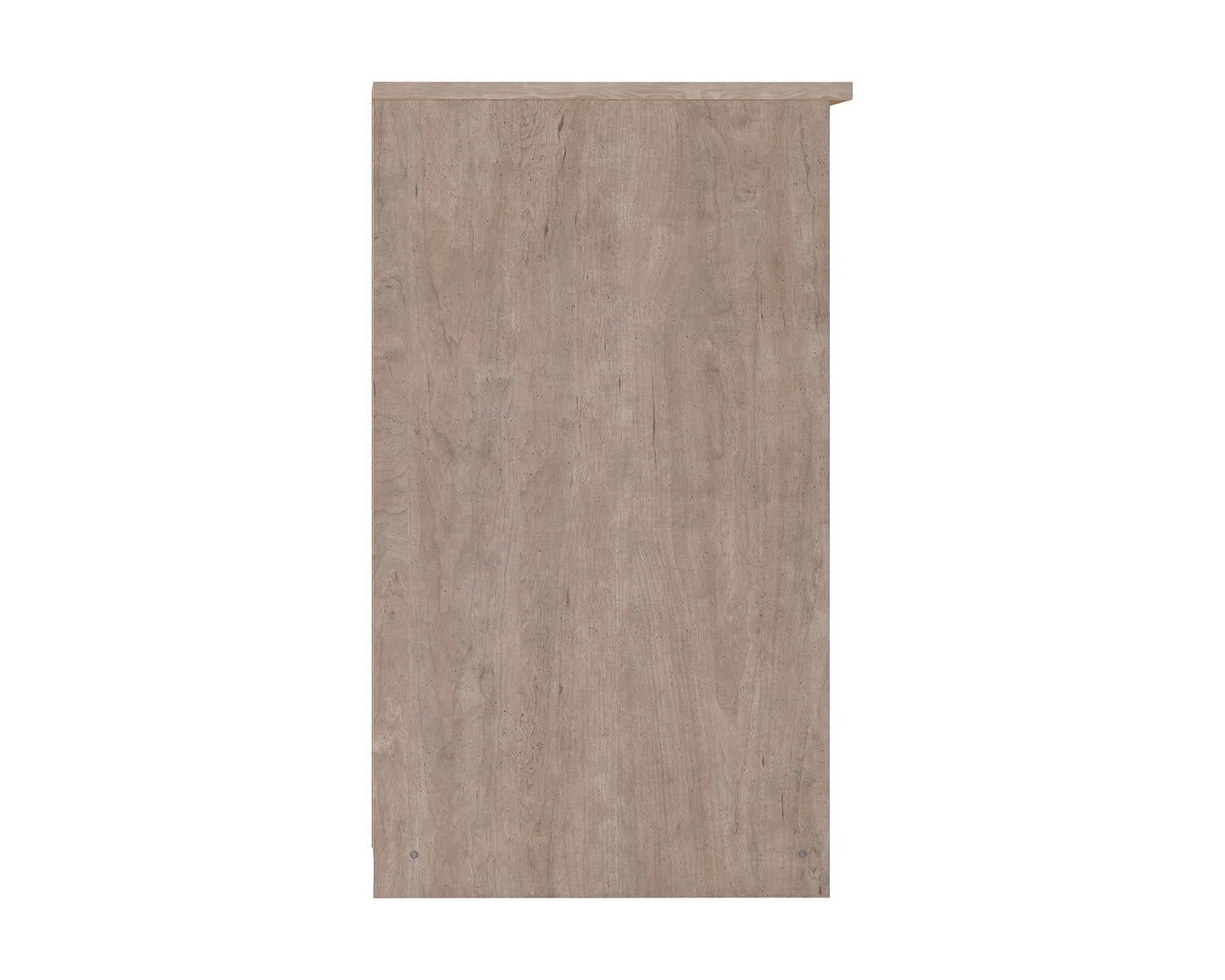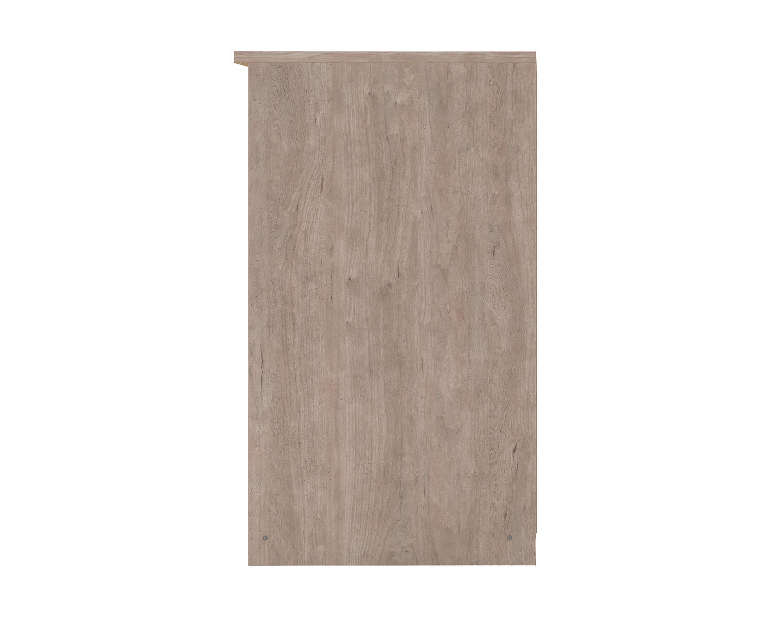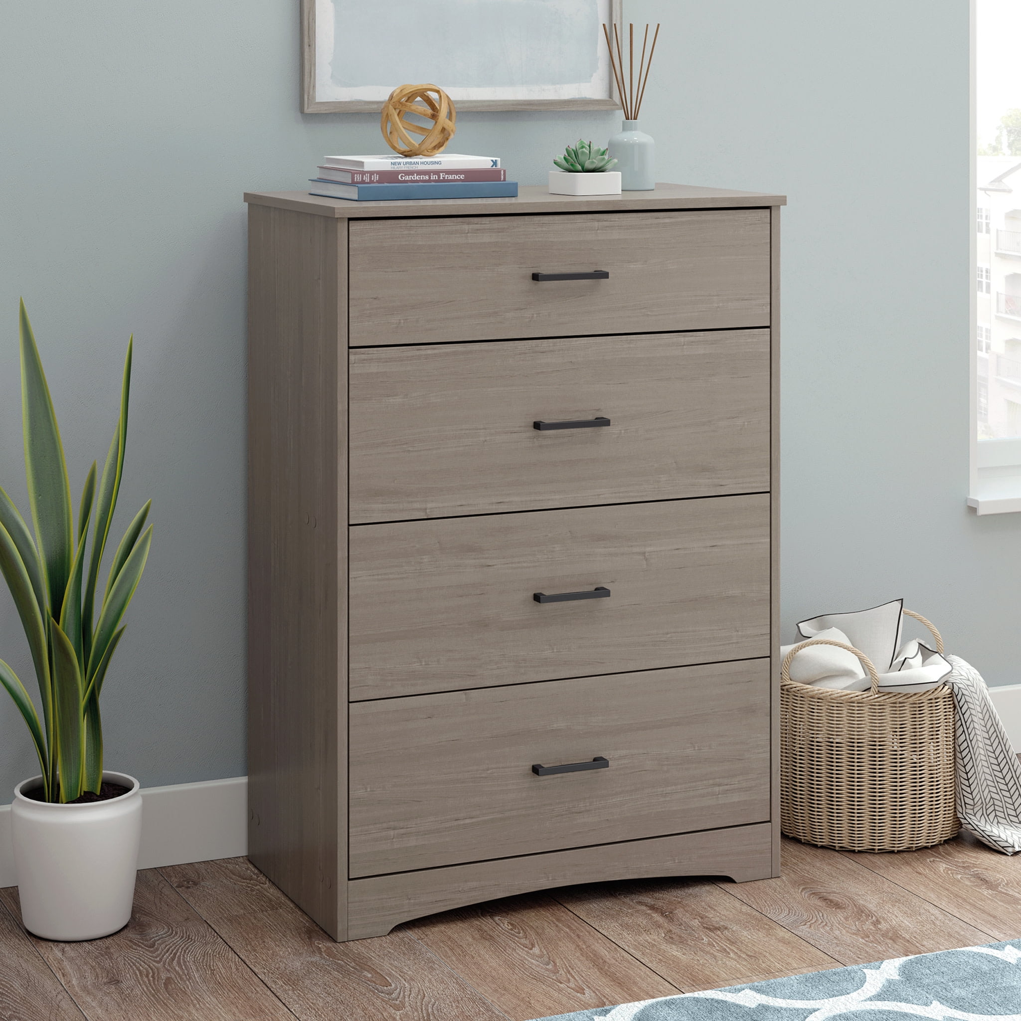 Made of engineered wood and decorative laminate Warm gray vintage finish with subtle pearl effect over replicated cherry grain Satin nickel-tone hardware 3 smooth-gliding drawers Vinyl wrapped drawer sides and back for durability