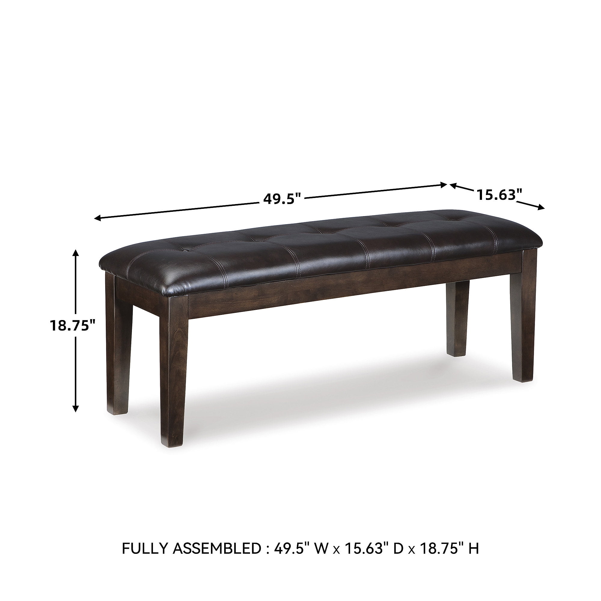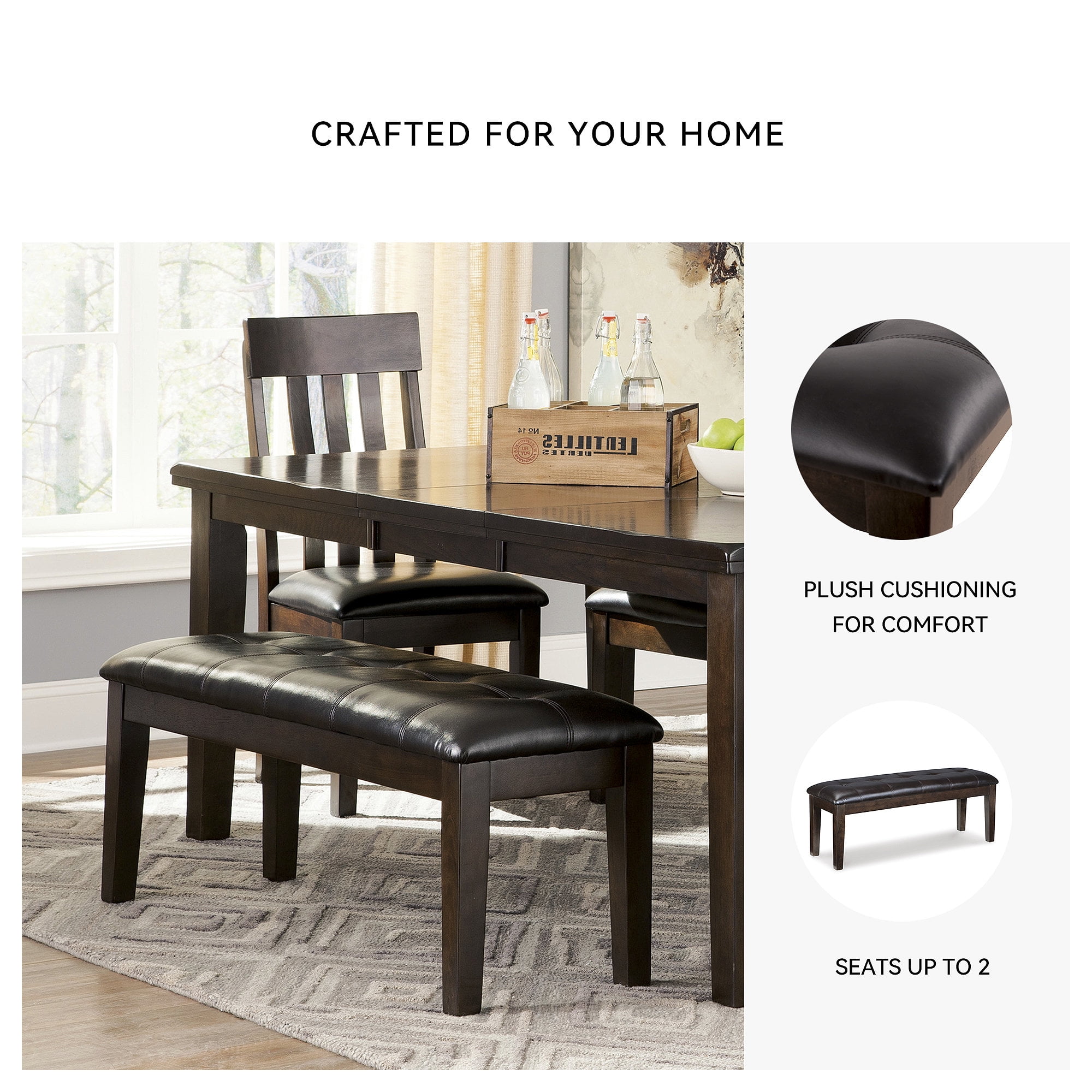Premium Faux Leather Upholstery: The bench is wrapped in stylish button-tufted faux leather, offering a luxurious look and easy maintenance. Comfortable Seating: Enjoy exceptional comfort with a cushioned seat, perfect for long meals and gatherings. Durable Wood Legs: Sturdy wood legs provide reliable support and a refined aesthetic. Versatile Design: Complements a variety of dining room styles and can easily be used in other areas of your home.