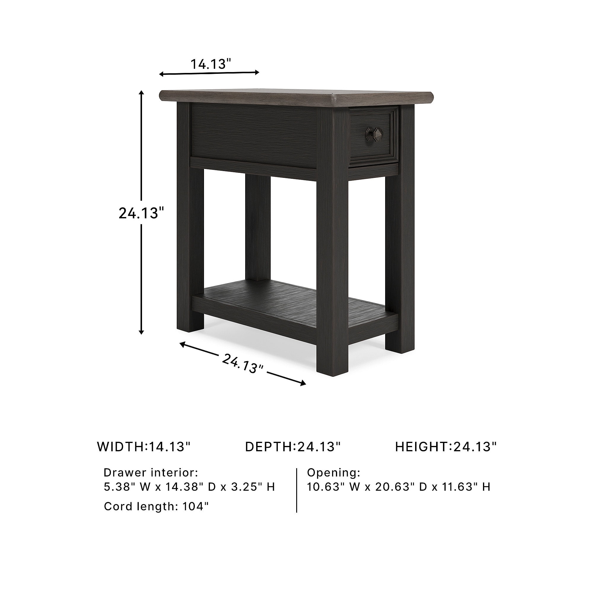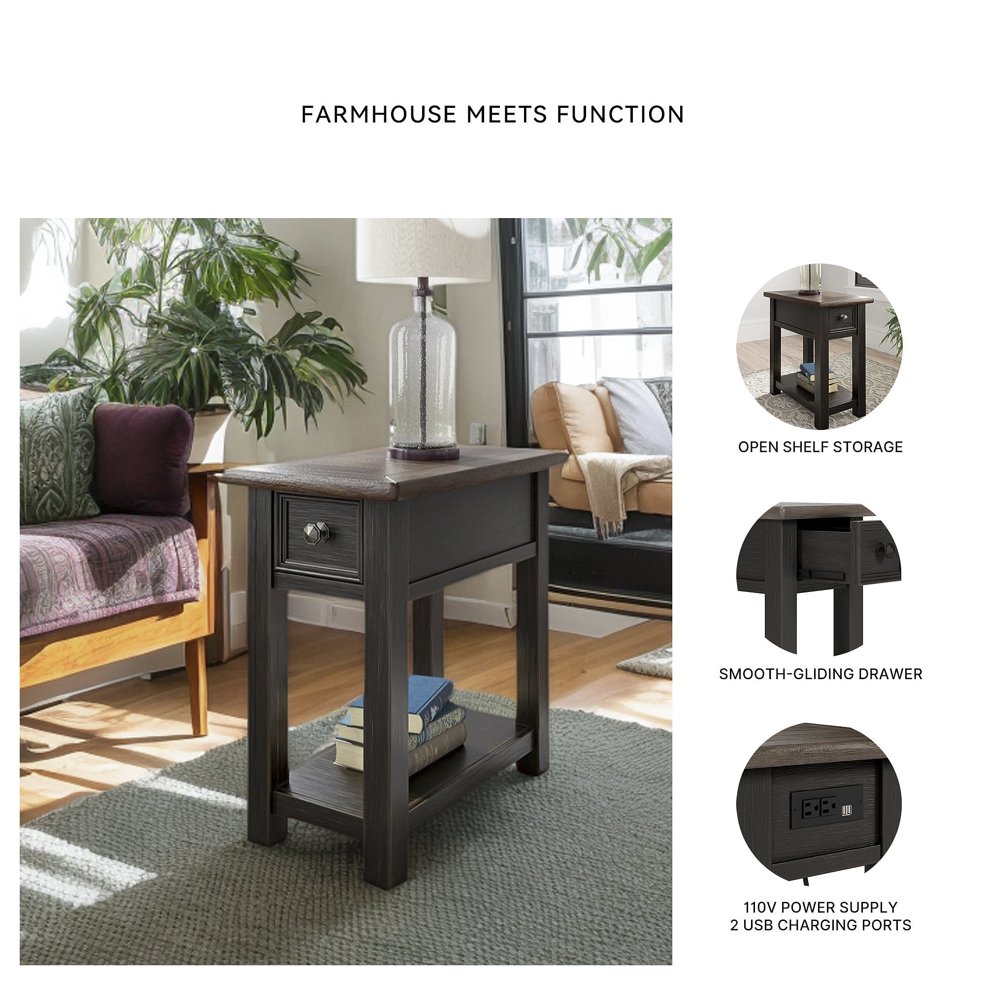 Made of wood, white oak veneers and engineered wood Weathered grayish brown top Textured wire brushed base in a black rub-through finish Chairside end table features plank-styled top Smooth-gliding drawer perfect for holding remotes and more