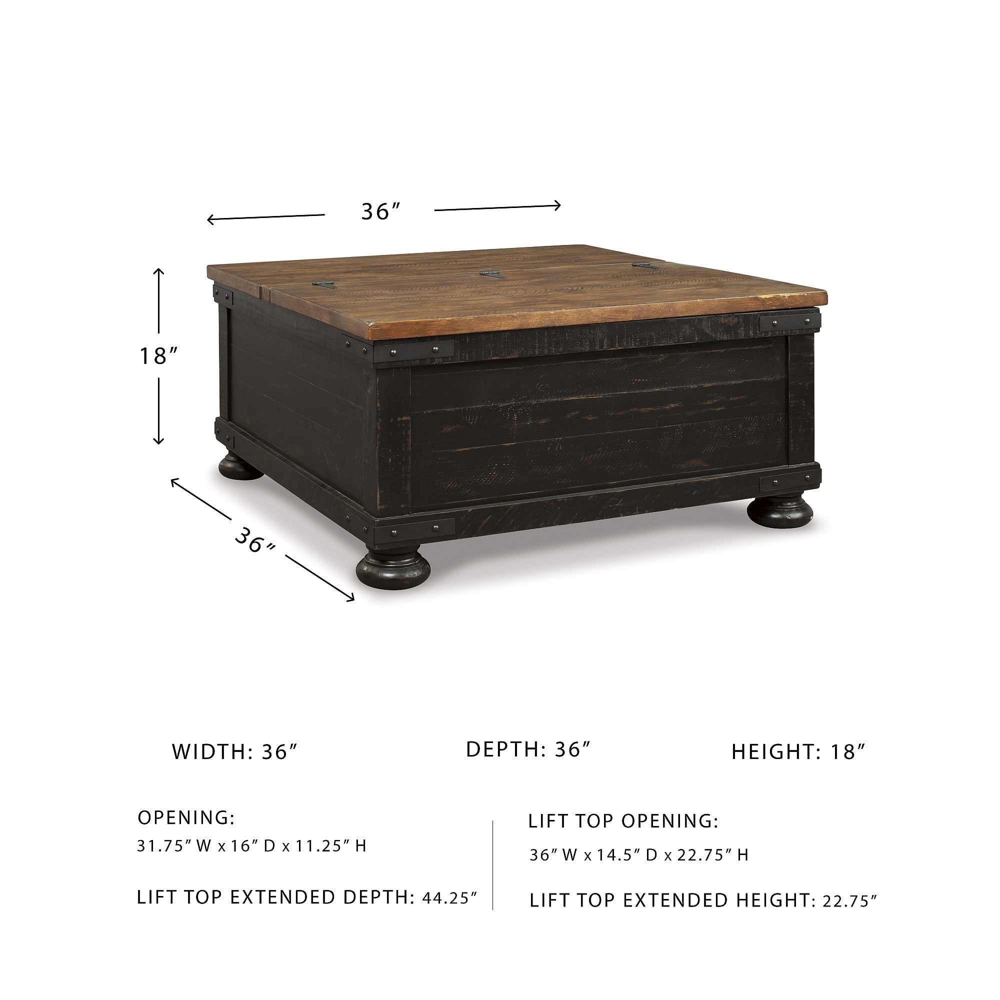 Made with pine veneers, pine wood and engineered wood Two-tone distressed finish (light brown top and rustic vintage black base) Split-top design (spring lift/hinge lift with stay arm) Metal bracket accents Assembly required