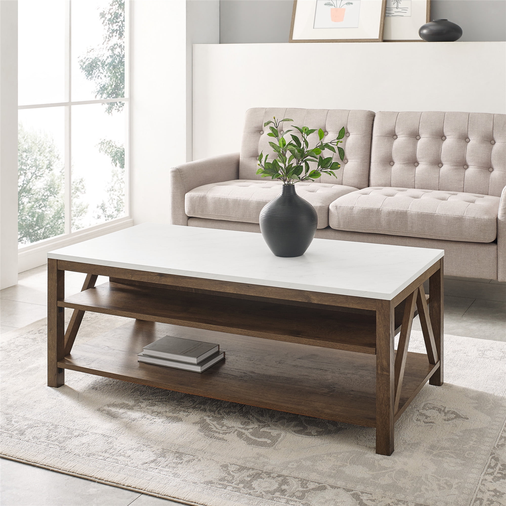 With its canted peg legs and low, linear profile, the Kisper coffee table is a mastery in mid-century minimalism. The look may be high-end gallery design, but the price is beautifully down to earth. Brushed dry brown finish is wonderfully easy on the eyes. Open shelving fuses form and function.