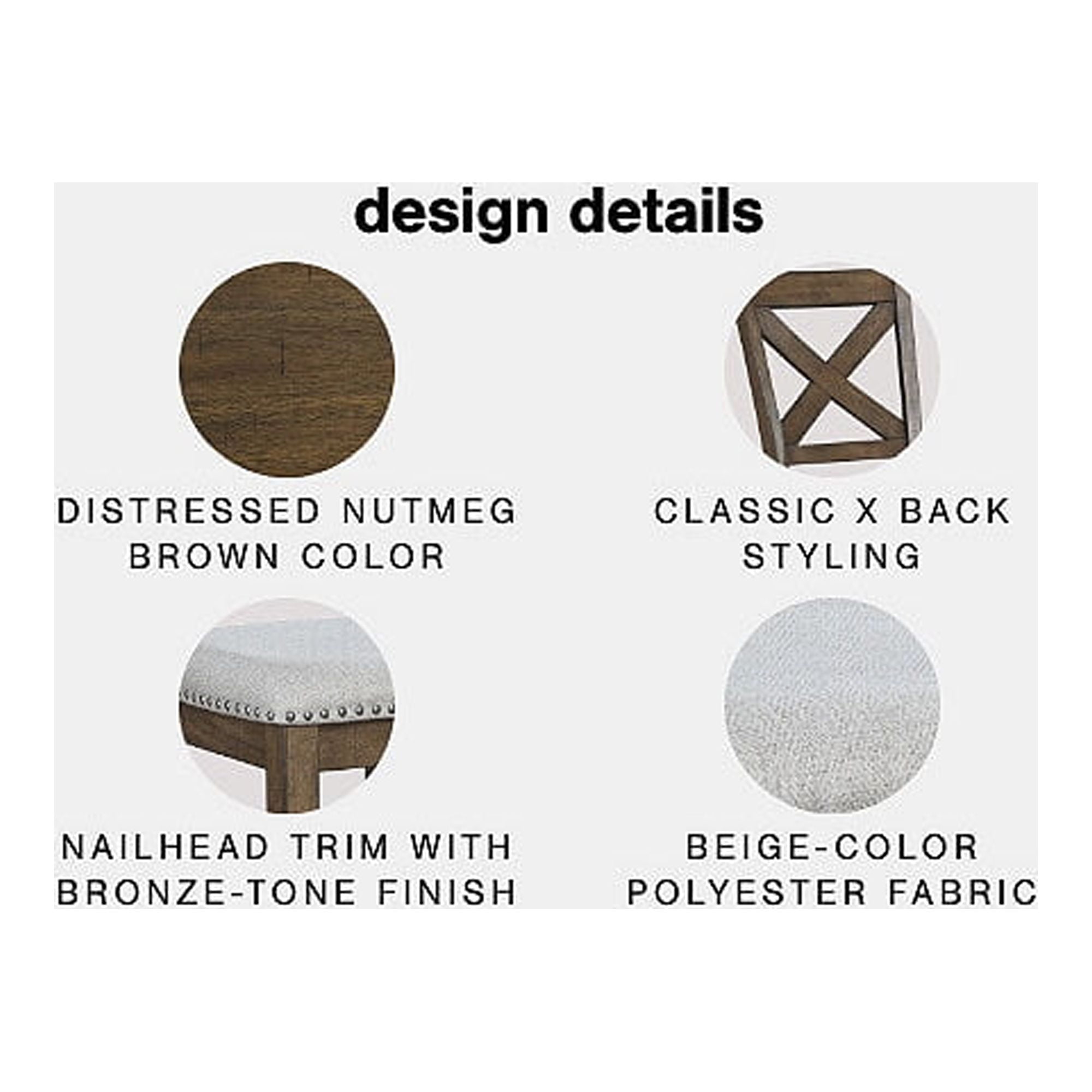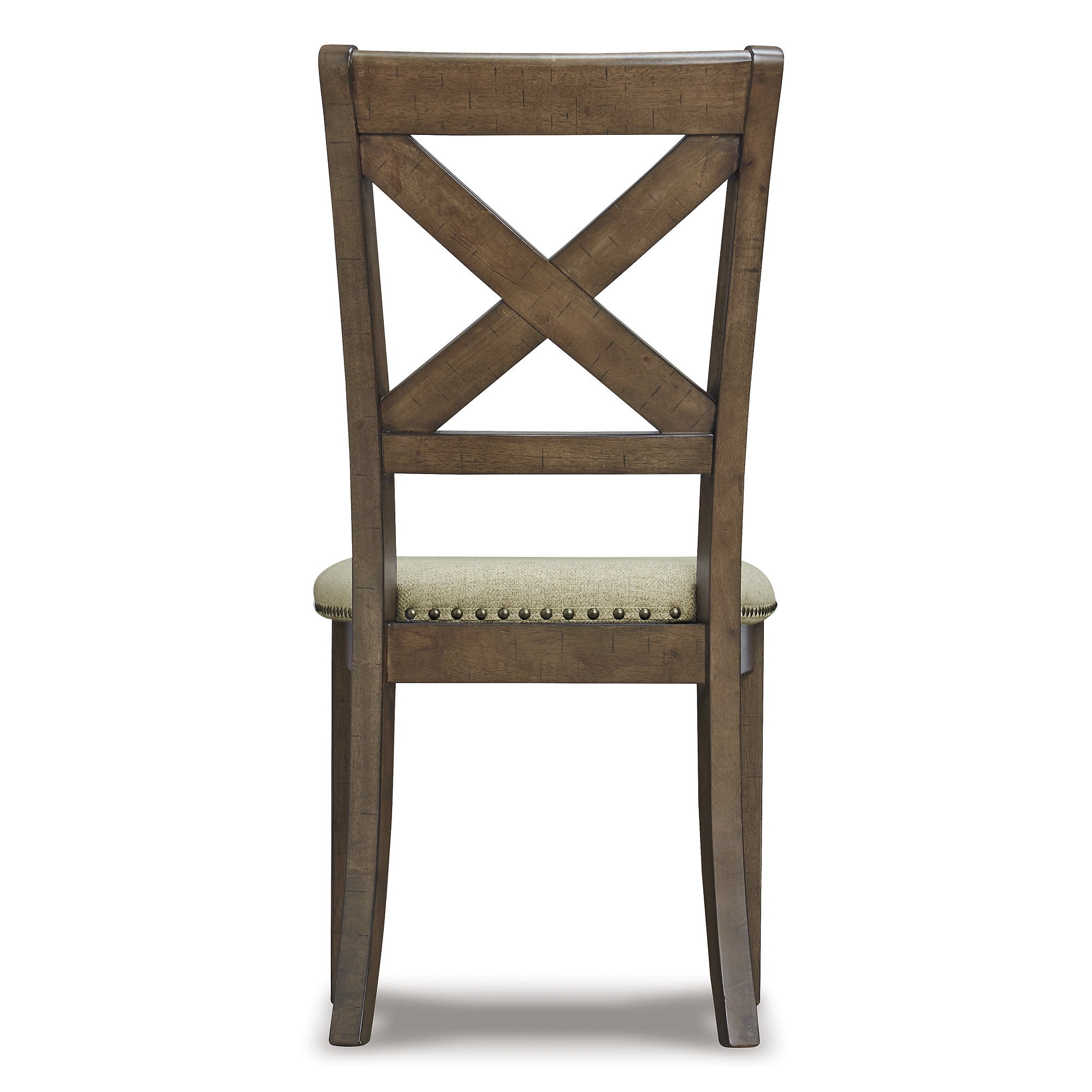 Moriville upholstered dining chair elevates the art of casual rustic style. With a distressed nutmeg finish, antiqued nailhead trim and textured polyester fabric, this upholstered dining chair with classic X back styling entices with warmth and earthy elegance. Cushioned seat accommodates lingering meals enjoyed in comfort.