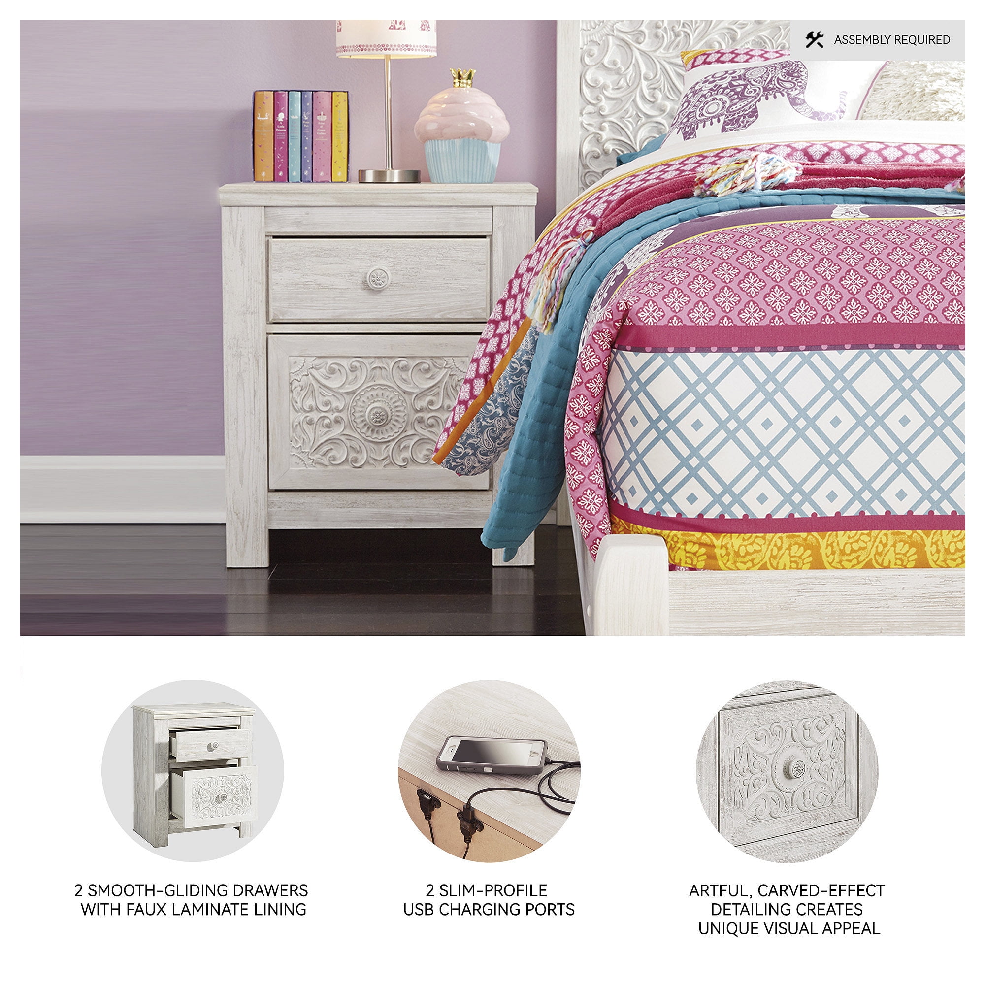 Made of engineered wood and decorative laminate Whitewash replicated worn through paint with authentic touch 2 smooth-gliding drawers with faux laminate lining 2 slim-profile USB charging ports Power cord included; UL Listed